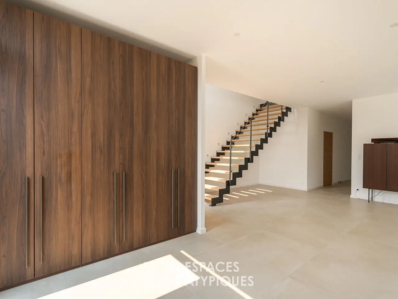 Exclusive to Espaces Atypiques Built on a plot of 1200 sqm, this exceptional contemporary villa of 311 sqm offers exceptional volumes and exceptional brightness, thanks to its modern architecture and its large openings to the outside. The ground floor opens onto an entrance with cupboards leading to a vast living room. A fitted and equipped kitchen, a pantry and a laundry room complete this functional space. The level also consists of a master suite with a fitted dressing room and bathroom with a double shower, an additional bedroom, an office space, and a toilet with a washbasin. The upper floor is dedicated to the sleeping area, with a family room and a corridor leading to two bedrooms. Each has access to a private terrace. A dressing room, a bathroom with bathtub and shower and a separate toilet complete this level. The aesthetic choices and high-end equipment give the whole a resolutely elegant atmosphere. Outside, the property offers an idyllic living environment. The vast tiled terrace harmoniously extends the interior spaces towards the garden, without any vis-a-vis. The invitation to relax continues with a 16-meter long heated swimming pool.A garage of over 100m2 that can accommodate four vehicles is an additional asset. The complex is located just a few minutes from schools and shops, facilitating daily life. This villa is a rare and unique property on the Vannes real estate market. Its unique characteristics, such as its wooden frame, its refined design, its large volumes and its high-end services, make it a favorite property.ENERGY CLASS: A / CLIMATE CLASS: A Estimated average amount of annual energy expenses for standard use, established from average energy prices indexed for the years 2021, 2022, 2023: between EUR770 and EUR1090/yearInformation on the risks to which this property is exposed is available on the Georisques website: www.georisques.gouv.fr Price including agency fees: 2,368,000 euros Contact: Anne-Cecile QUEMERAIS Telephone: 06 71 96 12 32 RSAC Vannes 834 522 773REF. 530EAMAdditional information* 7 rooms* 4 bedrooms* 1 bathroom* 1 bathroom* Outdoor space : 1200 SQMEnergy Performance CertificatePrimary energy consumptiona : 30 kWh/m2.yearHigh performance housing*30kWh/m2.year1*kg CO2/m2.yearA*B*C*D*E*F*GExtremely poor housing performance* Of which greenhouse gas emissionsa : 1 kg CO2/m2.yearLow CO2 emissions*1kg CO2/m2.yearA*B*C*D*E*F*GVery high CO2 emissionsEstimated average annual energy costs for standard use, indexed to specific years 2021, 2022, 2023 : between 770 € and 1090 € Subscription IncludedAgency feesThe fees include VAT and are payable by the vendorMediatorMediation Franchise-Consommateurswww.mediation-franchise.com29 Boulevard de Courcelles 75008 ParisInformation on the risks to which this property is exposed is available on the Geohazards website : www.georisques.gouv.fr
