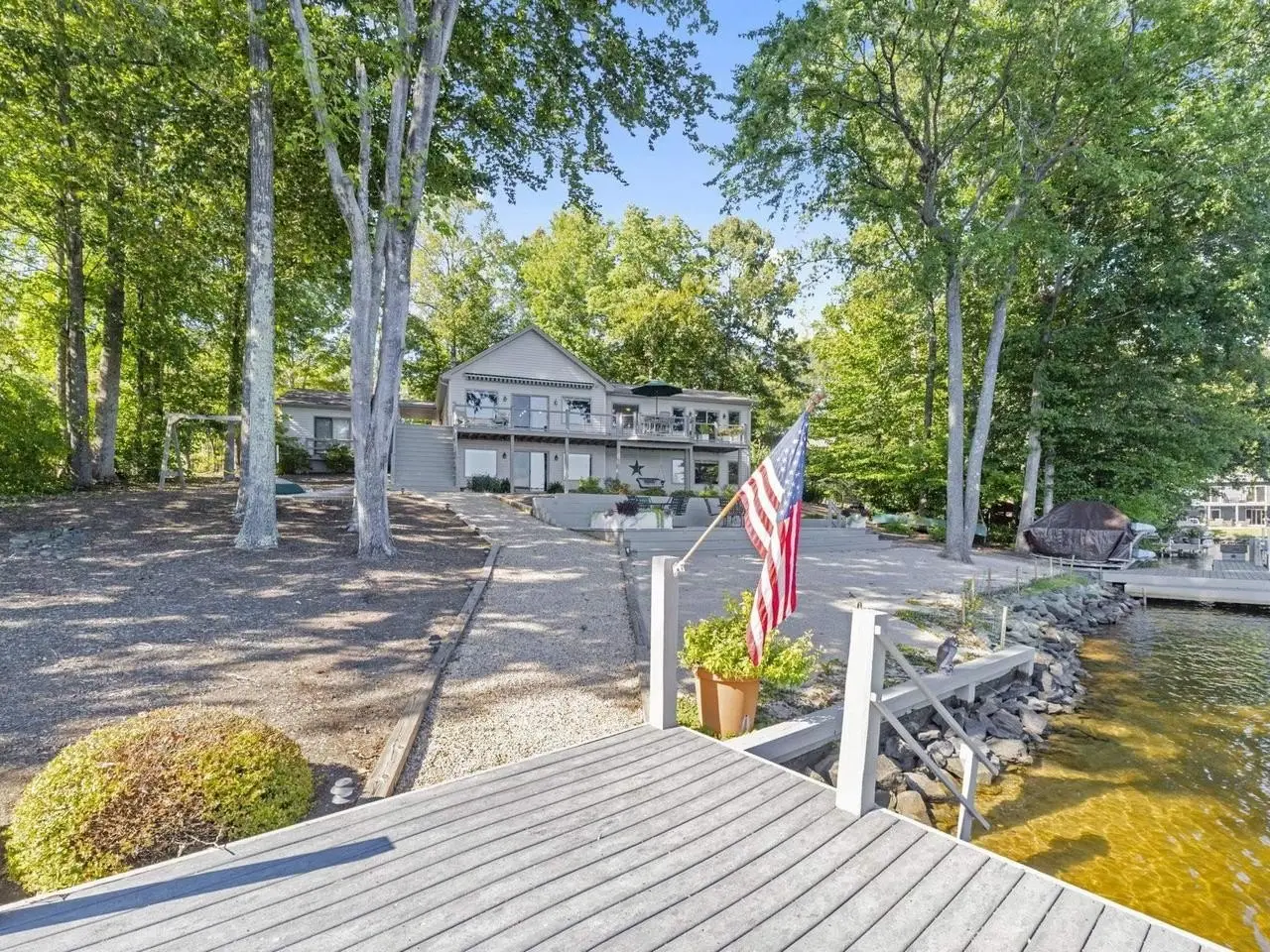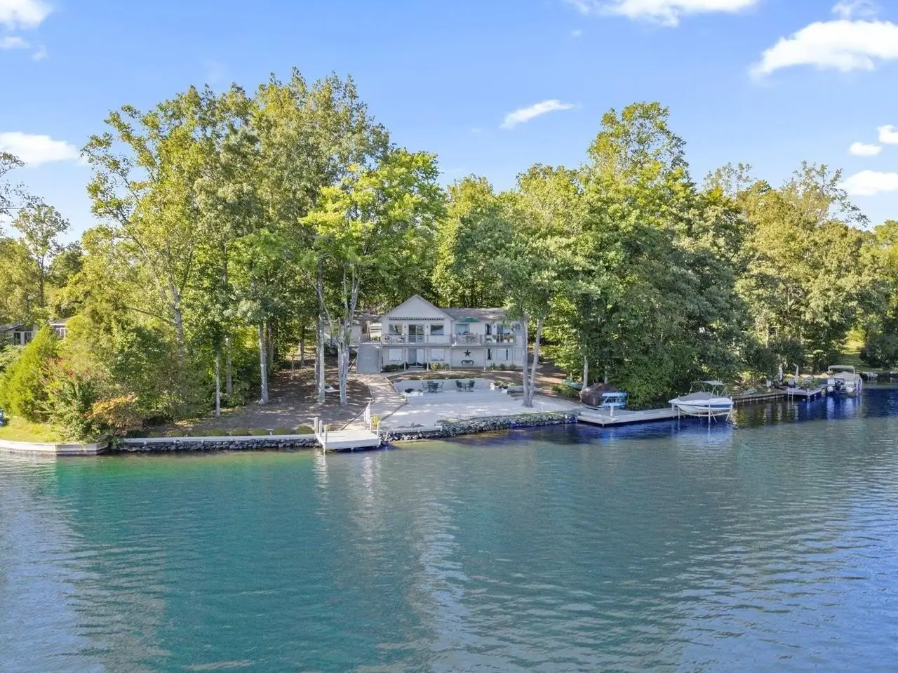 Exceptional lakefront living awaits with this beautifully remodeled and meticulously maintained residence, perfectly situated on 180 feet of pristine open water frontage. Designed for both elegance and enjoyment, the property offers breathtaking moonlit evenings from expansive outdoor living areas, including a spacious main deck, larger lower deck, and professionally landscaped grounds. The private waterfront features two docks, a boat lift, and a sandy beach ideal for recreation and gatherings. With its rare level lot, the walk to the water is effortless, enhancing both convenience and lifestyle. Inside, the home showcases thoughtful upgrades and tasteful finishes throughout, reflecting the highest standards of care and quality. Its prime location provides quick access to the main gate, clubhouse, beach, and playground?offering both privacy and proximity to community amenities. This distinguished property combines prestige, comfort, and unrivaled access to Lake Monticello?s most coveted open water setting.,Granite Counter,Fireplace in Great Room