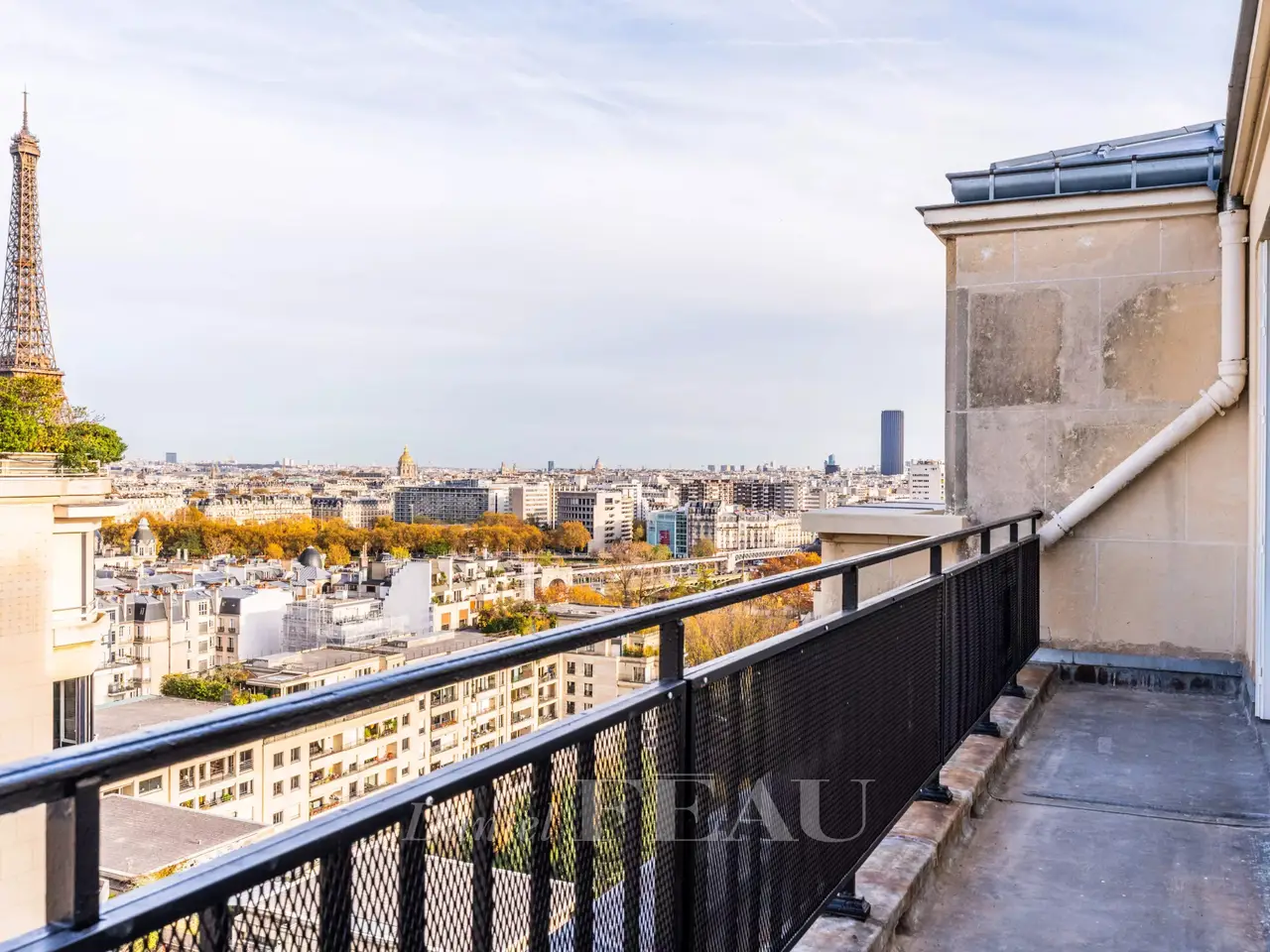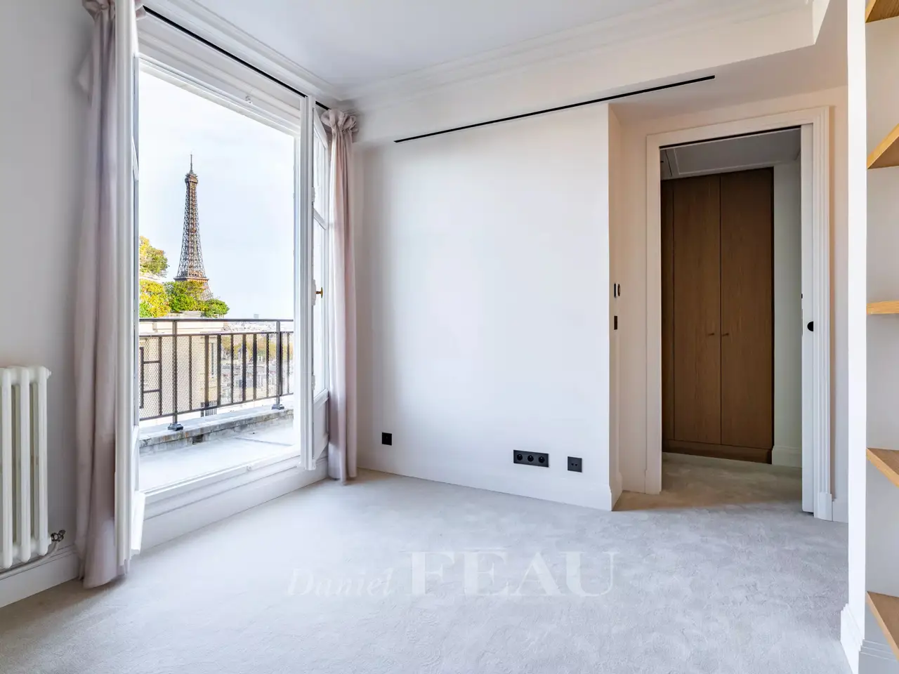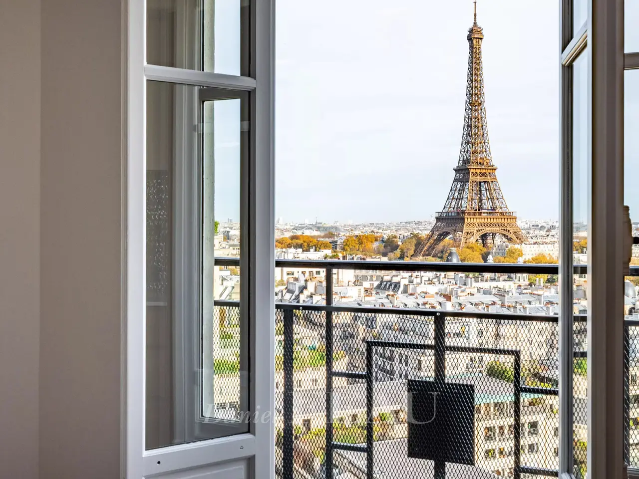 This exceptional apartment on the 7th and top floor of a luxurious Art Deco building with a lift commands a picture-postcard view of the Eiffel Tower. Renovated throughout and opening onto balconies, it includes a bright living/reception room with a fitted and equipped open-plan kitchen, a master suite with a dressing room; a shower room and a wc, two bedrooms (one with a bathroom and wc), and a separate wc. Air conditioning. A cellar may be acquired at extra cost. The co-ownership benefits from a conciergerie and a fitness room, as well as a guest bedroom available for rental.