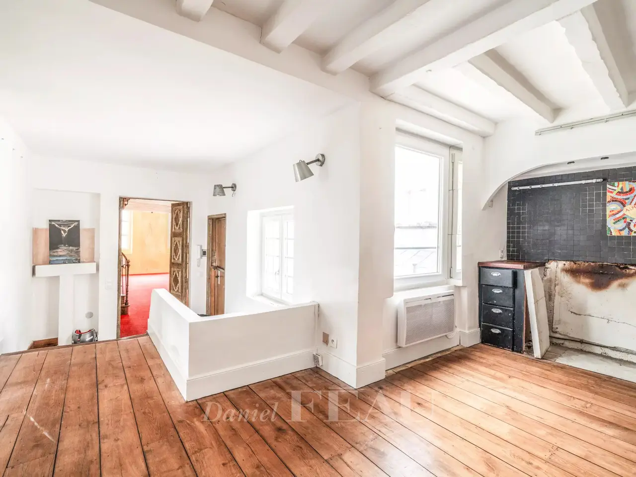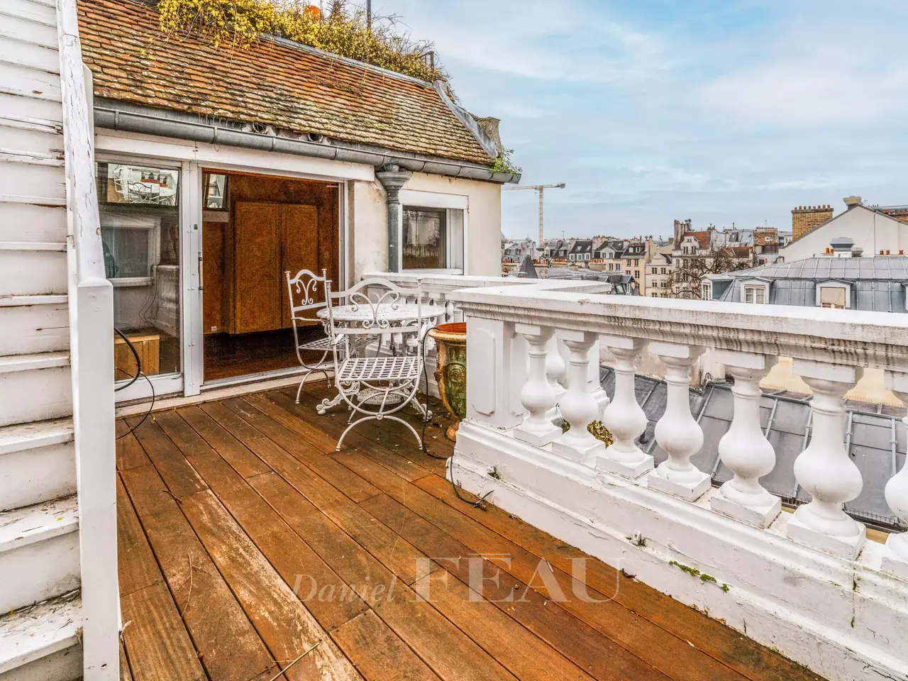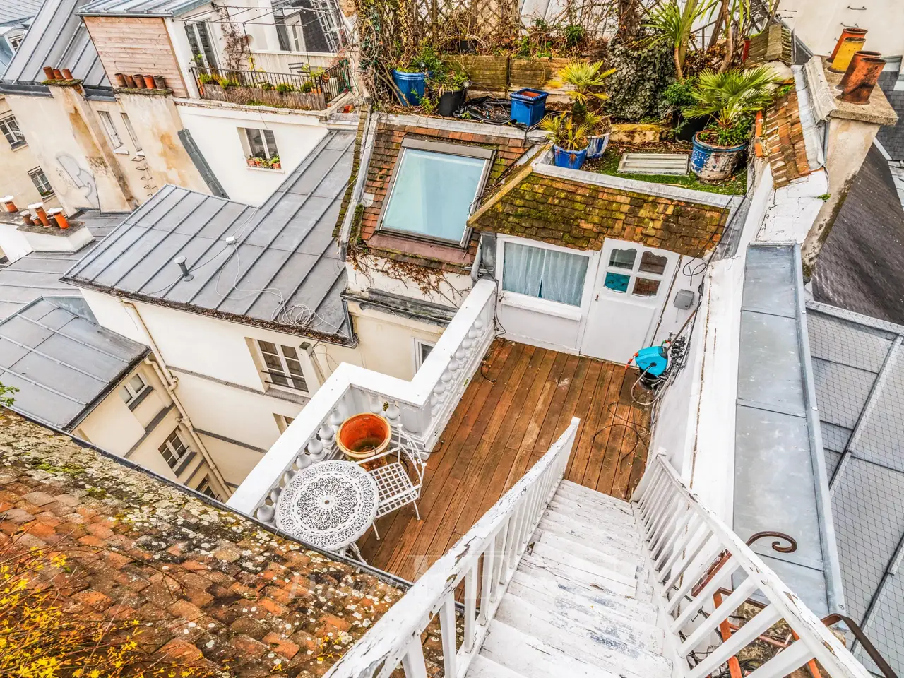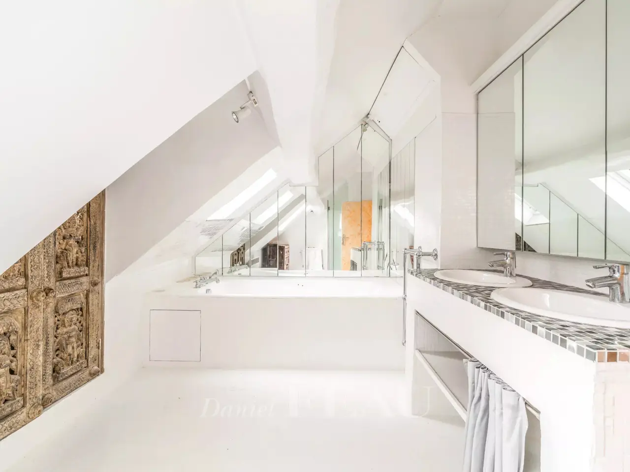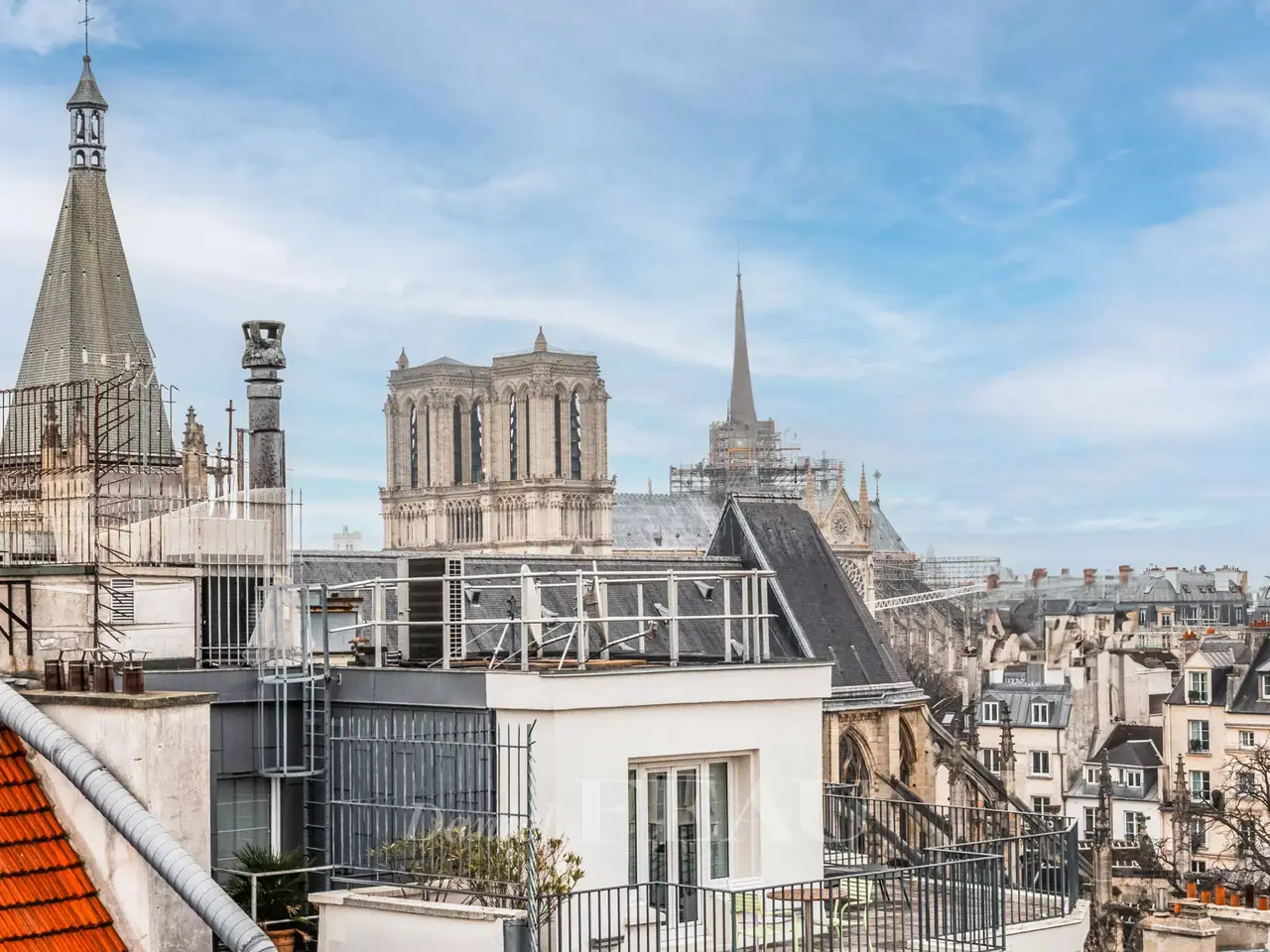 Between Notre Dame Cathedral and the Panthéon. This atypical apartment offering 118 sqm of bright and peaceful floor space and 108 sqm of living space as defined by the Carrez Law is on the 4th and top floor of a late 19th century building with a lift. Enjoying an open view over the rooftops, it includes a spacious living/reception room, a kitchen with dining facilities, a bedroom with a shower room, and a separate wc. Upstairs are two rooms including a master suite with a bathroom, both of which open onto a sunny terrace. A roof terrace commanding a panoramic view of the capital’s iconic landmarks is on the top floor. Henri IV catchment area.