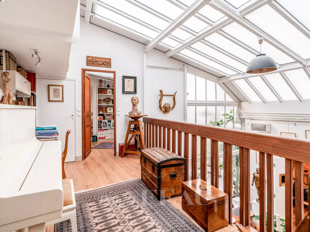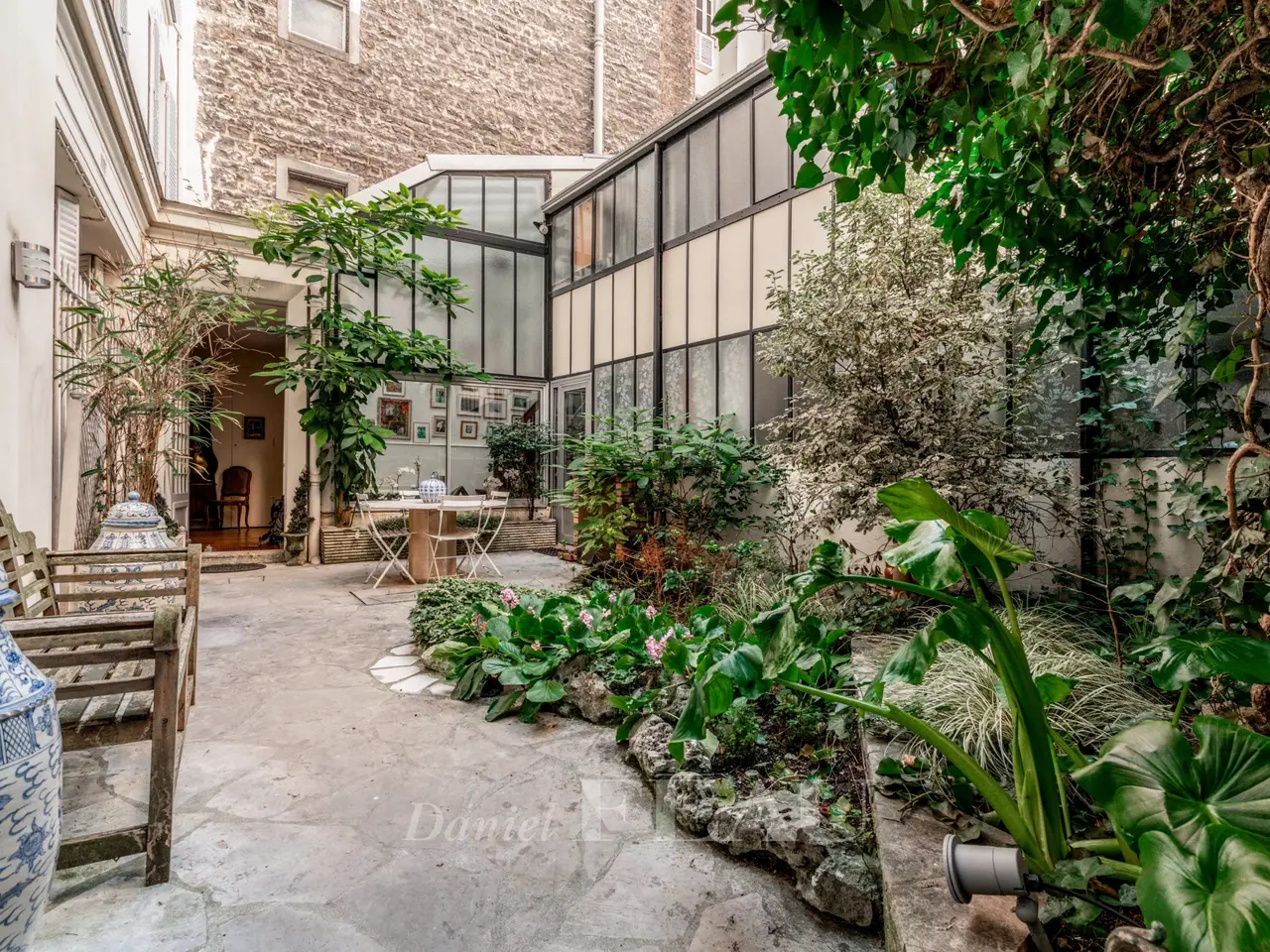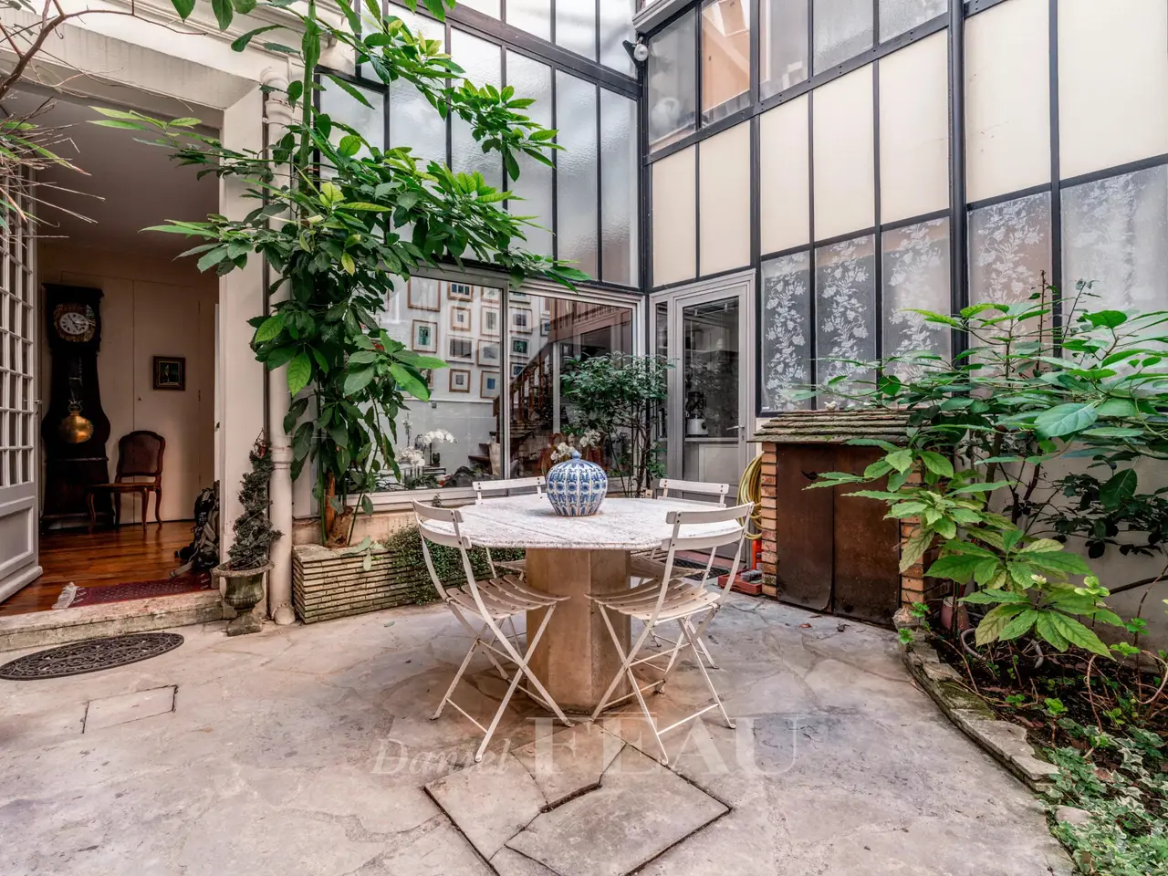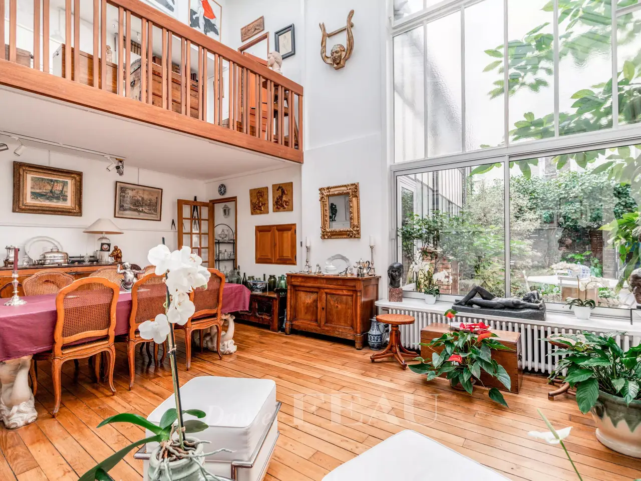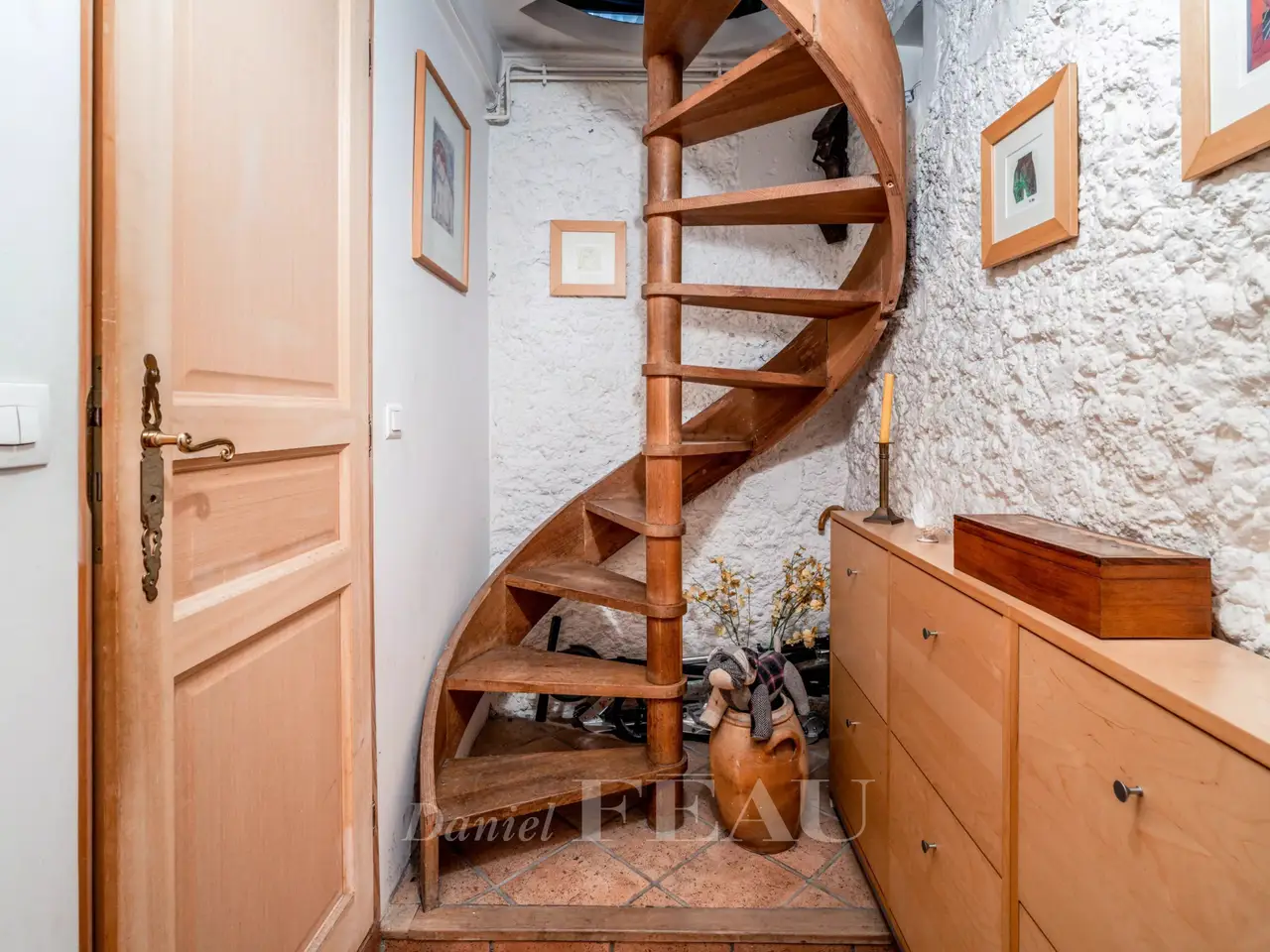 This former artist’s studio is on the garden level and ground floor of a fine late 19th century building set at the bottom of a courtyard located a stone’s throw from Luxembourg Gardens. With the feel of a bright and peaceful private house and benefiting from exclusive use of a 60 sqm courtyard, it offers 160 sqm of floor space and 134.50 sqm of living space as defined by the Carrez Law including a drawing room, an extensively glazed living/reception room featuring a soaring ceiling, a kitchen, four bedrooms (one benefiting from independent access and with a kitchenette, a shower room and a wc), and a bathroom with a wc. The basement comprises a utility room, a bathroom and a wc. A lock-up garage and a parking space may also be acquired 50.000 euros.