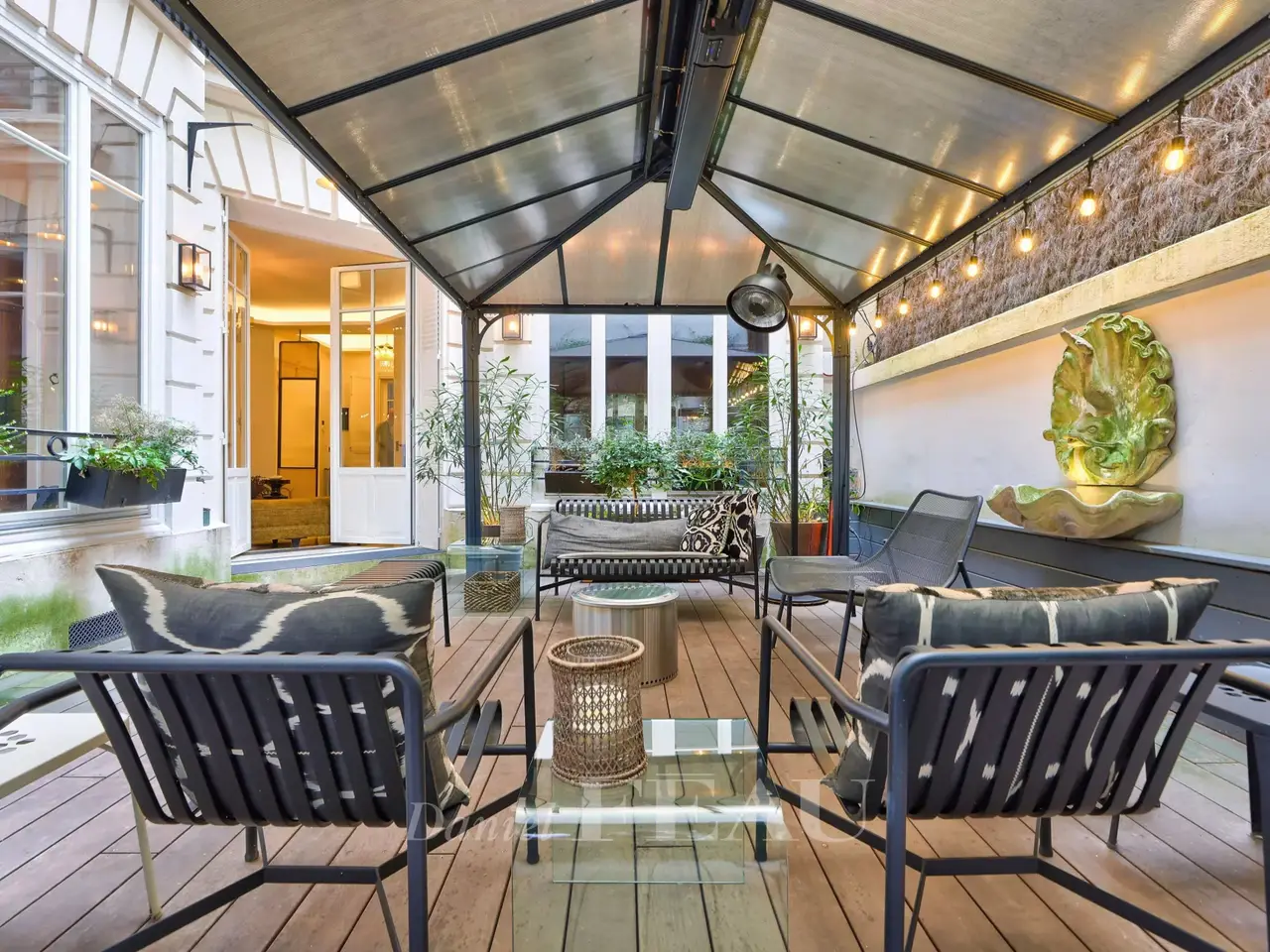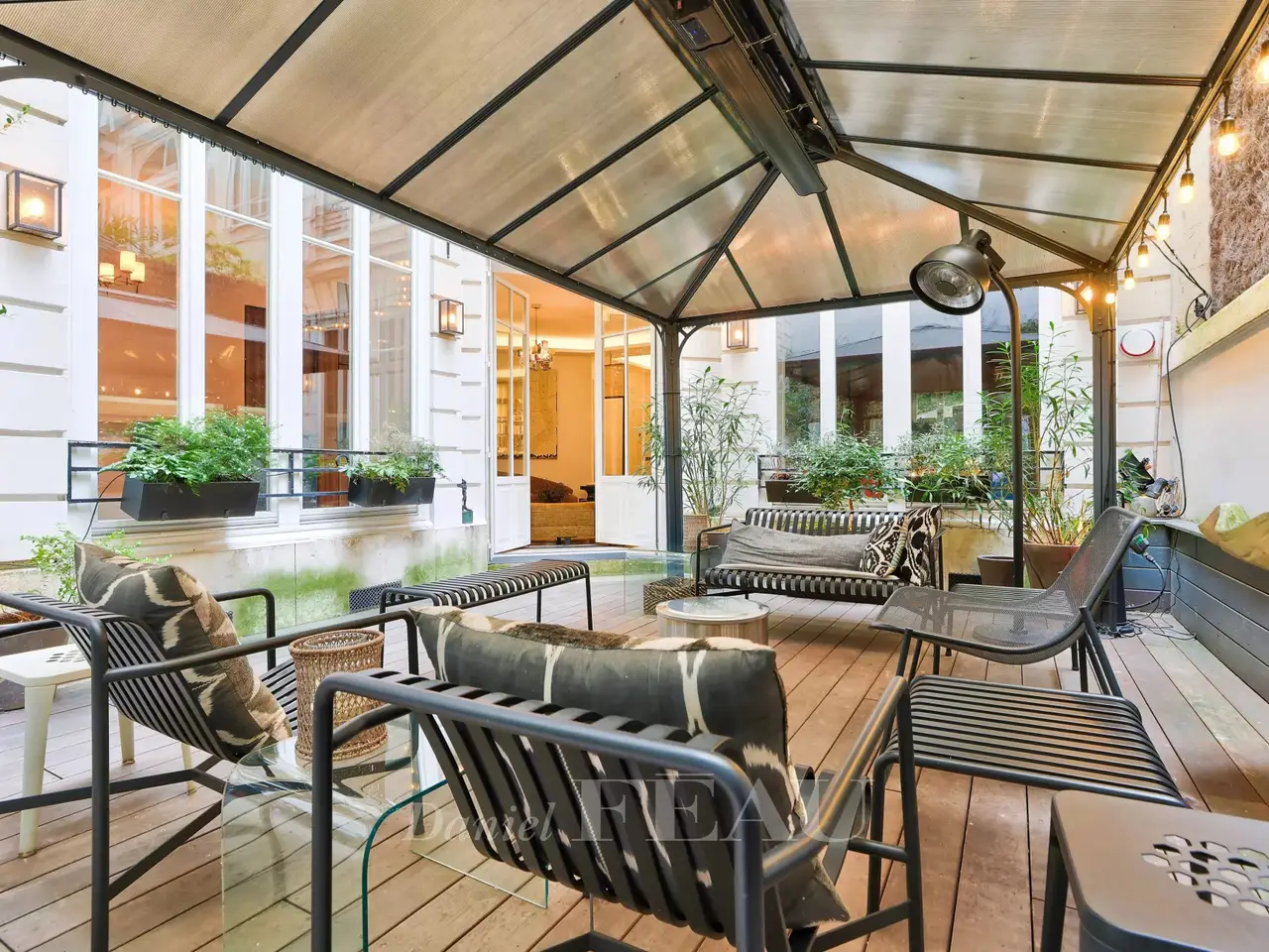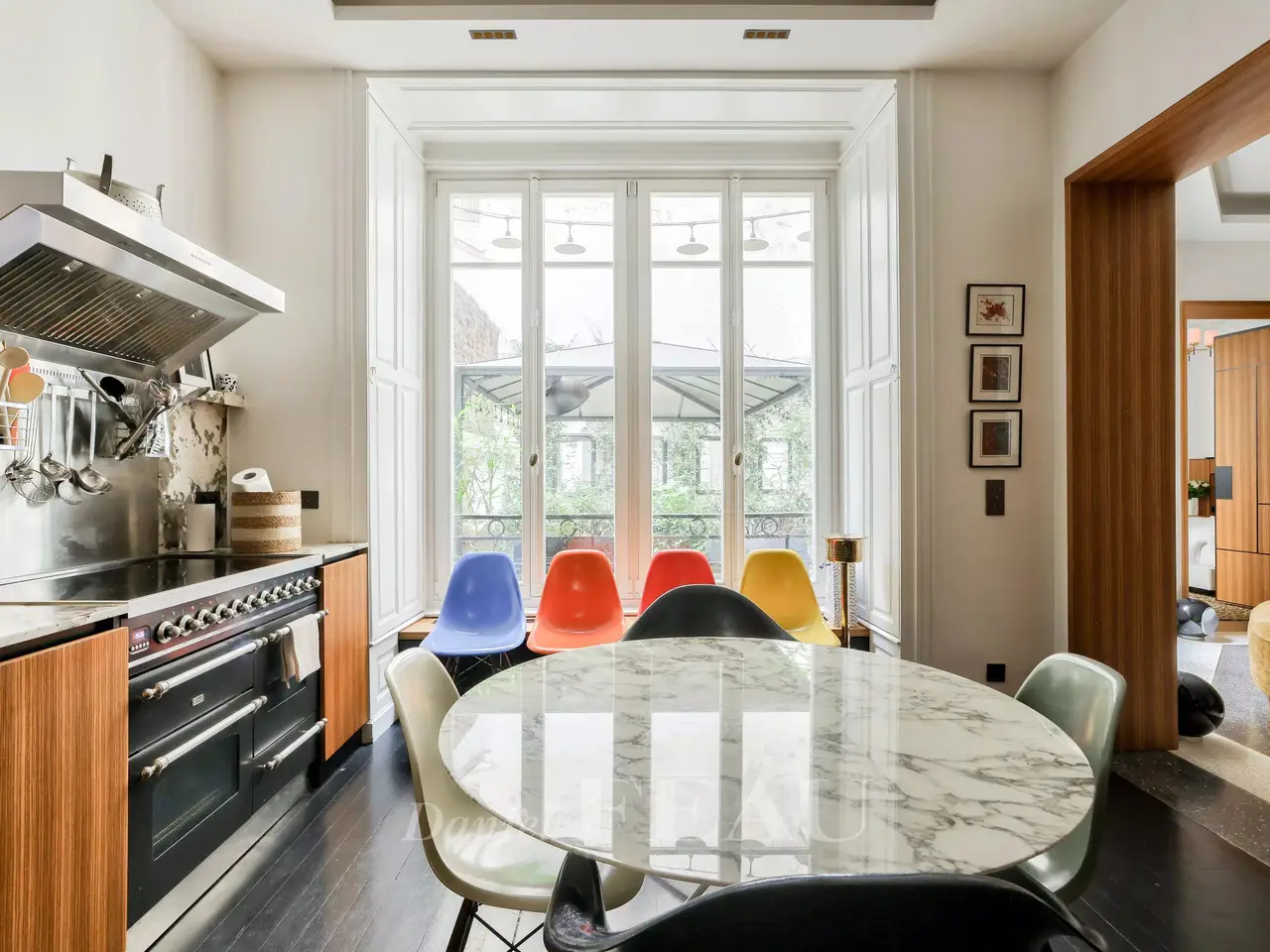 Europe neighbourhood. This refined 154 sqm apartment is on the garden level of a luxurious late 19th century freestone building located in a leafy pedestrian street. A star-shaped entrance hall leads to a magnificent rotunda living/reception room featuring 3.90 metre high ceilings and a fireplace, a luxuriously equipped kitchen with dining facilities, two spacious bedrooms each with a shower room and wc, a master suite with a study, two dressing rooms and a bathroom opening onto a little patio, a utility room and a guest wc. The apartment has been meticulously renovated and tastefully decorated by an interior decorator. In a peaceful location a short distance from the lively 9th District, the Batignolles neighbourhood, the shops and leafy Parc Monceau.