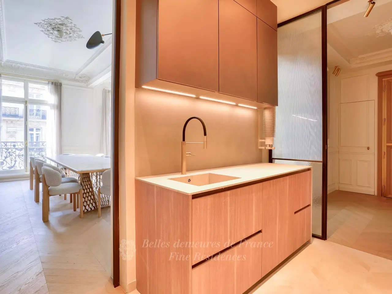 Avenue Georges V-Golden Triangle. Located on the 3rd floor of a freestone building, this beautifully renovated three bedroom apartment of 160 square meters is composed of an entrance gallery opening into a big reception, American kitchen, a dirty kitchen, a dining room, one master suite with its bathroom as well as two other bedrooms with one bathroom. High ceiling, domotic, air conditioning as well as a cellar for this south facing apartment renovated with exclusive materials.
