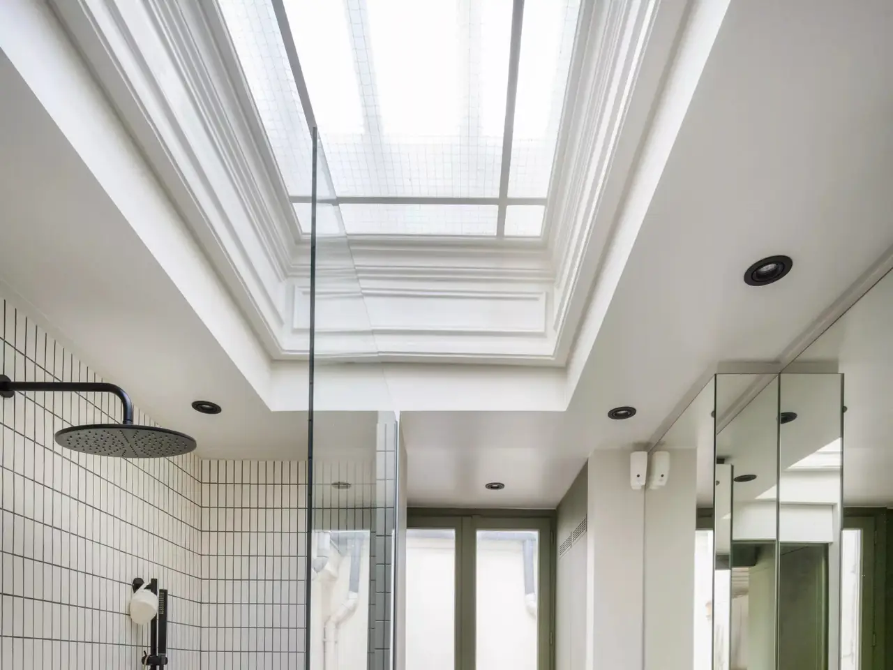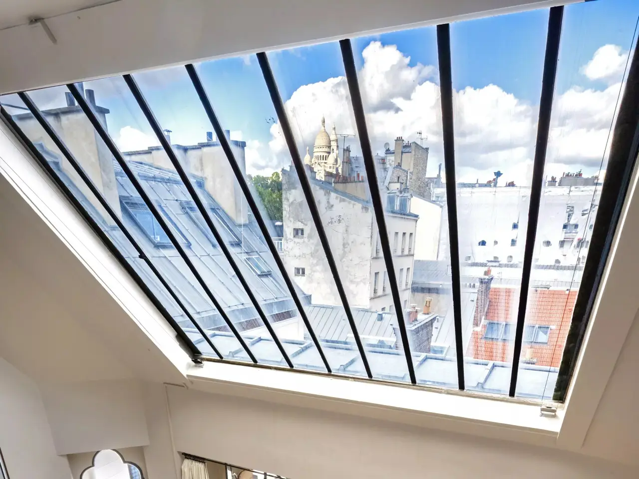 Trudaine neighbourhood. This tastefully renovated and beautifully appointed former artist’s studio is on the 3rd and top floor of a fine mid 19th century building. It includes a spacious living/reception room featuring high ceilings with a large skylight, an open-plan kitchen, a mezzanine bedroom enjoying a view of Sacre Coeur Basilica, and a shower room. The building benefits from a shared garden.