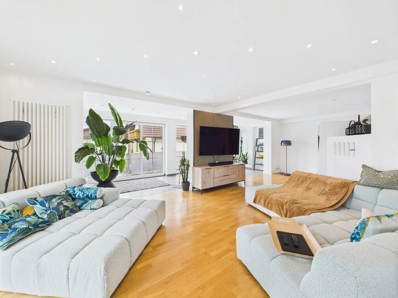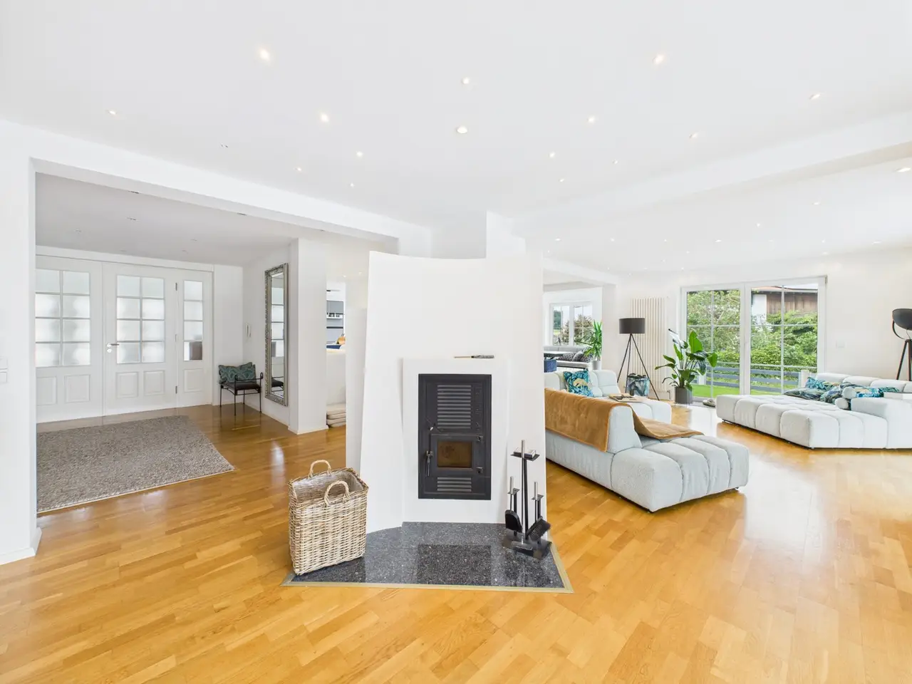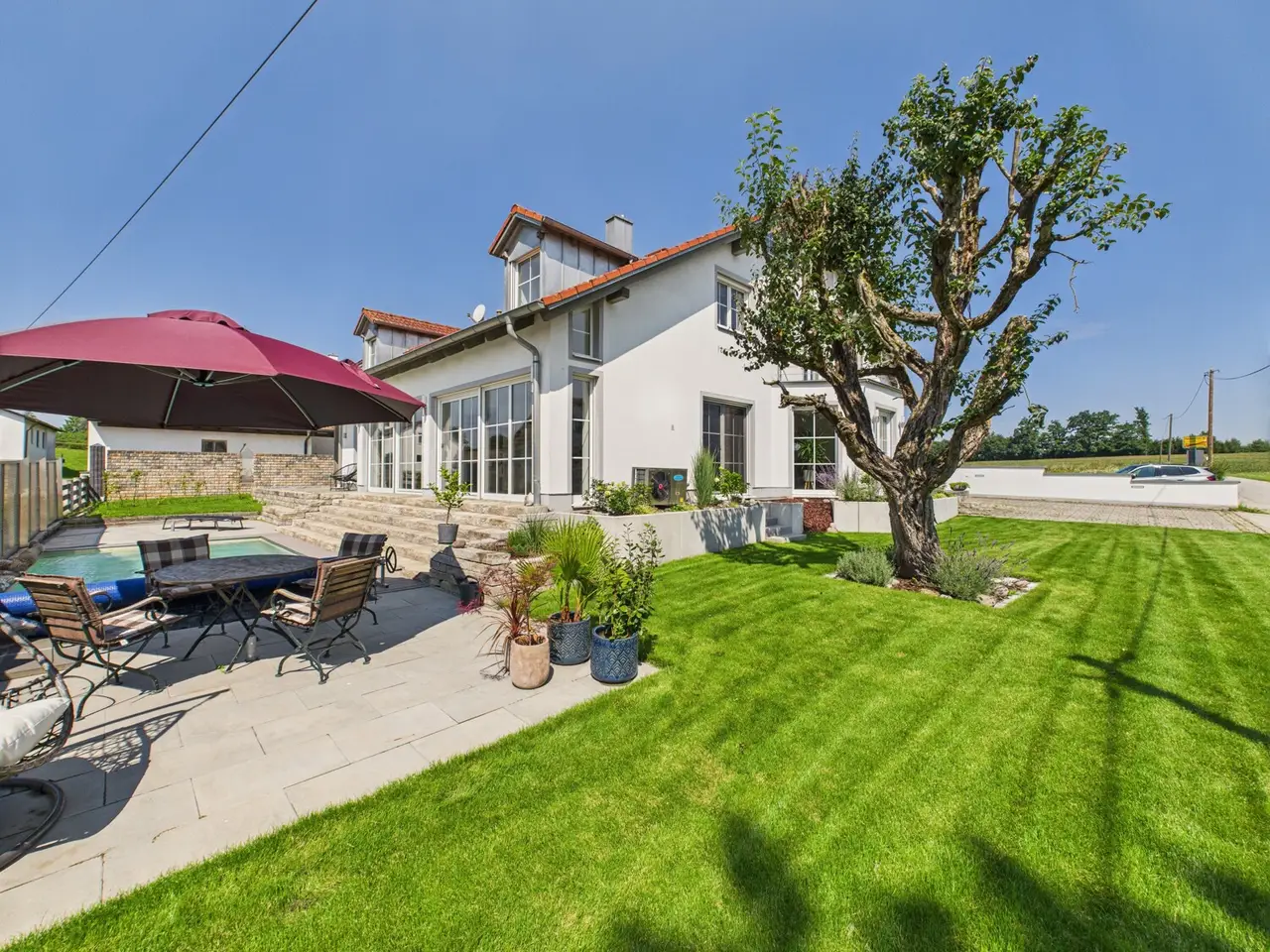 Spacious detached or semi-detached house with wellness area, pool and a variety of uses - close to Landshut in a quiet location in Oberdessing This property, built from scratch in 2001, impresses with its spaciousness, well-kept condition and upscale furnishings. A living space of approx. 350 m² is spread over three floors - currently used as a two-family house, with a declaration of division already in place. With little effort, the house can also be ideally designed as a spacious single-family home. On the first floor, you are greeted by an impressive living/dining area with fireplace and open kitchen concept. The modern fitted kitchen, high-quality materials such as parquet flooring and tiles, as well as the light-flooded architecture give the living space an almost loft-like ambience. There is a real highlight in the basement: a spacious fitness and wellness area with panoramic sauna, shower and relaxation zone - ideal for hobbies, home office or practice use. The second residential unit is fully self-contained and could be rented out as an investment or sold separately if required. The house is also perfect as a multi-generational solution. The approx. 850 m² plot offers a beautifully landscaped garden with pool, spacious driveway, several terraces as well as two garages and four parking spaces. The rural location combines tranquillity with ideal proximity to the city - you can reach the Landshut city limits in just a few minutes. A house with many options: whether as a spacious family home, a capital investment or living and working under one roof - many things are possible here.
