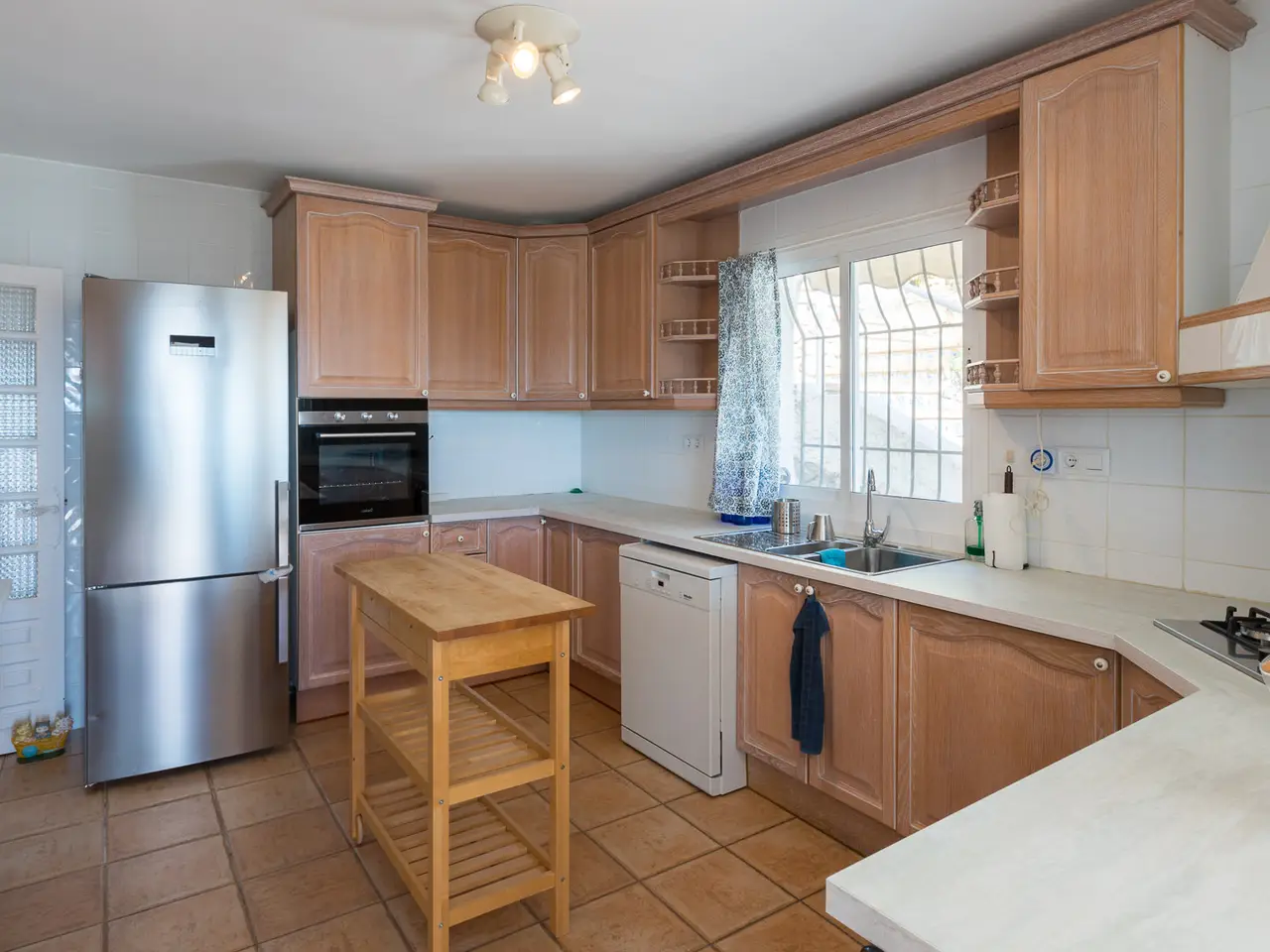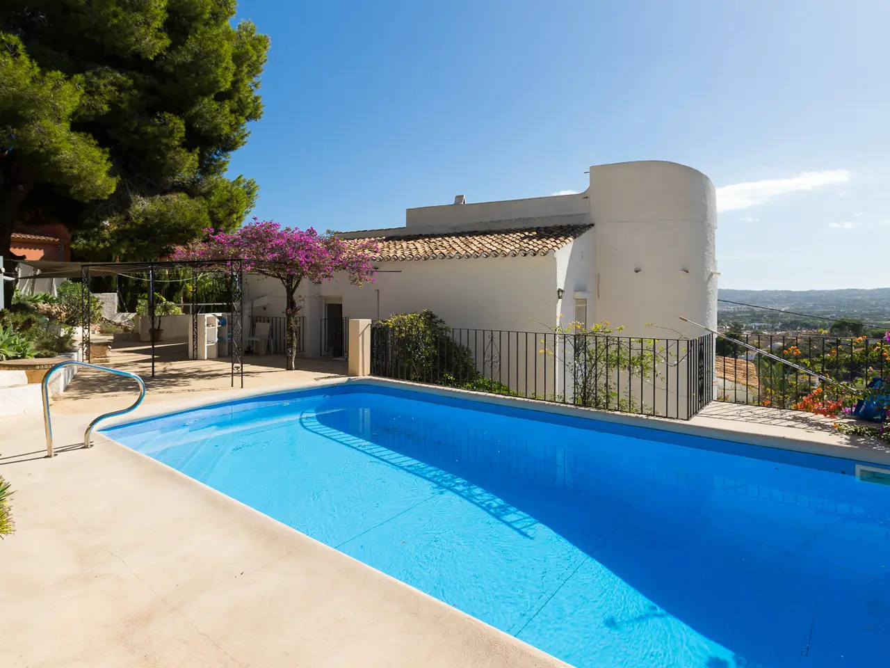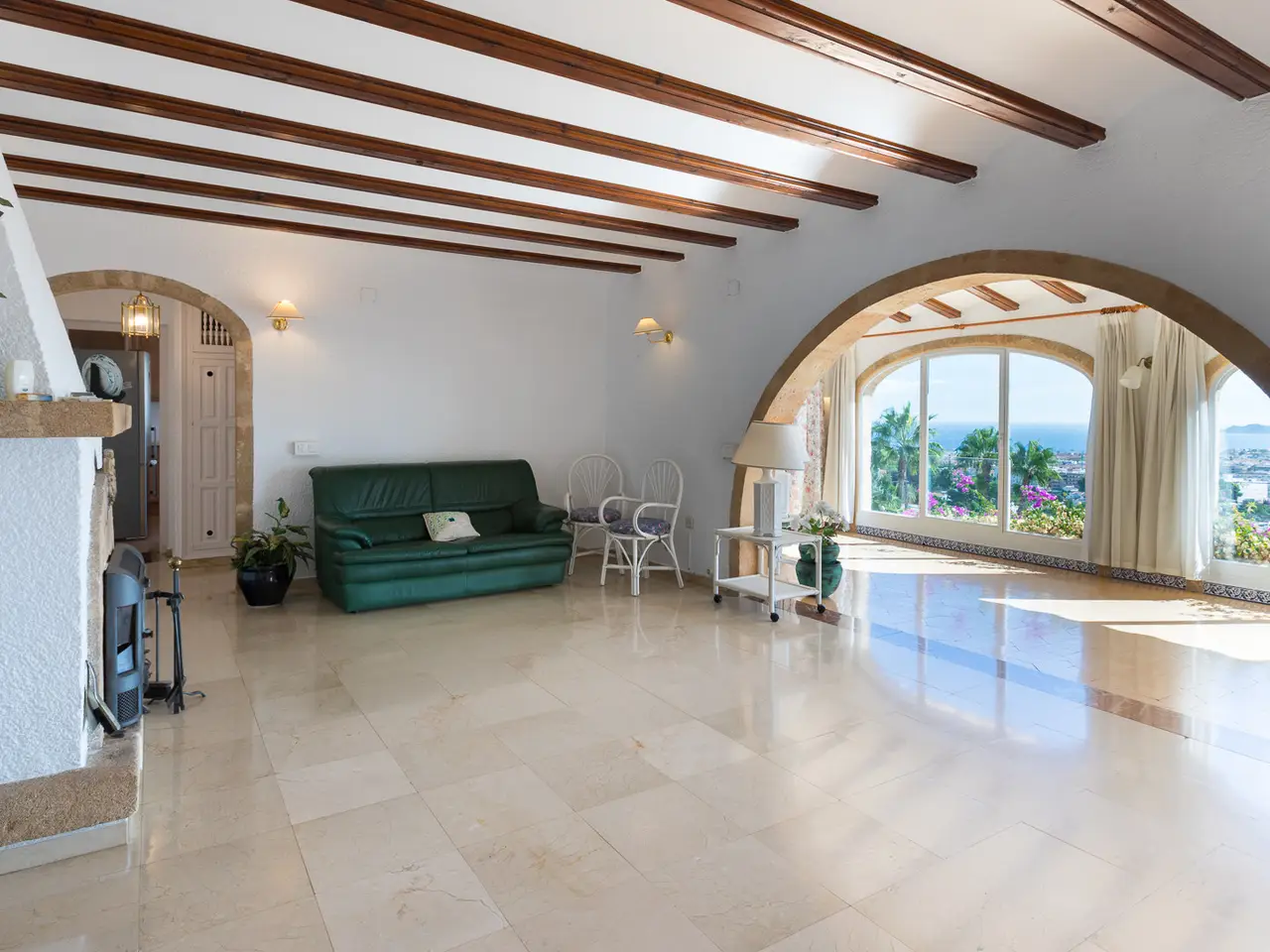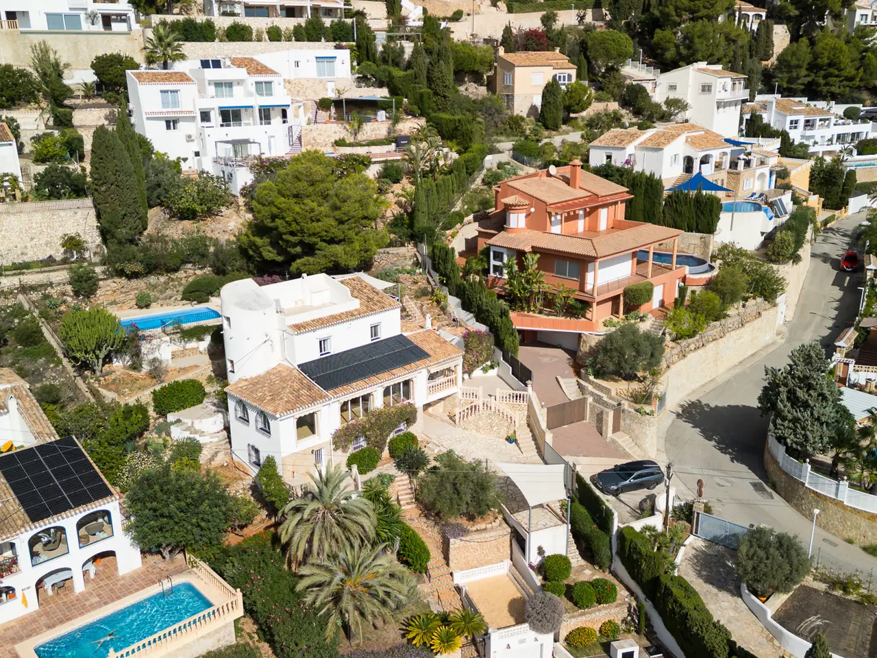 Villa located in the Puchol area with stunning views of Jávea Bay and the town. The main house comprises a south-facing glazed naya with fantastic sea views, a spacious lounge with air conditioning and a fireplace, a dining room and a large room ideal for use as an office or bedroom, a fitted kitchen with access to an open terrace, 1 bathroom with shower and a storage room with a small wine cellar. The first floor is used as a relaxation area, with 3 double bedrooms with fitted wardrobes, 1 full bathroom and a laundry room. This floor leads to the 8x4 swimming pool as well as to the roof terrace. In the semi-basement there is a guest apartment, consisting of a bedroom, a bathroom with shower, a living room with an open-plan kitchen that gives access to a terrace with sea views. It has a closed garage. The property has marble floors, motorised shutters, solar panels with batteries and awnings. An ideal property for living in a quiet environment close to the centre of Jávea.
