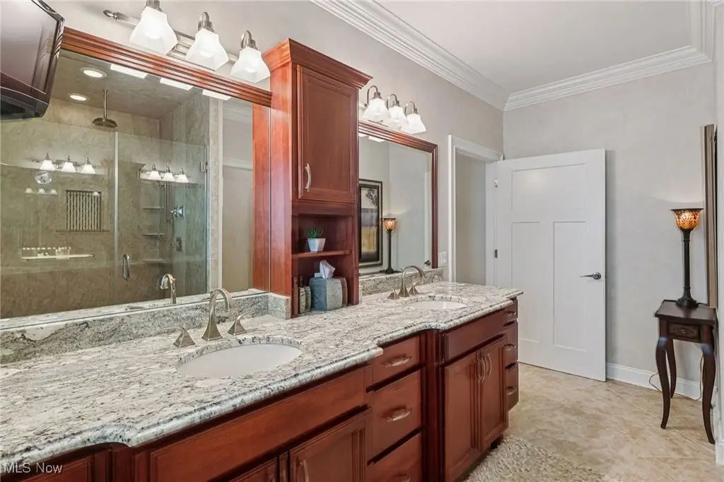 This exceptional one-owner residence was custom designed and masterfully built by Perrino Custom Homes, offering a perfect blend of elegance, comfort, and functionality. The open floor plan is ideal for both entertaining and everyday living.The spectacular two-story great room features an impressive wall of windows, a dramatic fireplace, stunning beamed ceiling, and rich hardwood floors. The space flows seamlessly into the gourmet eat-in kitchen - a chef's dream with a large center island, granite countertops, and premium stainless-steel appliances. Just off the kitchen, enjoy a beautiful enclosed three-season room and an adjoining stone patio, perfect for outdoor dining and grilling.The luxurious first-floor owner's suite includes a spacious walk-in closet and a spa-like shower with a heated floor and designer finishes. A private den/library with a vaulted tray ceiling and custom built-ins offers the perfect work-from-home retreat.Upstairs, a generous loft overlooks the great room and provides additional living space, while two large bedrooms boast large closets and additional walk-in closet and share a beautifully appointed full bath.The lower level offers ample storage and the potential for future recreation or fitness space. Additional highlights include a first-floor laundry/mudroom, hardwood flooring throughout most of the main level, and professionally selected decor throughout.Set on a private, beautifully landscaped lot ideal for gardening and summer entertaining, this home exemplifies quality and craftsmanship. Sterling Lakes is a sought-after gated community featuring lush green spaces, sidewalks, and a serene setting.