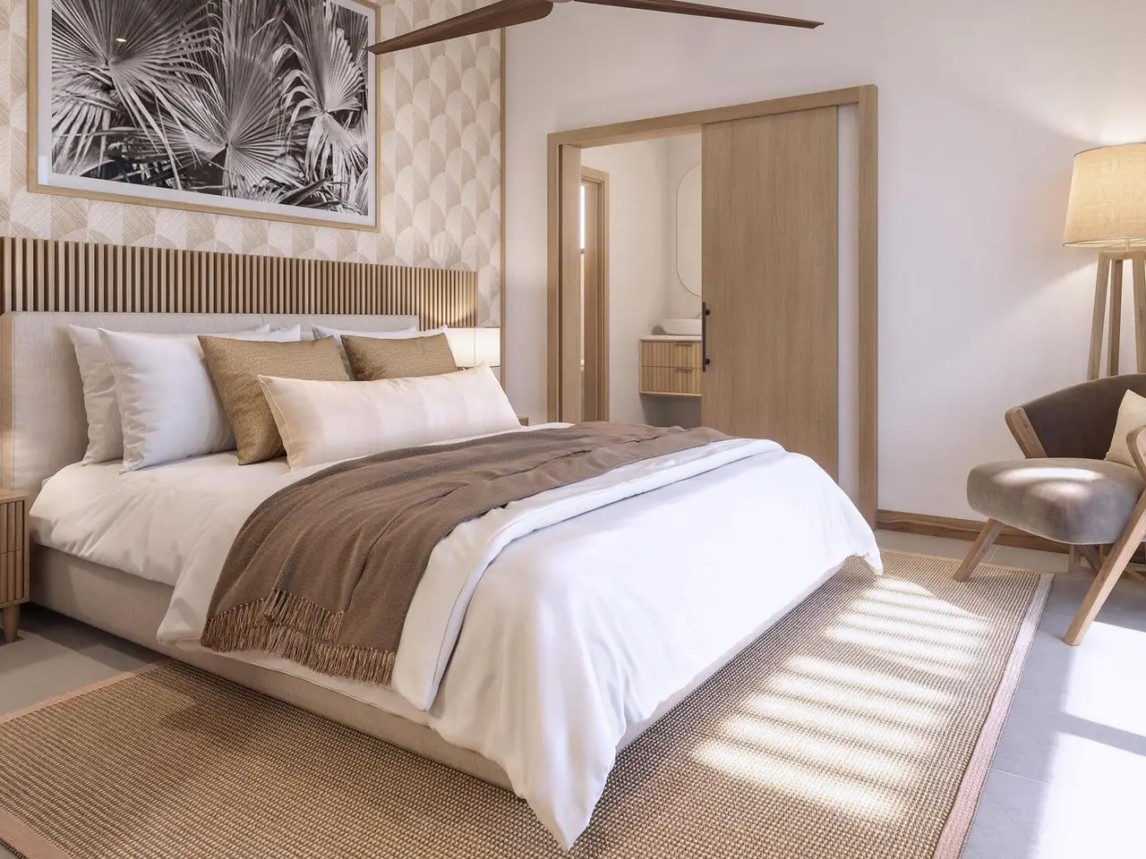 The three Baie Rose villas boast generous dimensions and a privileged westerly aspect, allowing you to take full advantage of the magnificent sunsets over Rivière Noire. These villas offer an incomparable living environment thanks to their meticulous architecture, which encourages relaxation and conviviality. Each villa has a spacious living room with lounge, dining room and open-plan kitchen leading directly onto a covered terrace and private swimming pool. The generously proportioned interior spaces include three en suite bedrooms offering comfort and serenity. The master suite, complete with dressing room and outdoor shower, is a haven of peace and privacy. The Baie Rose villas promise an exceptional quality of life in a natural setting of rare beauty. Interior living space: 141.3 m² Total built area: 269.2 m² Land: from 626 to 750 m² Residents have access to a private clubhouse with an air-conditioned gym, a swimming pool and a spacious deck for entertaining events, such as barbecues with friends. An ideal living environment all year round Palmaris enjoys optimum sunshine all year round, providing the ideal setting for leisure activities and a relaxed lifestyle. Owners also benefit from privileged access to a prestigious 18-hole golf course in the immediate vicinity. Palmaris, living naturally, quite simply.