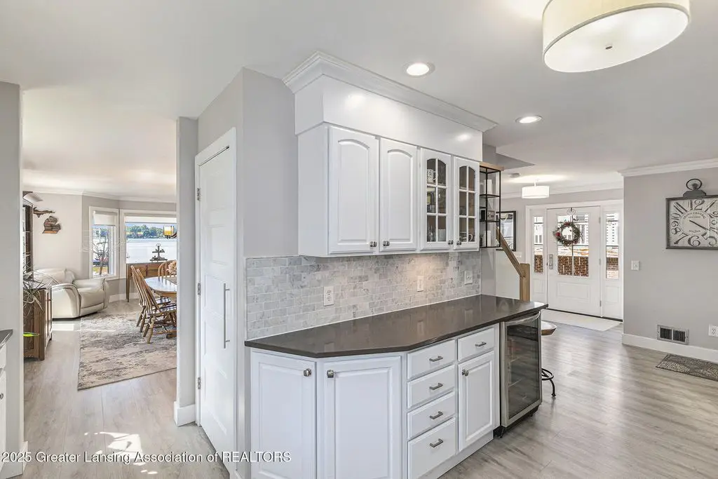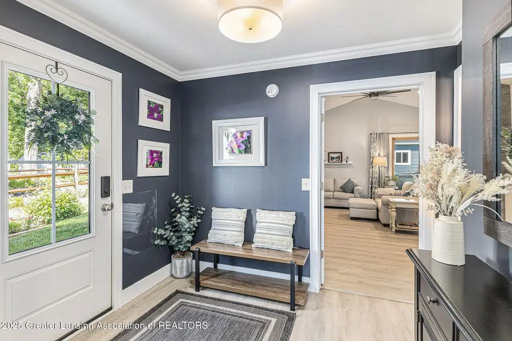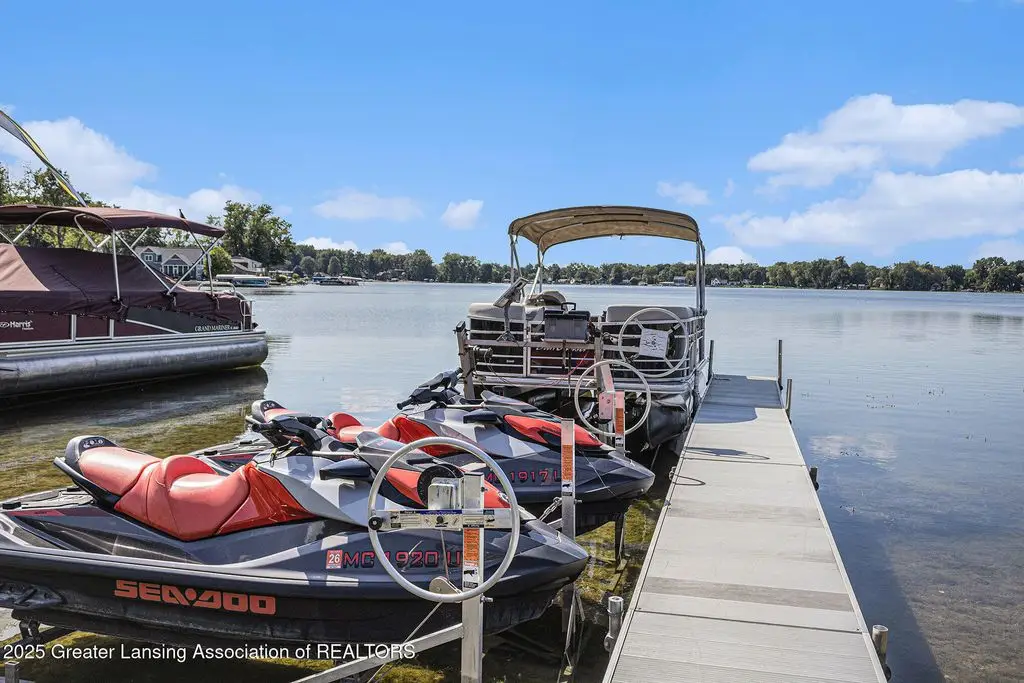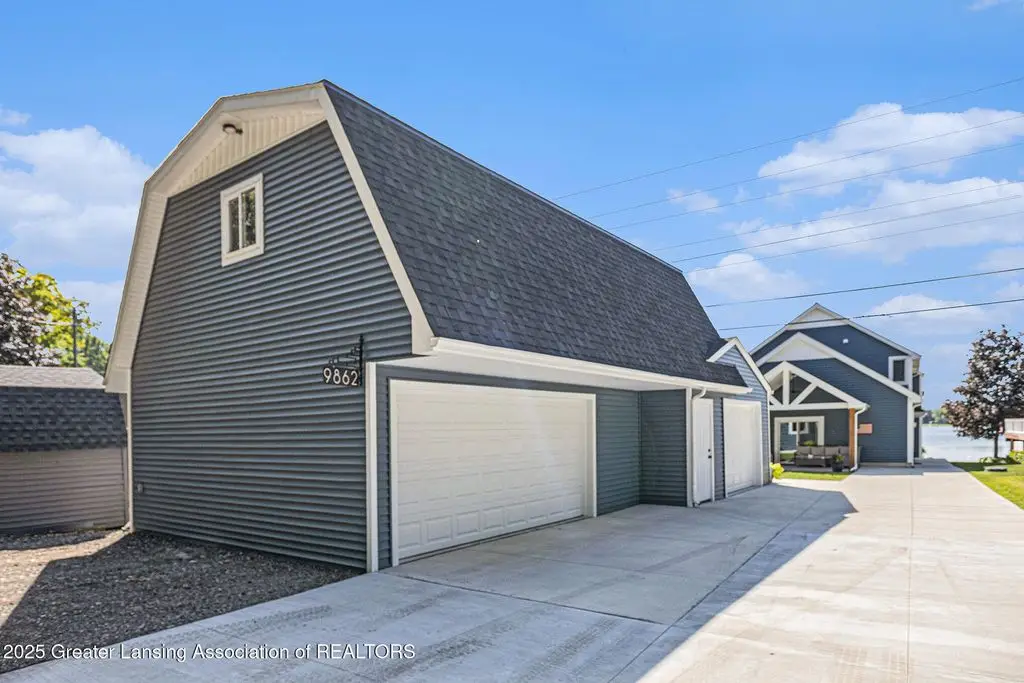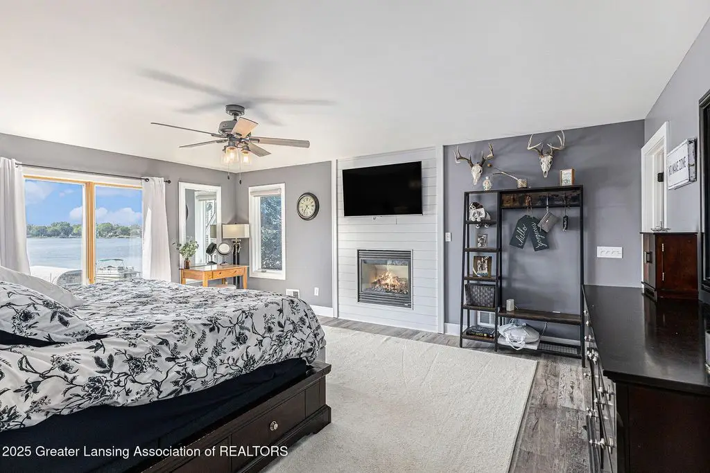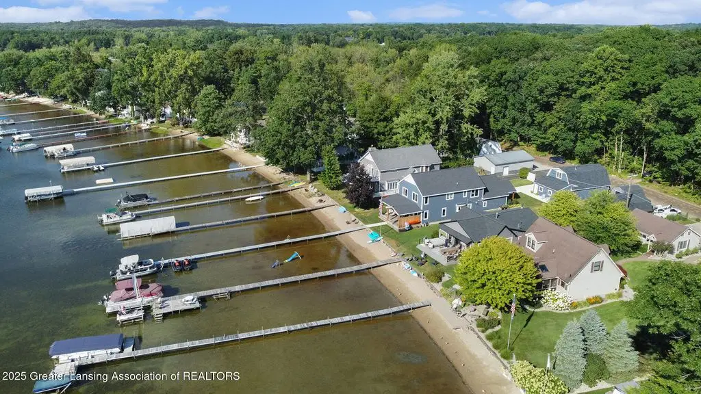 If you've been searching for a one-of-a-kind home on the Huron chain of lakes, this is it! The entire 3,216 square foot two-story home has been professionally and tastefully updated on the exterior and interior. Features five bedrooms, 3.5 bathrooms, main floor primary suite is massive with soaring ceilings, a cozy built in fireplace surrounded by shelves, a huge custom built WI closet, large bathroom w/dual sinks, tiled walk-in shower and granite countertops, complete with door to your own private covered concrete patio with recessed lighting and ceiling fan. 2nd floor features remodeled primary suite with fireplace, updated bath with dual sinks, tiled walk-in shower, closet and additional laundry area. Three additional spacious bedrooms and a full bath are located on the second level. Gorgeous kitchen with SS appliances and quartz countertops that wraps around to the spacious open dining/living room area facing the lake and new Trex deck with recessed lighting and ceiling fans. Three-car detached finished, heated garage with stairs to a loft for extra storage. All new concrete drive, (lots of parking) patio space and sidewalk to dock/lake. Within the last few years this home has had all new flooring throughout, a new roof (house and garage), new siding, new two-zoned unit furnace and air conditioning, new water heater, too many upgrades to mention. Basically a brand new home with 49 feet of lake frontage, an outdoor shower convenient for rinsing yourself or your pets after a lake day/swim. Also includes generator that is wired to run the entire house.