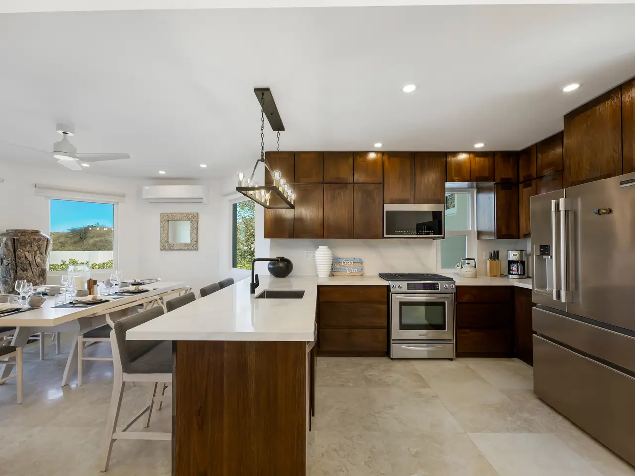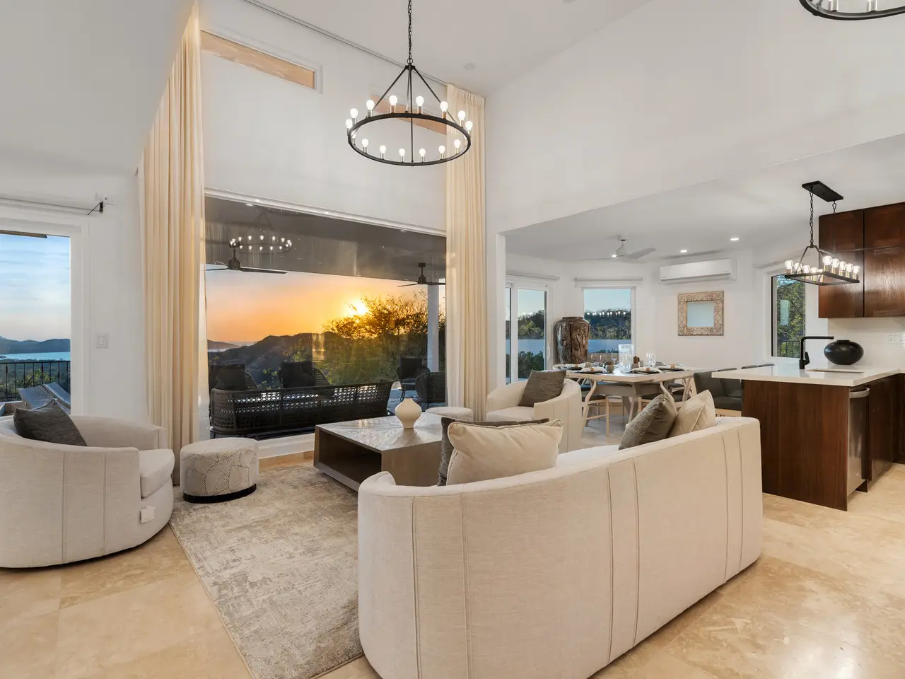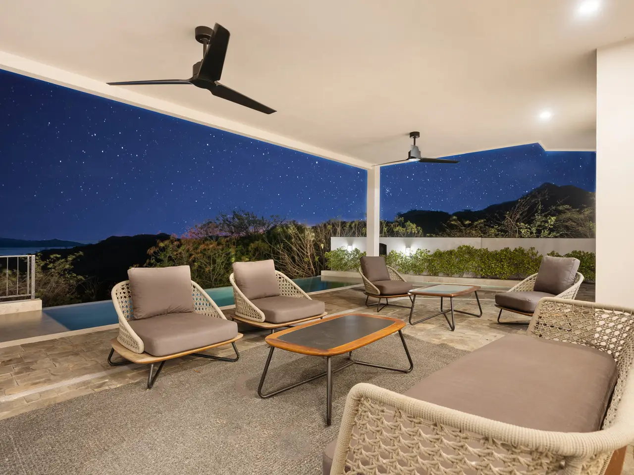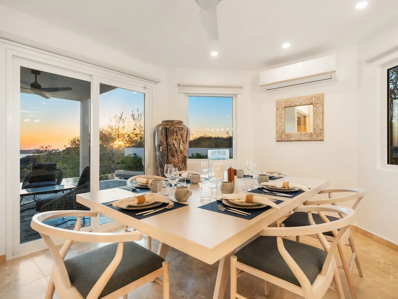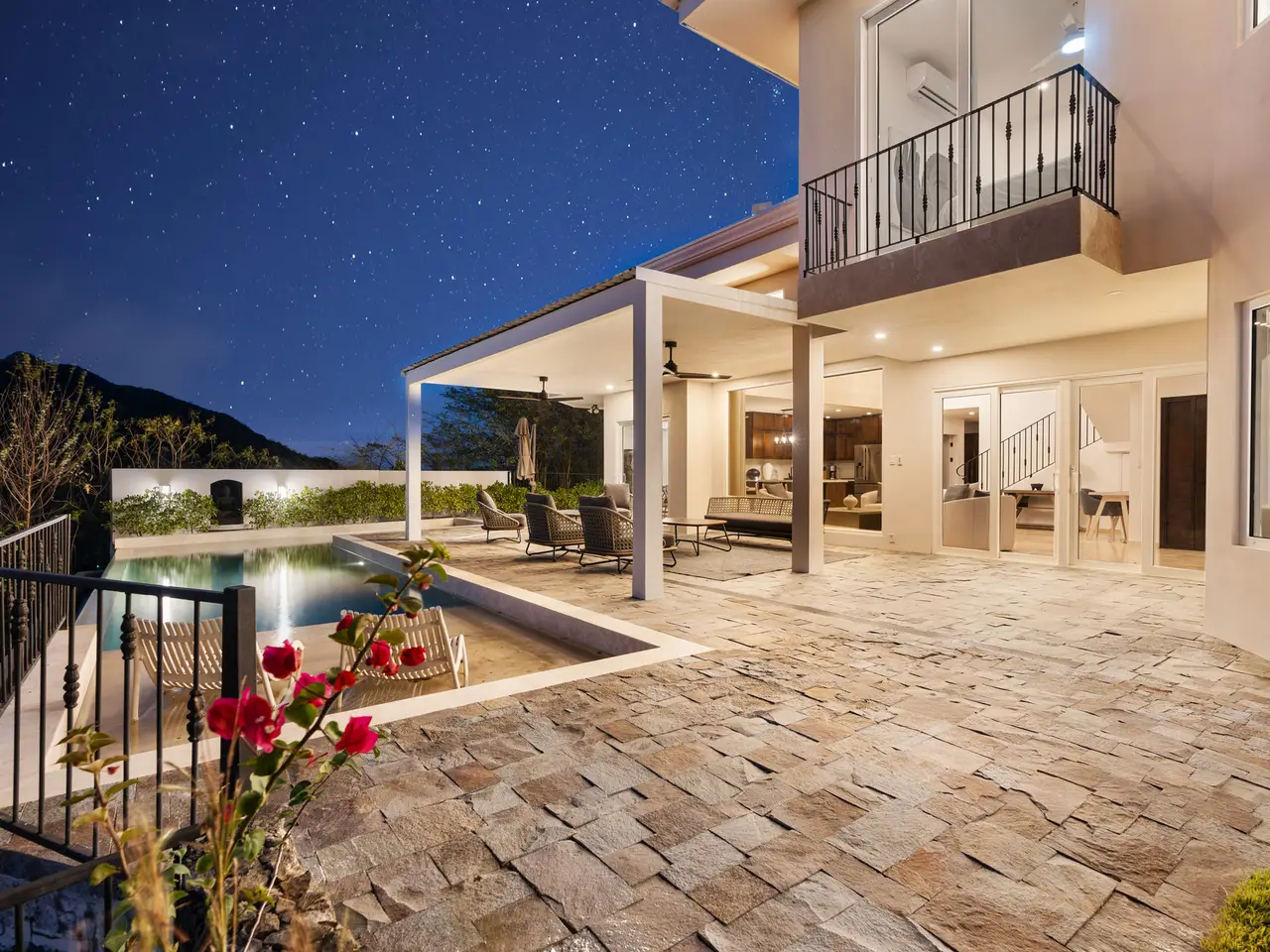 Casa Sunset – Ocean View Retreat in Mar Vista Discover Casa Sunset, a beautifully renovated coastal retreat located at the top of the prestigious Miramar section within the exclusive Mar Vista community. This luxurious property features a two-story main home with 3 bedrooms and 3.5 bathrooms, plus a separate 1-bedroom, 1-bathroom apartment which is perfect for guests or rental income. Spanning 3,200 sq ft of elegant living space on a sprawling 5,163 m² lot, Casa Sunset offers breathtaking panoramic ocean and mountain views in a peaceful, private setting, with plenty of room to expand. Completely remodeled in a refined tropical modern style, the home features floor-to-ceiling windows and high-end Pella sliding doors that seamlessly connect indoor and outdoor living. Natural travertine marble graces the floors and bathroom walls, while all cabinetry is custom-made from rich local hardwoods. The home is sold fully furnished with imported designer pieces from Casa Nova, making it completely turnkey - just bring your suitcase and start enjoying paradise! Step through the front door and be instantly captivated by the panoramic view of the Pacific Ocean. To your left, a spacious guest suite awaits with a queen bed, private bath, cozy sitting area, and large windows that perfectly frame the sea. To your right, the open-concept living space flows effortlessly between the living room, dining area, and gourmet kitchen. The kitchen is a chef’s dream, featuring custom hardwood cabinetry, sleek white quartz countertops, and brand-new stainless steel appliances. The principal suite occupies the second floor and offers even more dramatic, sweeping views of the ocean. This stunning retreat features a luxurious king bed, a serene sitting area, and a spa-inspired bathroom straight out of a magazine. The bathroom boasts two ocean-facing showers and a soaking tub, all framed by a striking wall of sea green tile that brings the coastal beauty indoors. The living room showcases a dramatic two-story vaulted ceiling with an entire wall of glass, capturing the endless ocean horizon in all its glory. Just behind the kitchen, you’ll find a large laundry room, ample built-in storage, garage access, and a generous second guest bedroom. This space is thoughtfully designed with four custom bunk beds, a sitting area, and a dining/game table—perfect for entertaining children or hosting extra guests. Sliding doors lead directly to the lush outdoor space. Step outside to a spacious covered terrace ideal for alfresco dining or simply relaxing in the shade. The L-shaped infinity-edge pool, complete with a built-in lounging shelf, overlooks the majestic mountains and the iconic white sands of Playa Conchal. With unforgettable sunsets and views that stir the soul, Casa Sunset is more than a home—it’s a serene coastal sanctuary where luxury meets nature. Owning property in Mar Vista means enjoying a secure, upscale community just minutes from the new Flamingo Marina, top international schools, and some of Costa Rica’s most beautiful beaches. With resort-style amenities, breathtaking views, and a strong sense of community, it's the perfect location for a full-time family home or a high-performing vacation rental. Make Casa Sunset yours! Please reach out today for a private viewing.