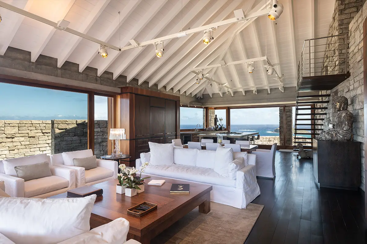 Built on the highest crest of Pointe Milou, this unique villa is like a mini resort and spa. The creation of New York architects Barnes & Coy, this villa is a true jewel of modern architecture and the fruit of incredible craftsmanship. In blending the raw aspect of the stone with the refined woods, the result is perfectly mastered excellence and luxury. The main room, with its 270 degree view, accomplishes the incredible feat of being able to showcase both the sunrise and sunset every day. The entrance leads directly to the heart of the house, between the kitchen and the living room, where the height of the ceiling is truly stunning. At your feet, or so it seems, are the bays of Lorient and St Jean and the Atlantic Ocean and St Martin. There are seven bathrooms and five ensuite bedrooms all similar in size. Three of them have stone walls, private terraces and outdoor showers and the other two radiate with brilliant white tones. The focal point of the property is the wonderful infinity pool. Almost 70 feet long, it is lined with black lava stone, which together with solar panels, maintains the water at a perfect temperature. Adjacent to the pool is an ipe and stone terrace with exceptional panoramic views shaded by a stainless steel and canvas awning along with a stone and wood circular shaped outdoor pool shower and bathroom. There is a private office area on the mezzanine level as well as a well-equipped fitness room on the lower level. The lower level also boasts a dedicated massage room for enjoying massages in the comfort of your own home. Villa DOL is truly 'one of a kind'. The property also benefits from a valid building permit allowing modifications to the current layout, including the removal of two bedrooms on the lower floor to create a caretaker’s accommodation with independent access, the creation of a new master bedroom near the pool, and the installation of an elevator.