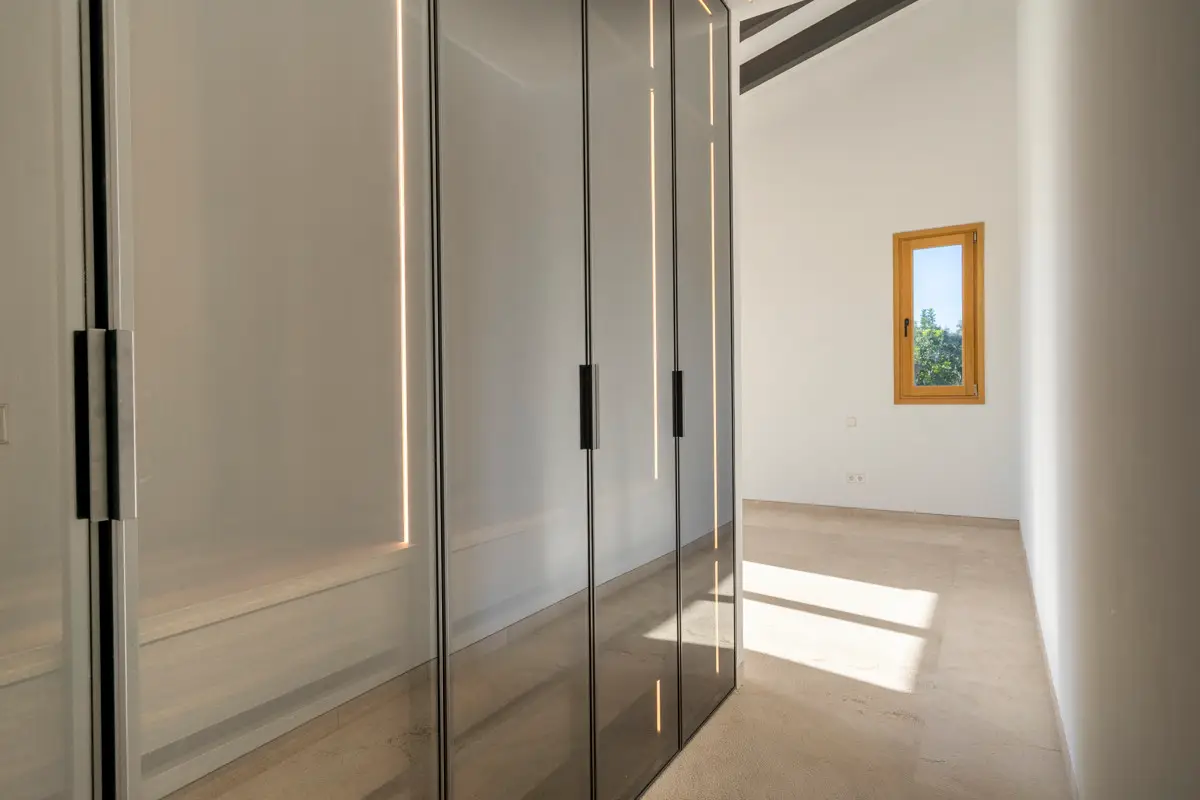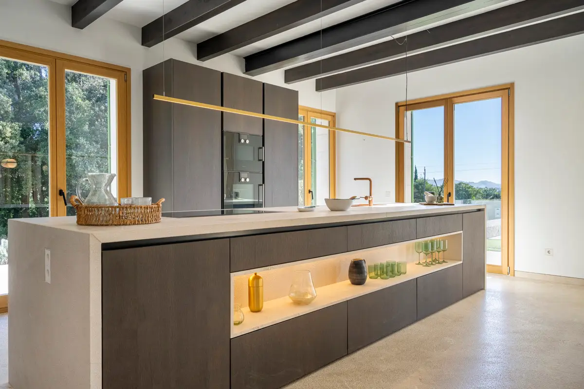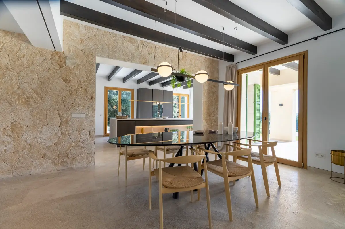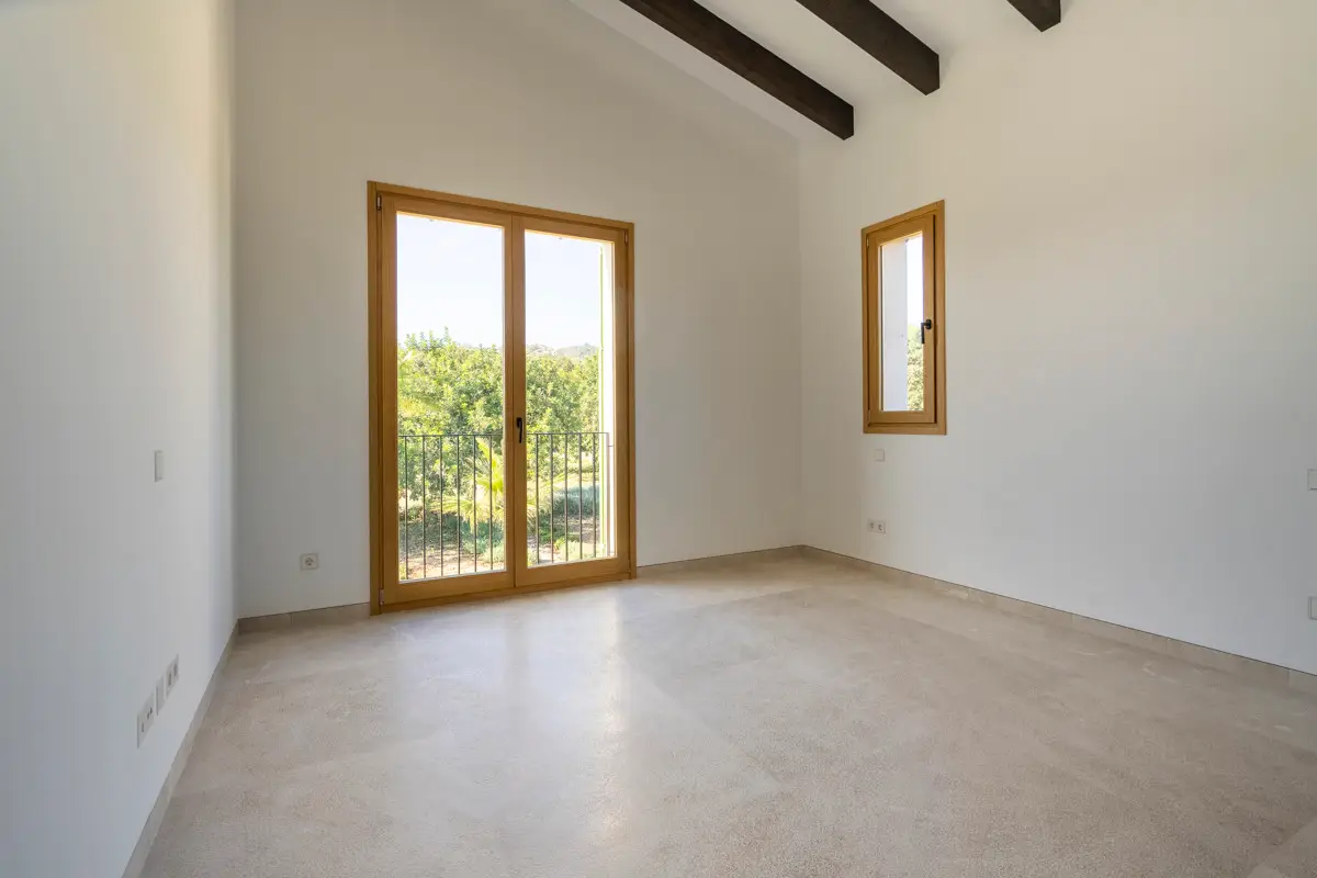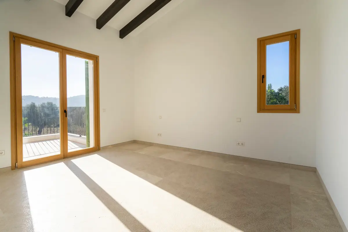 Welcome to "Ca'n Marina" - a luxurious house on a stunning plot near the historic town of Pollensa, in the north of Mallorca. The property extends over a living space of approximately 405 m² and is located on a spacious plot of approximately 14,121 m². With five rooms, four bedrooms and five bathrooms, this property offers enough space for a large family or guests. The construction of the house meets the highest standards in terms of design and technical equipment. The main focus was to perfectly integrate the property into its natural surroundings and offer panoramic views over the surrounding landscape. Inside the house you will find a spacious and well thought out layout. The high entrance hall leads into a bright living room with an adjustable fireplace that separates the dining and living areas. The tailor-made kitchen is an absolute highlight and has high-quality fittings. An en suite bedroom with access to a private terrace, a utility room and a cloakroom complete the ground floor. The first floor houses two further bedrooms with bathrooms as well as a magnificent master suite with dressing area and sauna. From here you have a wonderful view of the surrounding landscape. Two of the bedrooms have direct access to the large balcony which overlooks the garden and pool area. A fully equipped basement with natural stone floors provides additional space for various uses such as a home theater, gym or wine cellar. An outbuilding on the property serves perfectly as a storage or multifunctional room. The impressive property is insulated and has underfloor heating on all three floors, integrated air conditioning and a smart ventilation system. The outdoor area is a true oasis of relaxation. With a swimming pool, several open and covered terraces and a variety of Mediterranean plants, the property invites you to spend time outdoors. The location of the finca is ideal. It is located just half an hour from the city of Palma and the airport, but far enough away to enjoy the peace and privacy of rural life in Mallorca. If you would like further information about this property, please contact us and we will send you our detailed property brochure.
