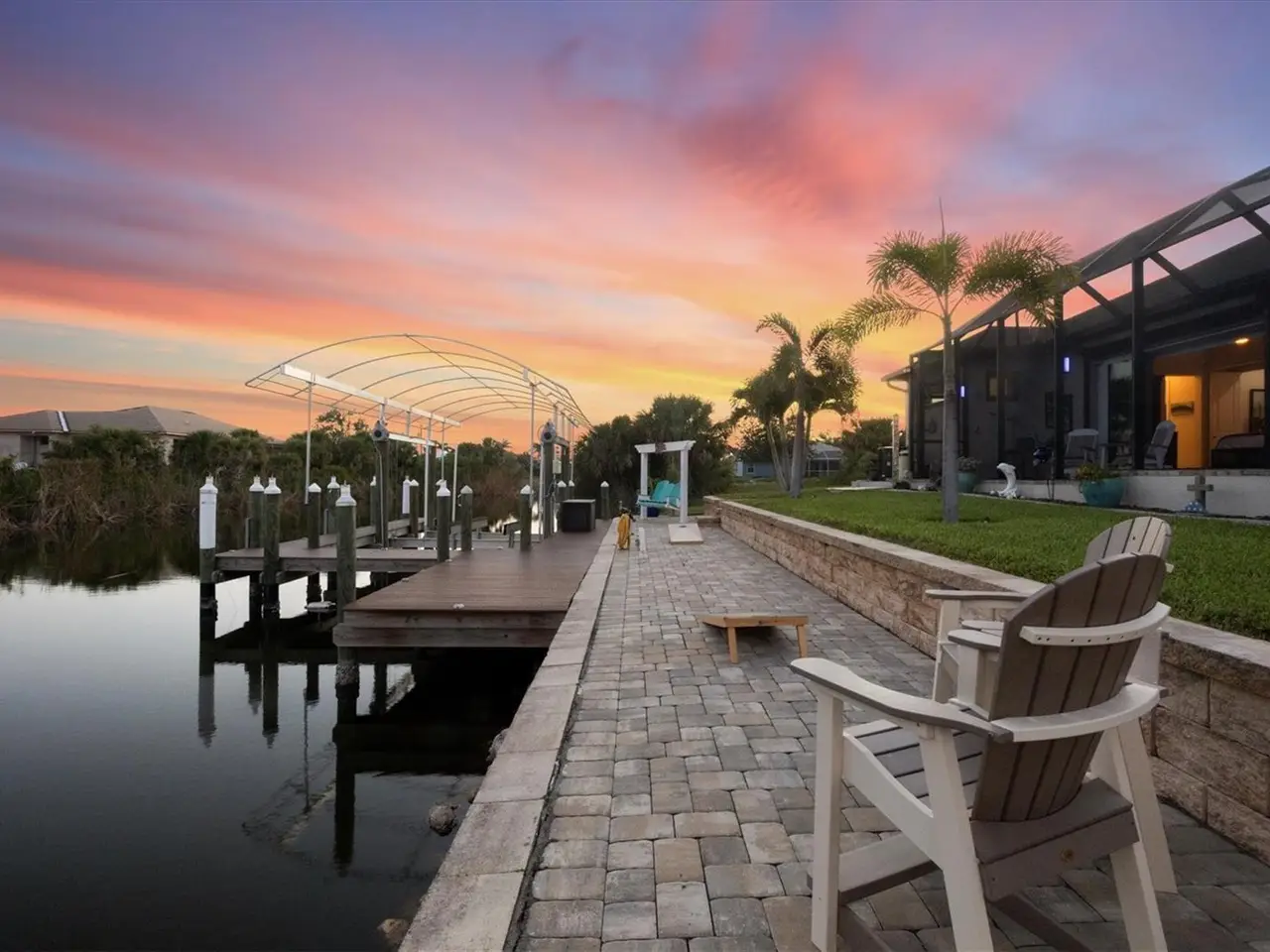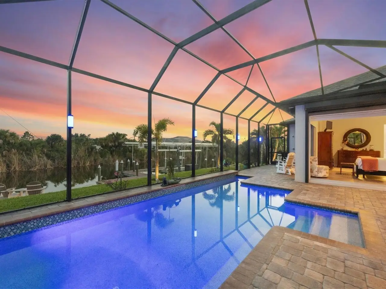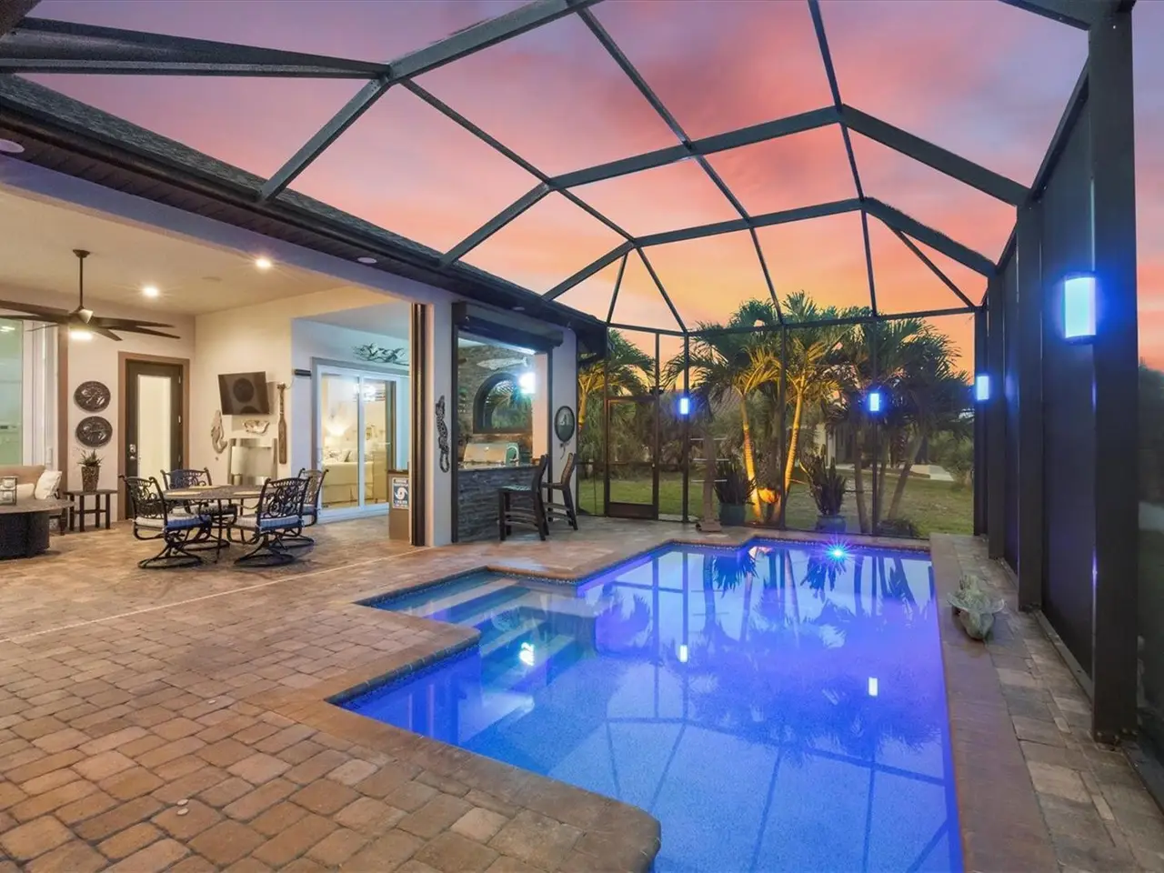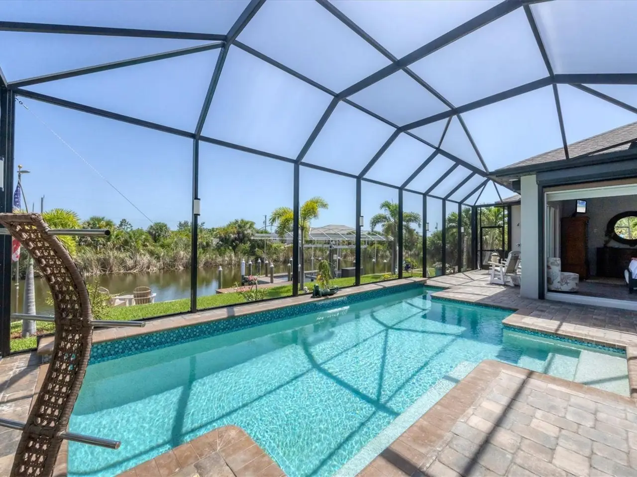 Tucked in a serene Florida waterfront community, this elegant 3-bedroom, 2-bath custom home is the perfect blend of luxury, comfort, and smart design. From the moment you arrive, it’s clear that every inch of this property has been thoughtfully crafted—from the paver driveway and travertine entrance to the gorgeous etched glass double doors that make a striking first impression. Inside, you’re greeted by rich wood-look tile flooring, custom tray ceilings, and a welcoming open layout that flows effortlessly from room to room. The living space is bright and open, with oversized sliders framing stunning water views that never get old. Whether you’re hosting a holiday party or simply relaxing by the electric fireplace with family, this home makes it easy to live beautifully. And the kitchen? It’s a chef’s dream. With a massive 9-foot quartz island, an Electrolux 5-burner induction cooktop, wall ovens, an oversized refrigerator/freezer, and high-end fixtures, cooking becomes a joy — not a chore. You’ll find yourself gathering here often, whether for morning coffee or sunset hors d'oeuvres. The primary suite is a peaceful retreat. Wake up to water views and step directly out to the lanai. The spa-style en-suite bathroom features an oversized walk-through shower, dual vanities, and a 13x8 walk-in closet so spacious it could be its own room. Across the home, two guest bedrooms ensure privacy and comfort for family or visitors. Step out onto the lanai and your private resort awaits. A heated saltwater pool with a soothing water feature invites you in for a dip. Entertain at the fully equipped summer kitchen with a Webber Summit grill and expansive bar space—perfect for laid-back evenings with friends. New pool screens installed in 2023 keep everything fresh and beautiful. And when a storm rolls in? Just press a button—automatic hurricane shutters protect everything, no need to move a single chair. As the sun sets, stroll down the lighted captain’s walk to your private 16-foot composite dock, complete with water and electric hookups and a walk-around 10,000 lb. boat lift—making every boat day easy and effortless. This home is not just beautiful, it’s built for peace of mind. From impact-resistant glass and electric shutters to Icynene insulation, Nest smart home features, and a newly painted exterior (2023), it’s as smart and secure as it is stunning. There are too many extras to list—but one walk through will show you: this is more than a home, it’s a lifestyle. Schedule your private tour today and experience the very best in Florida luxury living.