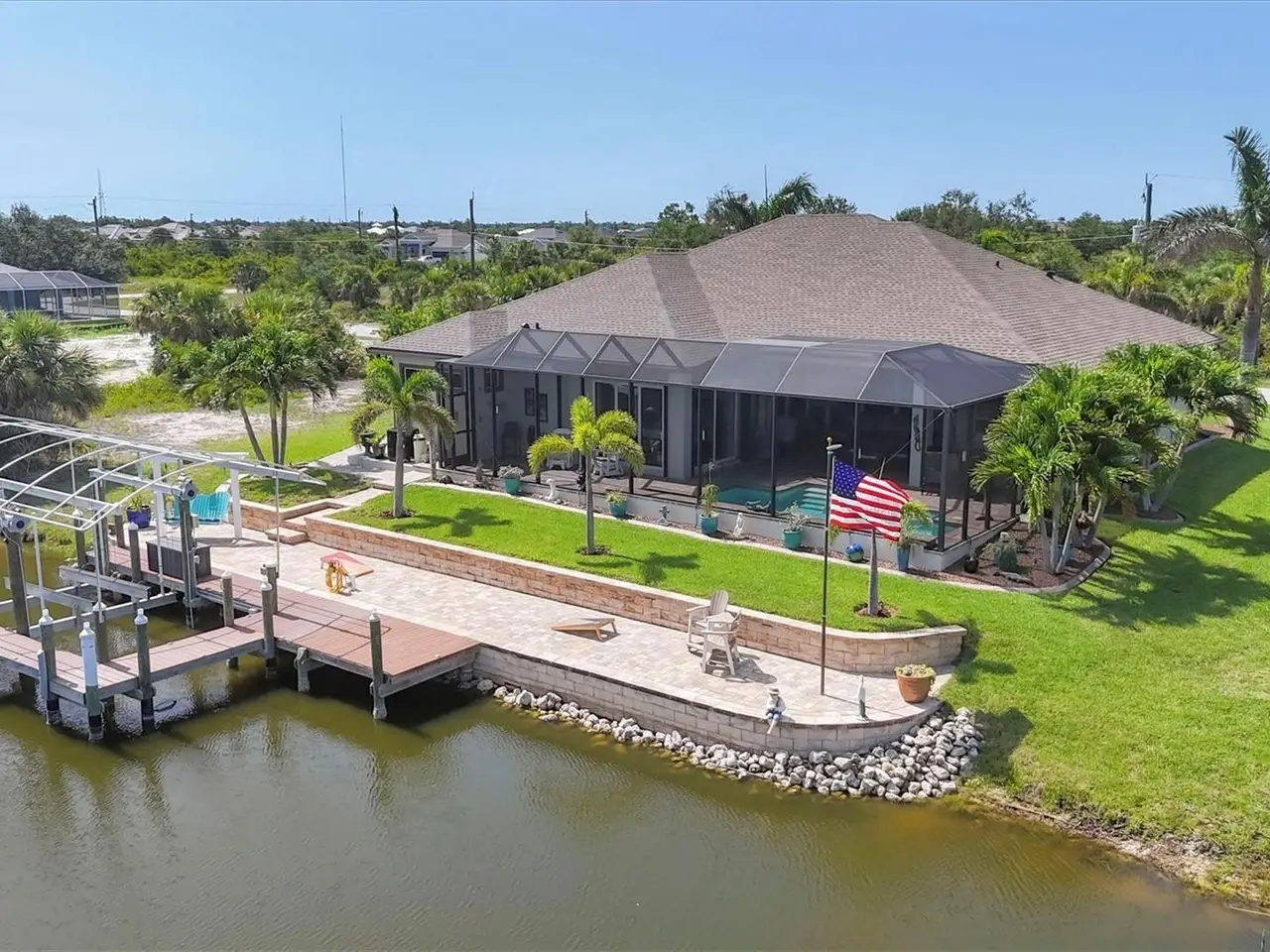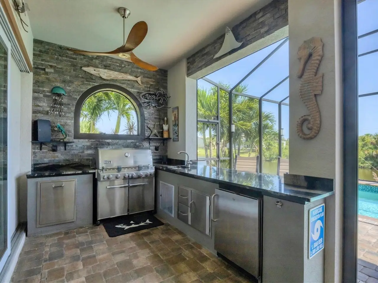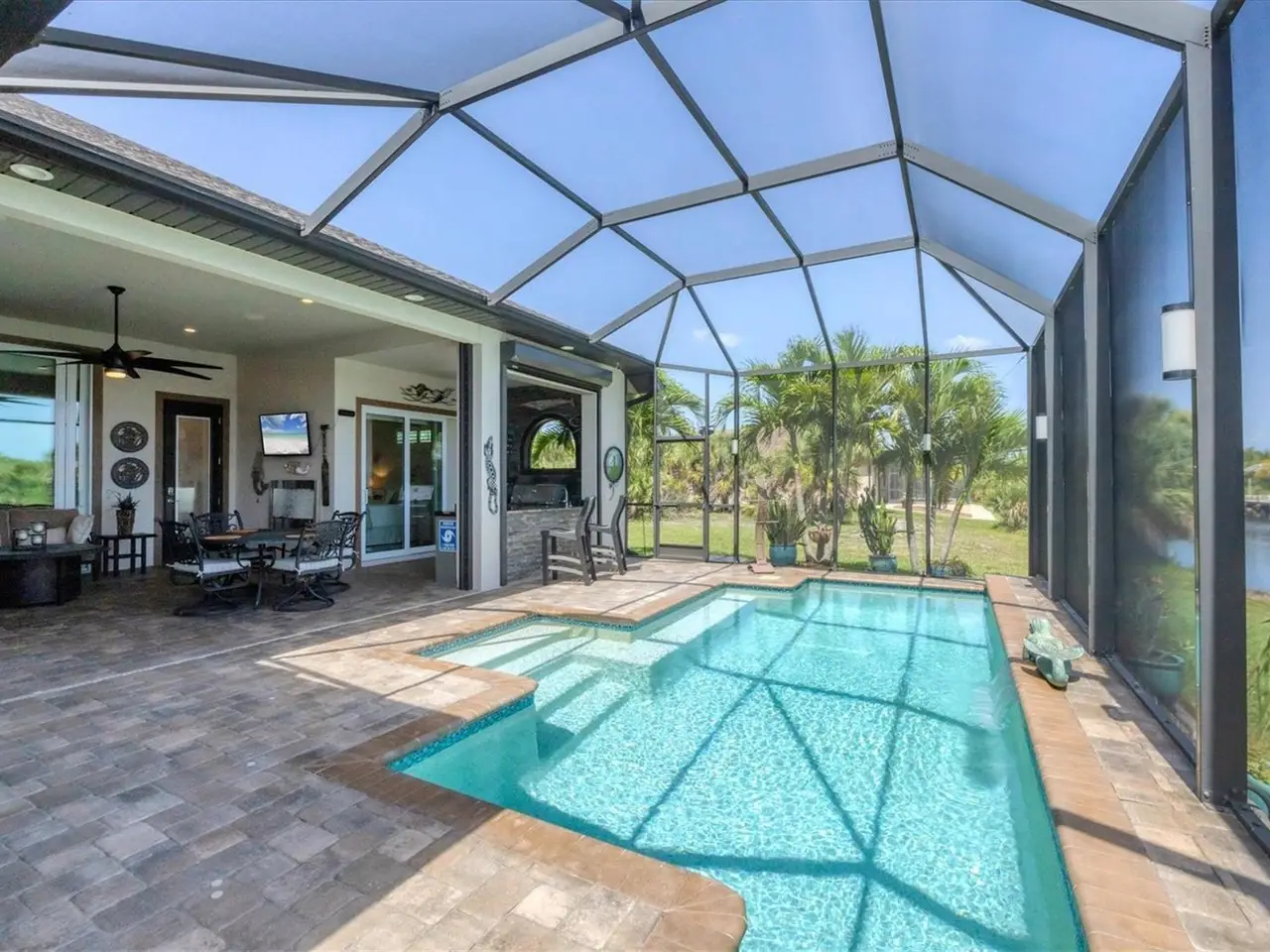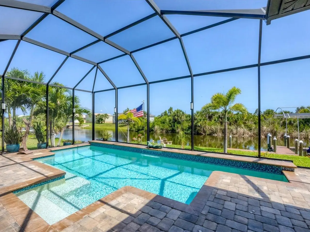 Tucked in a serene Florida waterfront community, this elegant 3-bedroom, 2-bath custom home is the perfect blend of luxury, comfort, and smart design. From the moment you arrive, it’s clear that every inch of this property has been thoughtfully crafted—from the paver driveway and travertine entrance to the gorgeous etched glass double doors that make a striking first impression. Inside, you’re greeted by rich wood-look tile flooring, custom tray ceilings, and a welcoming open layout that flows effortlessly from room to room. The living space is bright and open, with oversized sliders framing stunning water views that never get old. Whether you’re hosting a holiday party or simply relaxing by the electric fireplace with family, this home makes it easy to live beautifully. And the kitchen? It’s a chef’s dream. With a massive 9-foot quartz island, an Electrolux 5-burner induction cooktop, wall ovens, an oversized refrigerator/freezer, and high-end fixtures, cooking becomes a joy — not a chore. You’ll find yourself gathering here often, whether for morning coffee or sunset hors d'oeuvres. The primary suite is a peaceful retreat. Wake up to water views and step directly out to the lanai. The spa-style en-suite bathroom features an oversized walk-through shower, dual vanities, and a 13x8 walk-in closet so spacious it could be its own room. Across the home, two guest bedrooms ensure privacy and comfort for family or visitors. Step out onto the lanai and your private resort awaits. A heated saltwater pool with a soothing water feature invites you in for a dip. Entertain at the fully equipped summer kitchen with a Webber Summit grill and expansive bar space—perfect for laid-back evenings with friends. New pool screens installed in 2023 keep everything fresh and beautiful. And when a storm rolls in? Just press a button—automatic hurricane shutters protect everything, no need to move a single chair. As the sun sets, stroll down the lighted captain’s walk to your private 16-foot composite dock, complete with water and electric hookups and a walk-around 10,000 lb. boat lift—making every boat day easy and effortless. This home is not just beautiful, it’s built for peace of mind. From impact-resistant glass and electric shutters to Icynene insulation, Nest smart home features, and a newly painted exterior (2023), it’s as smart and secure as it is stunning. There are too many extras to list—but one walk through will show you: this is more than a home, it’s a lifestyle. Schedule your private tour today and experience the very best in Florida luxury living.
