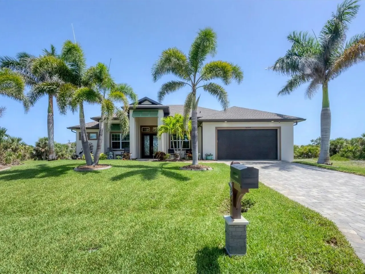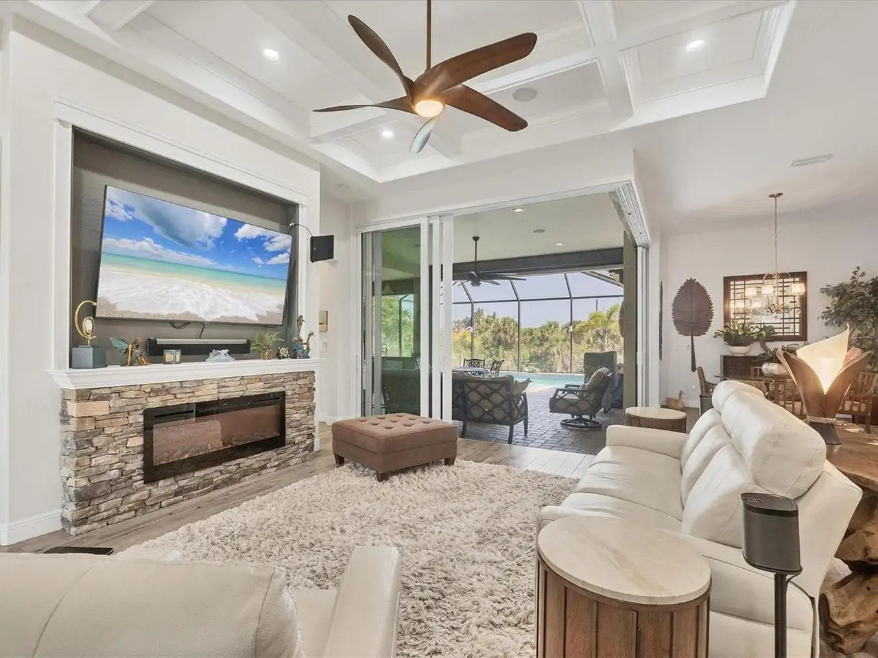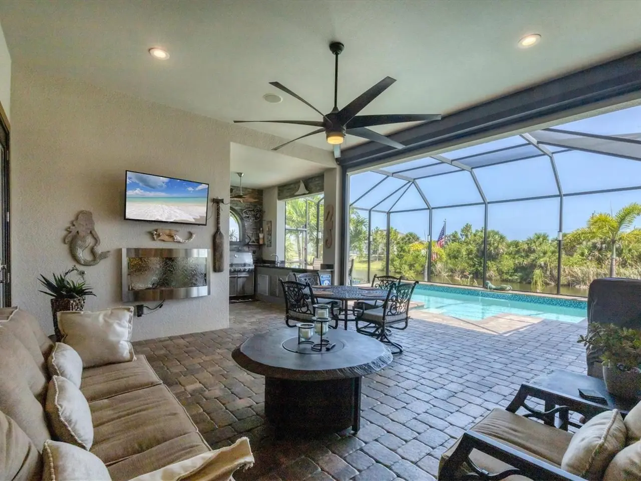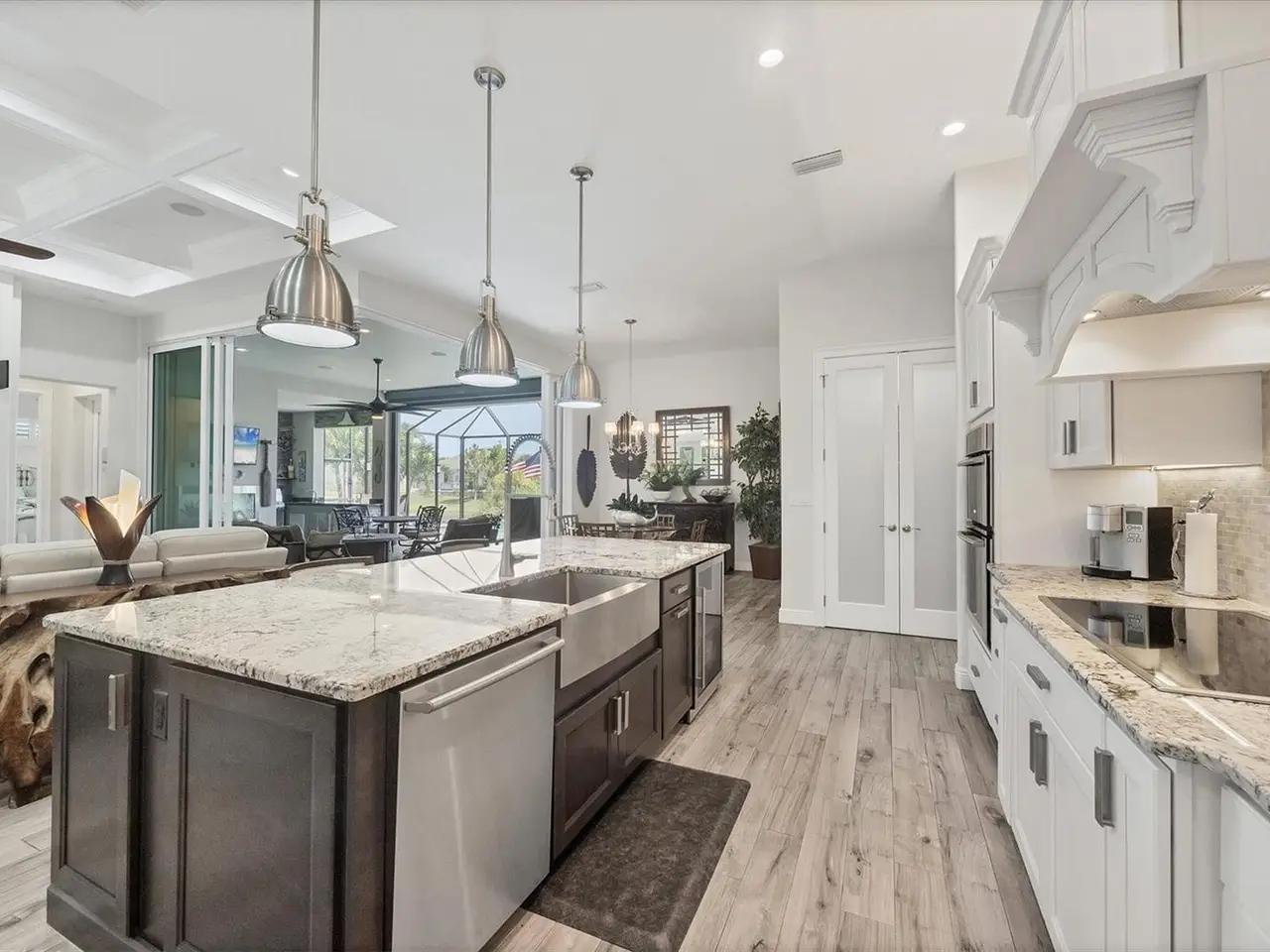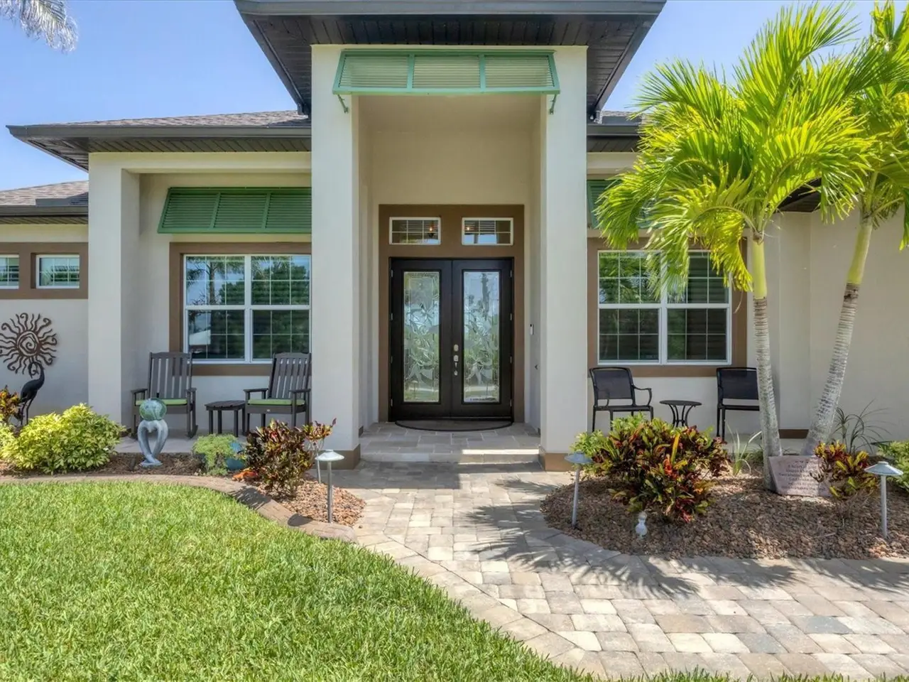 Tucked in a serene Florida waterfront community, this elegant 3-bedroom, 2-bath custom home is the perfect blend of luxury, comfort, and smart design. From the moment you arrive, it’s clear that every inch of this property has been thoughtfully crafted—from the paver driveway and travertine entrance to the gorgeous etched glass double doors that make a striking first impression. Inside, you’re greeted by rich wood-look tile flooring, custom tray ceilings, and a welcoming open layout that flows effortlessly from room to room. The living space is bright and open, with oversized sliders framing stunning water views that never get old. Whether you’re hosting a holiday party or simply relaxing by the electric fireplace with family, this home makes it easy to live beautifully. And the kitchen? It’s a chef’s dream. With a massive 9-foot quartz island, an Electrolux 5-burner induction cooktop, wall ovens, an oversized refrigerator/freezer, and high-end fixtures, cooking becomes a joy — not a chore. You’ll find yourself gathering here often, whether for morning coffee or sunset hors d'oeuvres. The primary suite is a peaceful retreat. Wake up to water views and step directly out to the lanai. The spa-style en-suite bathroom features an oversized walk-through shower, dual vanities, and a 13x8 walk-in closet so spacious it could be its own room. Across the home, two guest bedrooms ensure privacy and comfort for family or visitors. Step out onto the lanai and your private resort awaits. A heated saltwater pool with a soothing water feature invites you in for a dip. Entertain at the fully equipped summer kitchen with a Webber Summit grill and expansive bar space—perfect for laid-back evenings with friends. New pool screens installed in 2023 keep everything fresh and beautiful. And when a storm rolls in? Just press a button—automatic hurricane shutters protect everything, no need to move a single chair. As the sun sets, stroll down the lighted captain’s walk to your private 16-foot composite dock, complete with water and electric hookups and a walk-around 10,000 lb. boat lift—making every boat day easy and effortless. This home is not just beautiful, it’s built for peace of mind. From impact-resistant glass and electric shutters to Icynene insulation, Nest smart home features, and a newly painted exterior (2023), it’s as smart and secure as it is stunning. There are too many extras to list—but one walk through will show you: this is more than a home, it’s a lifestyle. Schedule your private tour today and experience the very best in Florida luxury living.
