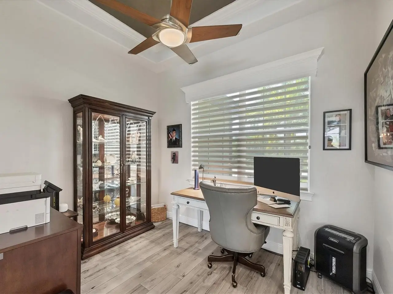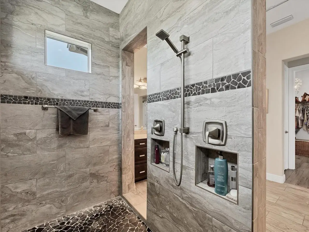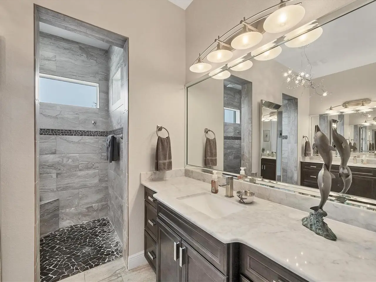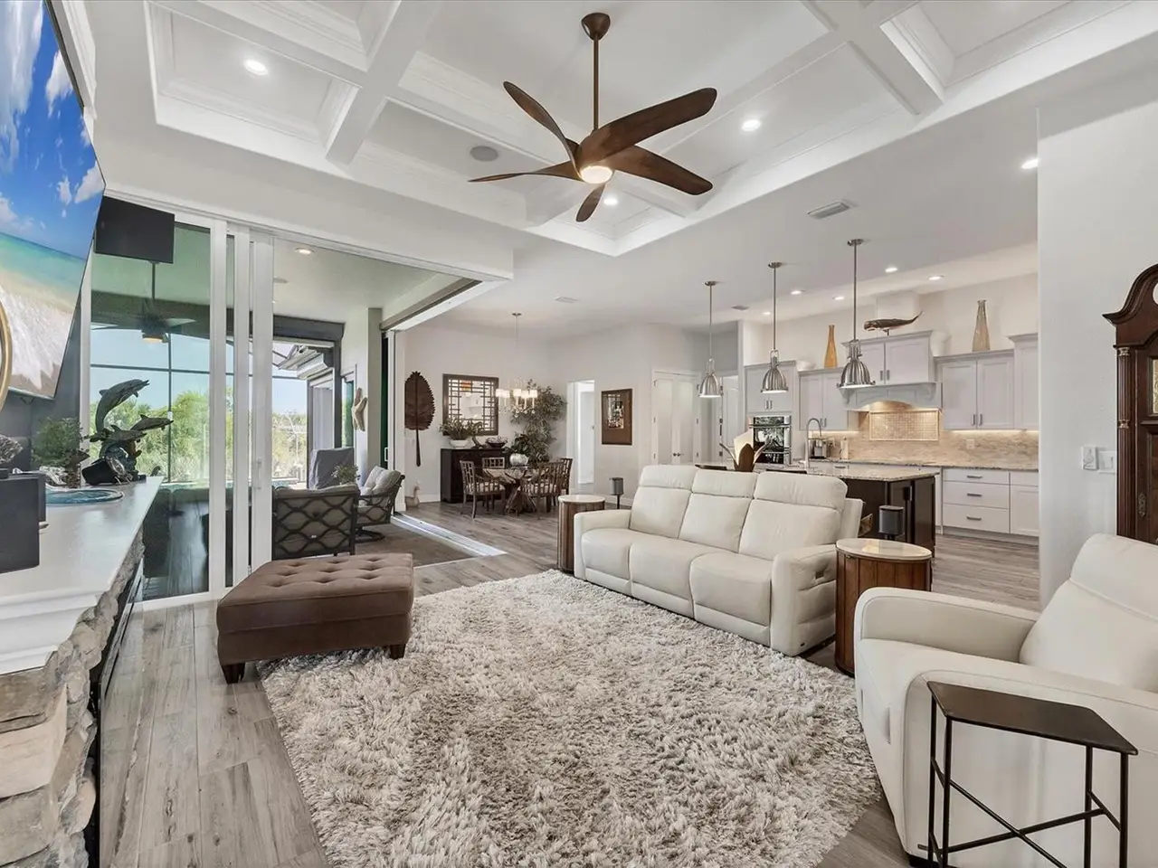 Tucked in a serene Florida waterfront community, this elegant 3-bedroom, 2-bath custom home is the perfect blend of luxury, comfort, and smart design. From the moment you arrive, it’s clear that every inch of this property has been thoughtfully crafted—from the paver driveway and travertine entrance to the gorgeous etched glass double doors that make a striking first impression. Inside, you’re greeted by rich wood-look tile flooring, custom tray ceilings, and a welcoming open layout that flows effortlessly from room to room. The living space is bright and open, with oversized sliders framing stunning water views that never get old. Whether you’re hosting a holiday party or simply relaxing by the electric fireplace with family, this home makes it easy to live beautifully. And the kitchen? It’s a chef’s dream. With a massive 9-foot quartz island, an Electrolux 5-burner induction cooktop, wall ovens, an oversized refrigerator/freezer, and high-end fixtures, cooking becomes a joy — not a chore. You’ll find yourself gathering here often, whether for morning coffee or sunset hors d'oeuvres. The primary suite is a peaceful retreat. Wake up to water views and step directly out to the lanai. The spa-style en-suite bathroom features an oversized walk-through shower, dual vanities, and a 13x8 walk-in closet so spacious it could be its own room. Across the home, two guest bedrooms ensure privacy and comfort for family or visitors. Step out onto the lanai and your private resort awaits. A heated saltwater pool with a soothing water feature invites you in for a dip. Entertain at the fully equipped summer kitchen with a Webber Summit grill and expansive bar space—perfect for laid-back evenings with friends. New pool screens installed in 2023 keep everything fresh and beautiful. And when a storm rolls in? Just press a button—automatic hurricane shutters protect everything, no need to move a single chair. As the sun sets, stroll down the lighted captain’s walk to your private 16-foot composite dock, complete with water and electric hookups and a walk-around 10,000 lb. boat lift—making every boat day easy and effortless. This home is not just beautiful, it’s built for peace of mind. From impact-resistant glass and electric shutters to Icynene insulation, Nest smart home features, and a newly painted exterior (2023), it’s as smart and secure as it is stunning. There are too many extras to list—but one walk through will show you: this is more than a home, it’s a lifestyle. Schedule your private tour today and experience the very best in Florida luxury living.