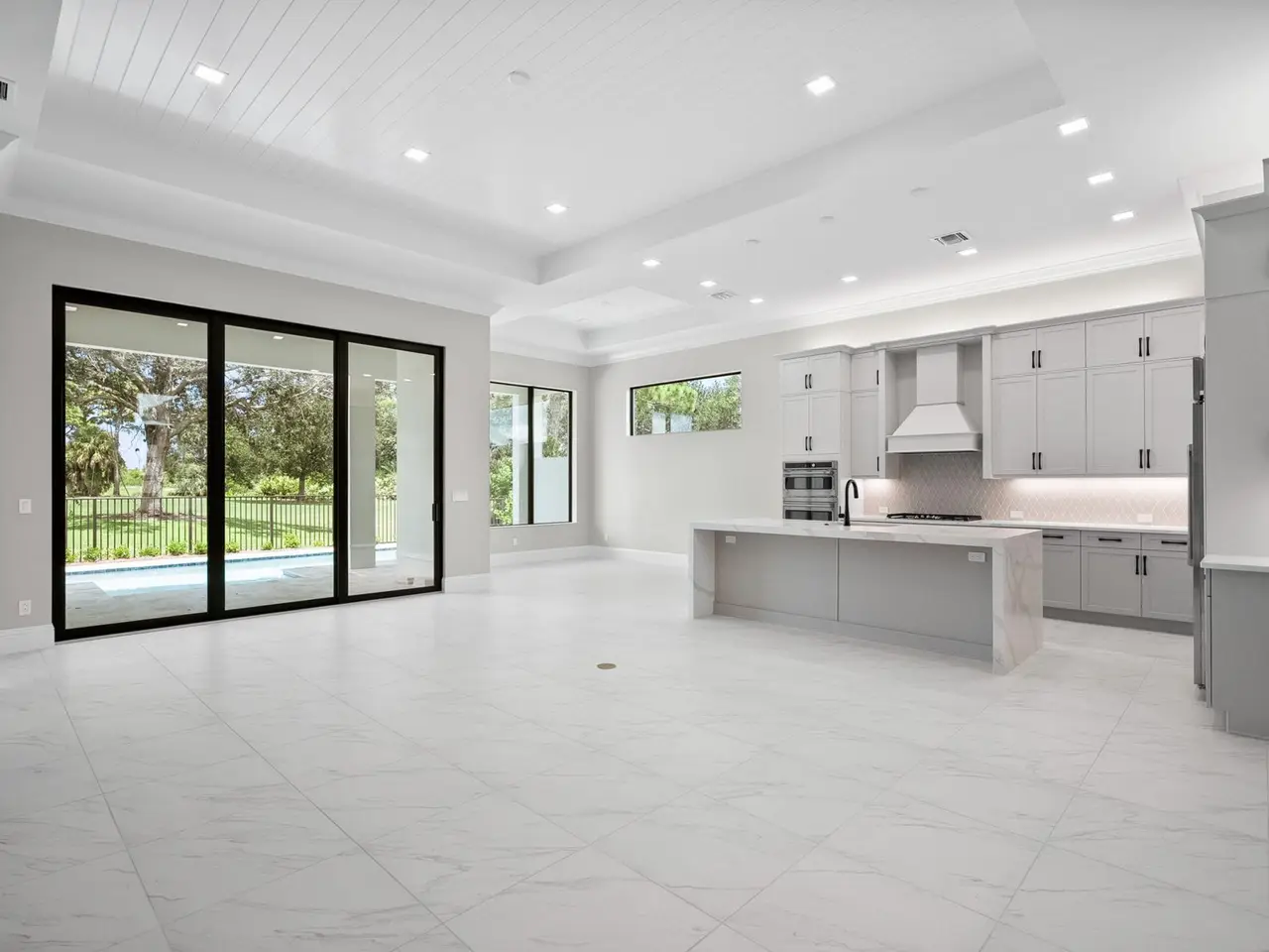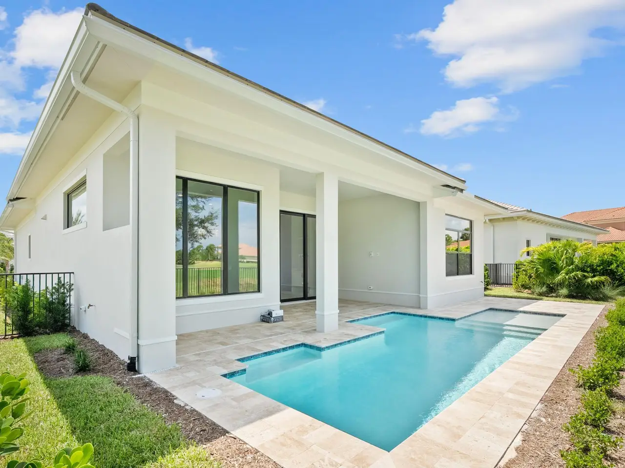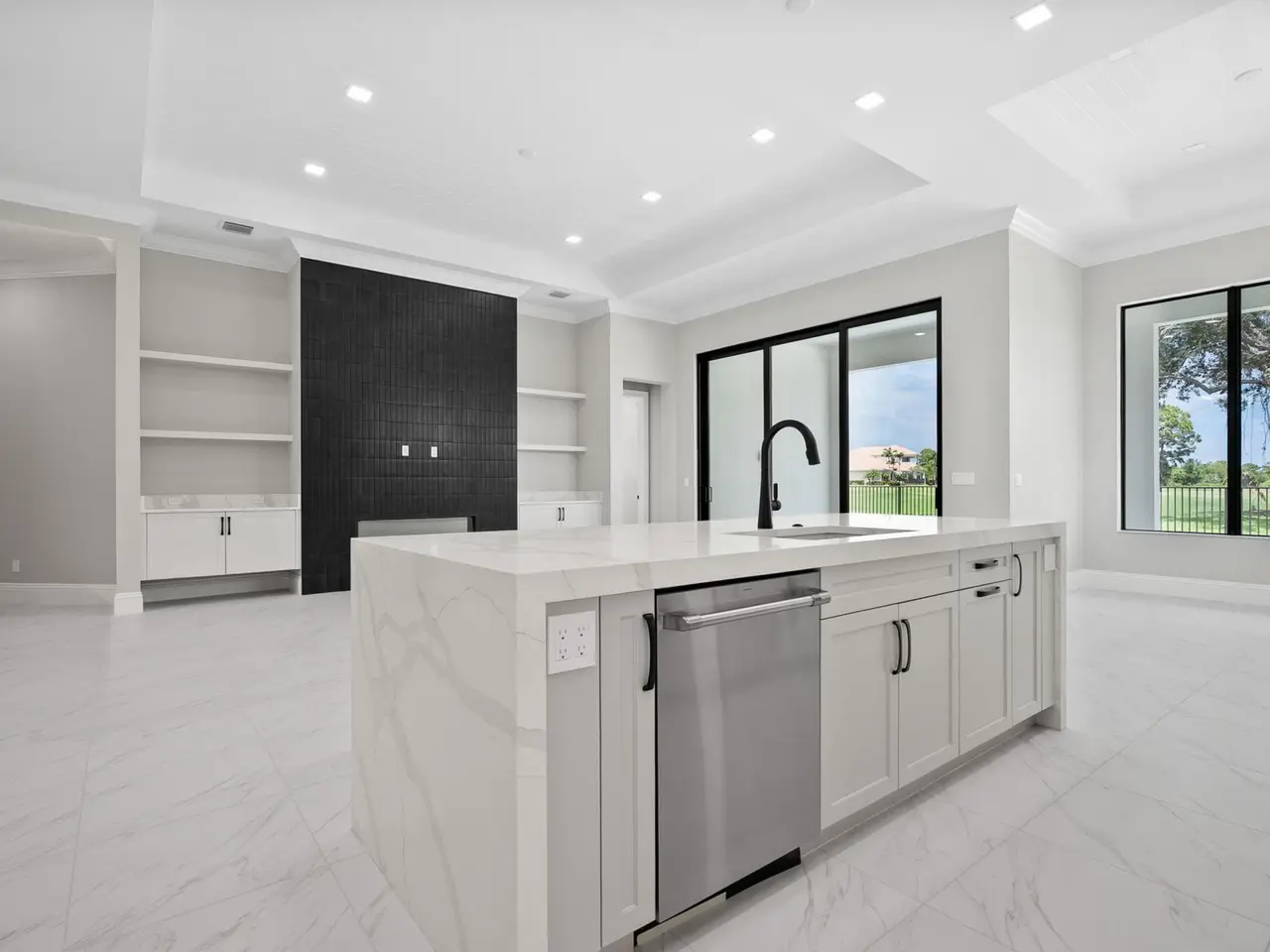 Located in the prestigious Tesoro Club, this exceptional residence features a striking contemporary front elevation. Based on the Stella model, this residence boasts impressive high-volume ceilings and a chefs kitchen with top-of-the-line Cafe appliances, including a spacious 42-inch built-in refrigerator. The kitchen is designed for functionality and style, featuring an oversized central island with a stunning 2.5-inch waterfall edge, a walk-in pantry with custom shelving, and stacked cabinets above a natural gas cooktop. The great room is a focal point, enhanced by an electric fireplace surrounded by elegant tiling, creating an inviting and sophisticated atmosphere. The backyard is perfect for entertaining, with a luxurious pool and travertine paver patio that elevates outdoor living!