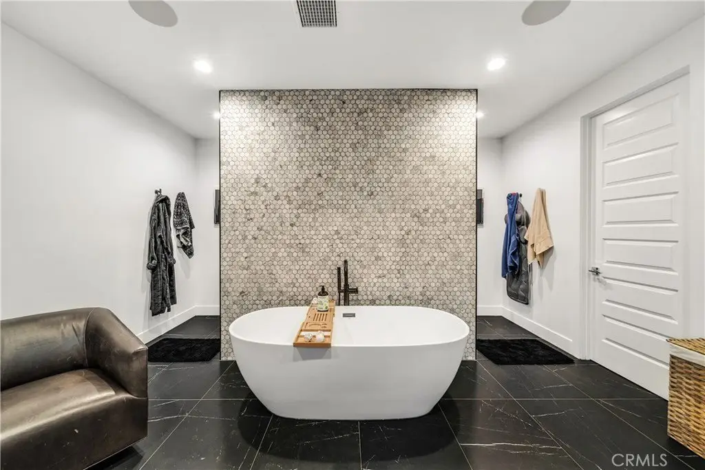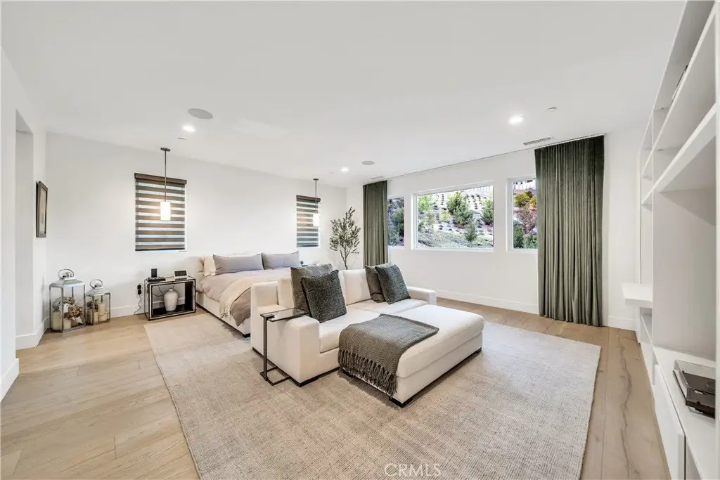 This luxurious residence sits on nearly 19,000 square feet—one of the largest lots available. Showcasing meticulously landscaped grounds with a grand driveway and a charming walkway lined with expensive age-old olive trees. Located behind the gates in the prestigious Westcliffe community, a guard gated enclave in the upscale Los Angeles suburb of Porter Ranch. This Vega floor plan- Cascades Collection is 4,932 square feet of living space, and it's no surprise that this layout is a favorite among many. As you enter, you’ll be captivated by the dramatic floating piano-black staircase, expansive 11-inch white oak flooring, and soaring ceilings that create an inviting atmosphere. This home offers five spacious bedrooms and five bathrooms, including a generous en-suite bedroom on the first floor with a retreat area. An elegant executive-style office, complete with double glass doors, provides an ideal executive workspace. The heart of the home is the state-of-the-art Elmar Cucine kitchen, known for its exquisite Italian craftsmanship. Featuring clay-finished and matte lacquer cabinets, a striking 20-foot custom porcelain island, and high-end Thermador appliances. Flush sliding pocket doors and floor-to-ceiling windows enhance the open-concept layout, allowing natural light to flood the space. Enter the living area to find breathtaking 72 inch open shelving fireplace with custom floor-to-ceiling wall treatment. Ascend to the second floor to discover the expansive master suite, complete with dual vanities, a walk-in shower, and a luxurious freestanding soaking tub set against Italian oak finished vanity with white quartz countertops. Four additional bedrooms and three bathrooms with a loft area featuring custom built-ins serving as movie room. Step outside to your private backyard oasis, featuring a pebble Fina pool and spa, two fire pits, an oversized recessed patio lounge, a BBQ center, tranquil waterfall feature and outdoor pool shower. Smart home with an integrated sound system, sonos speakers for seamless backyard entertaining, and OWNED SOLAR PANELS. This incredible home offers the ultimate blend of luxury and comfort in a sought-after community.