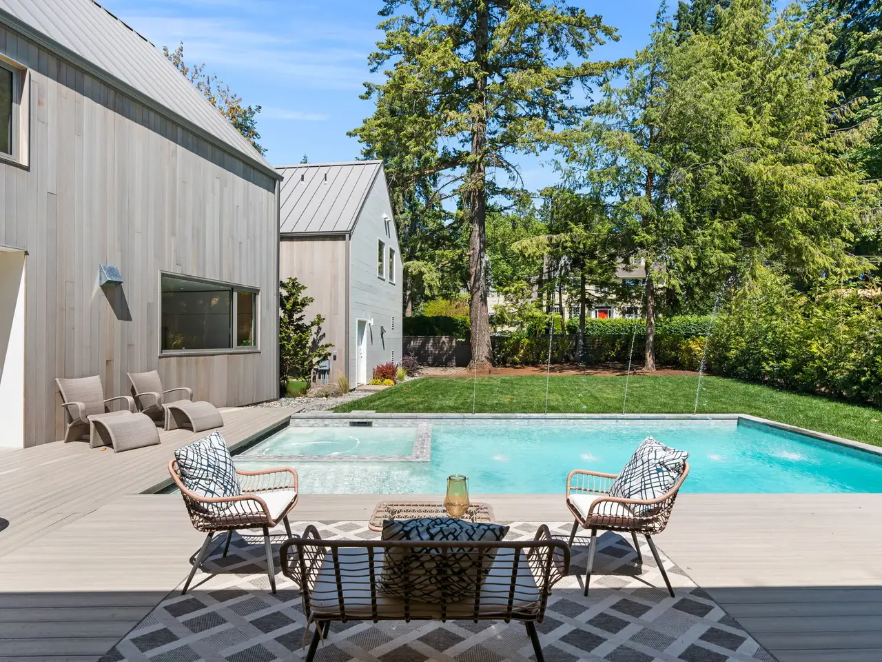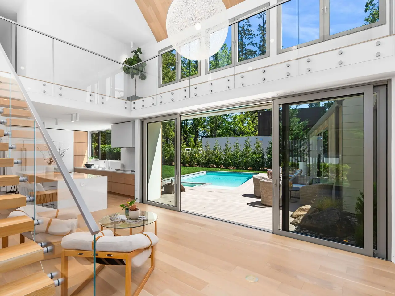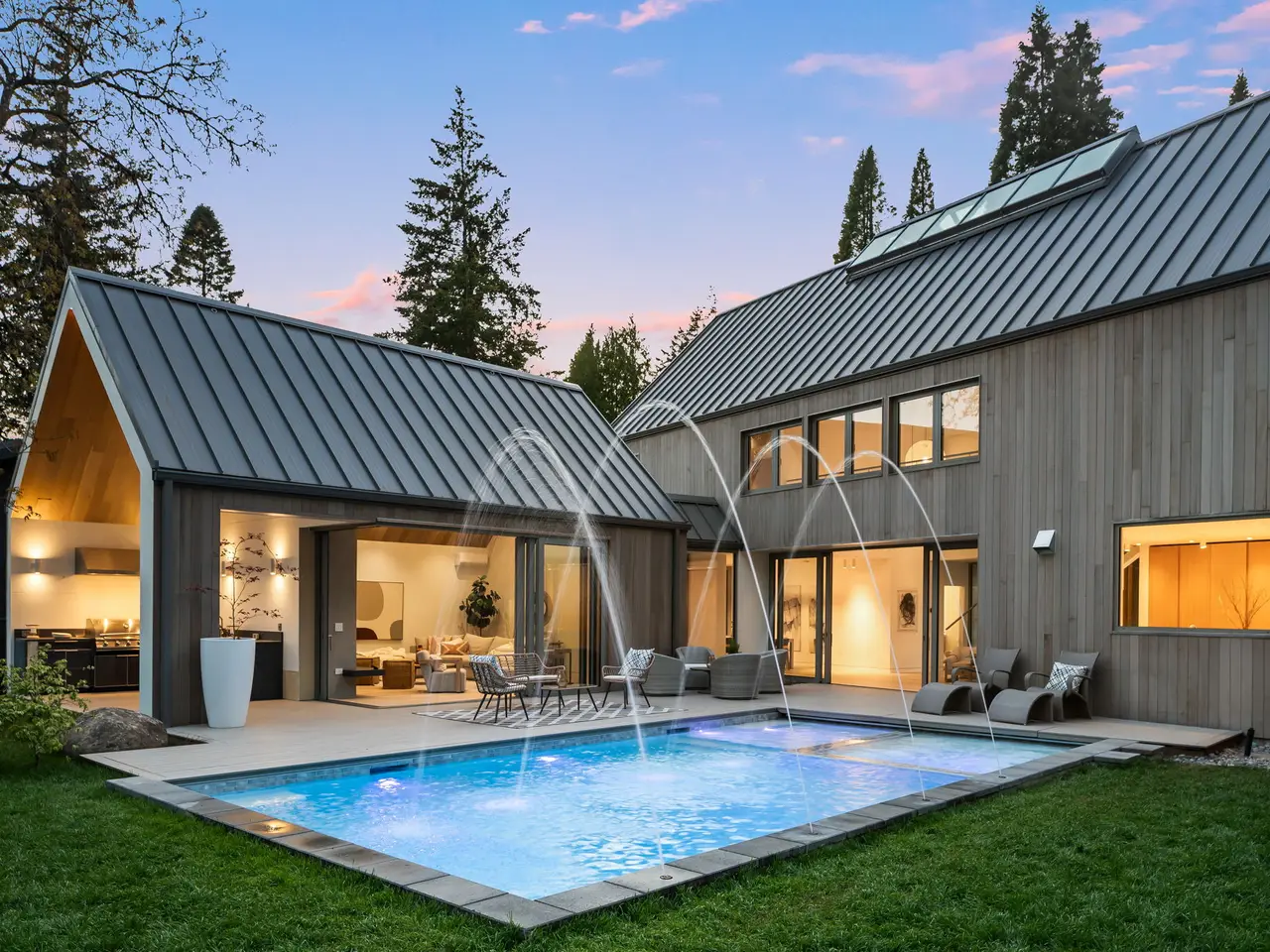 Villa M A Truly Custom Built Contemporary Scandinavian Farmhouse located in the sought-after Dunthorpe neighborhood. Stunning new construction, soaring 30-foot ceilings capped by glass, creating a light-filled living experience. Extensive use of custom white oak cabinetry throughout home, craftsmanship of a bygone era. High-end European windows and doors the pinnacle of form and function blurring the lines between interior and exterior. Transverse a glass hallway to the large living room where you're greeted by vaulted ceilings and a grand fireplace. Walls of glass part to open to the pool deck, and outdoor kitchen. Pool and spa with fountains, lighting, and automatic pool cover. Chef's kitchen with oversized island, waterfall edge, slab backsplash and high-end appliance package. Upper-level bedrooms with built-in closets and functional loft spaces, taking advantage of the opportunity presented by the voluminous vaulted ceilings. Primary suite with expansive built-in closet system, walls wrapped in white oak, primary bath with spacious wet room. Main level study with adjoining full bath and zero edge shower entry provide flexibility with accessibility. Sleek clean finishes, lighting choices, museum reveal baseboards, and zero trim doorways all flawlessly crafted and executed to compliment the refreshingly high-end modern aesthetic. Why wait to build? When you can have it all today!