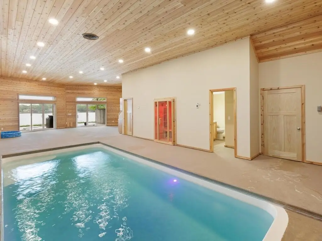 Experience luxury living at its finest with this new construction home on the pristine shores of Spring Lake. Offering nearly 5,000 sq. ft. of expansive living space, this home features 2 bedrooms on the main floor, including the luxurious primary suite, plus 2 additional bedrooms on the upper level. The open-concept main floor boasts vaulted ceilings, wood accents, and a floor-to-ceiling stone fireplace, creating a warm and inviting atmosphere. The spacious kitchen with a large center island flows into the great room and out to a large Trex deck, offering sweeping lake views. Upstairs, you'll find a loft area perfect for gaming or study. The lower level is an entertainer's dream with a 12' cedar ceiling, in-floor heating, an indoor heated pool, sauna, wet bar, and direct access to the lakefront patio. Above the garage, a bonus room offers endless possibilities, with easy access via spiral staircase or side garage door. Just minutes from Prior Lake Schools, parks, and year-round recreation, this home provides the ultimate lakefront lifestyle.