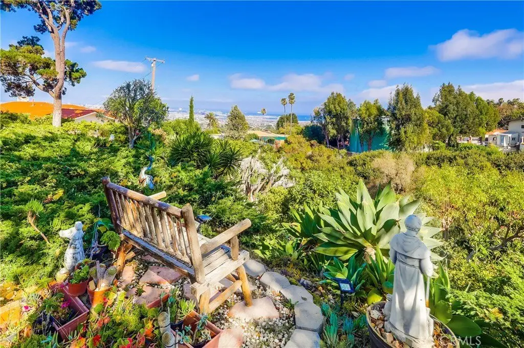 Experience breathtaking harbor and ocean views from nearly every room of this beautifully remodeled home, nestled at the southernmost point of LA County on the Palos Verdes Peninsula. Tucked away at the end of a quiet canyon, this property offers easy freeway access and is conveniently located just 25-30 minutes from both Long Beach and Los Angeles Airports. The home is thoughtfully designed with high-quality finishes, including numerous French doors that maximize the stunning views, elegant crown moldings, distressed hardwood floors, and plush carpeting in the bedrooms. The grand marble-inlaid entry leads seamlessly into the formal living room, dining room, and family room, boasting open-beamed ceilings and a wet bar. The gourmet kitchen is both stylish and functional, featuring granite countertops, a large peninsula with bar seating, and a sun-drenched breakfast nook where you can enjoy views from every angle. A beautiful bleached pine frame surrounds the brick fireplace in the living room, adding warmth and charm. This home offers TWO primary suites, each with panoramic views—one on each level—along with two additional view bedrooms, with access to private deck overlooking the terraced canyon. All four bathrooms have been tastefully remodeled, showcasing granite and tumbled marble accents. The expansive 19,543 sq ft lot is a gardener’s dream, with lush landscaping, an array of fruit trees, and vibrant vegetation. A spacious, flat grassy area off the kitchen and family room provides the perfect spot for family gatherings, all while soaking in the spectacular canyon, harbor, ocean, mountain, and city light views. Located within the renowned Palos Verdes Peninsula School District and just minutes from fine dining, shopping, hiking trails, Terranea Resort, and world-class golf courses, this peaceful, private retreat is a true gem. Meticulously maintained and move-in ready, this home exudes serenity and luxury.
