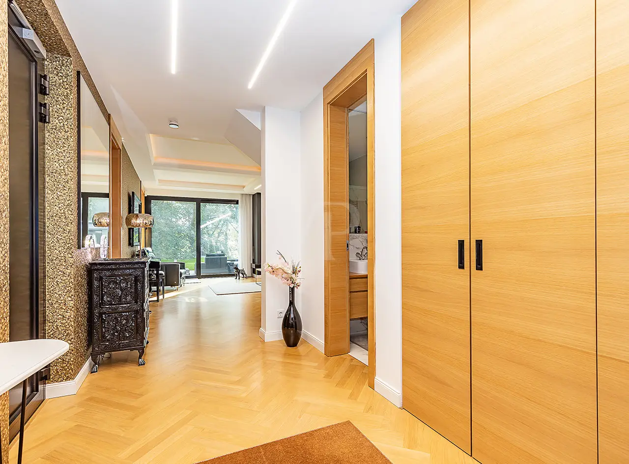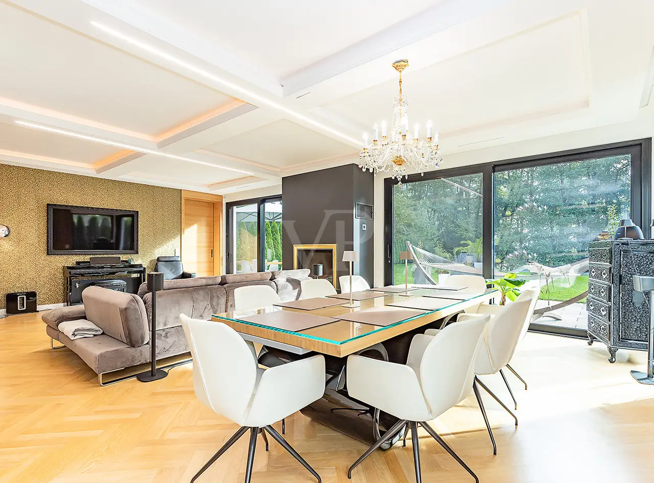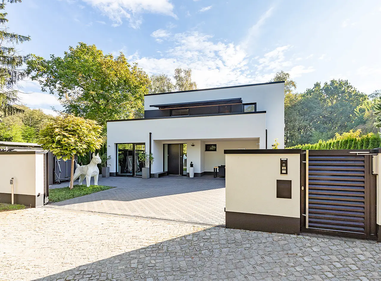 WELCOME to your dream villa, right next to the nature reserve! This special Bauhaus cube, which was built in 2018 in solid construction, impresses with its modern design and high-quality surfaces. The white cube looks imposing yet simple at the same time. As you enter the entrance on the first floor, you are greeted by brightness and an open living atmosphere. To the right of the entrance is a large checkroom with floor-to-ceiling built-in wardrobes. Everything is simple and clearly organized. To the left of the entrance is currently a study and the utility room. The guest WC is located opposite and there is also another office on the first floor. The overall interior design of the Bauhaus villa is underlined by special features, such as the approx. 2.80 meter high ceilings, the special heights of all windows and interior doors and the real wood parquet throughout the house (except bathrooms). Thanks to a controllable lighting concept - with coved lighting in the ceilings - the house can be set off in any mood. Oversized, floor-to-ceiling windows direct the view from all visual axes of the first floor into the green countryside. The property borders a nature reserve, so the view of the garden will always remain unobstructed. In the center of the living and dining area is a high-quality fireplace and another highlight on a reinforced concrete wall. A designer folding staircase covered with real wood (oak) leads to the upper floor. The first floor of the villa forms the focal point of the family's living space, where people gather around the long dining table, eat, work, chill by the fireplace or watch TV. The attractive staircase from the living area leads to the bright upper floor, which has been fitted with skylights in the roof. The air space - with all-round glass railings - emphasizes the transparency of the house. This is where the family's private rooms are located. The master bedroom with dressing room and en-suite bathroom, two children's bedrooms, a master bathroom and several exits to the balcony. The luxurious master bathroom has a large glass shower, a bathtub, two high-quality washbasins with mirror system, a WC and space for the washing machine and dryer. The balcony can also be accessed from here. Another highlight of the property is the view of the greenery. The property has an area of approx. 860 m² and is not visible to neighbors. Ornamental plants, hedges and ornamental shrubs have been planted for low-maintenance use. A lawn robot keeps the lawn short. A massive sauna house is located at the back of the garden, right next to the nature reserve. The sauna with panoramic window, the relaxation area with shower and the well-placed terrace in front complete the attractive living ensemble. The outdoor facilities are rounded off by the generous open spaces at the front of the house. A bicycle shed (aluminum) with storage space and another covered terrace directly below the balcony are located on the west side of the property. Two electric sliding entrance gates seal off the property from view. At least 4 parking spaces are available in front of the house. NOTE: The house will be handed over in consultation with the vendors.