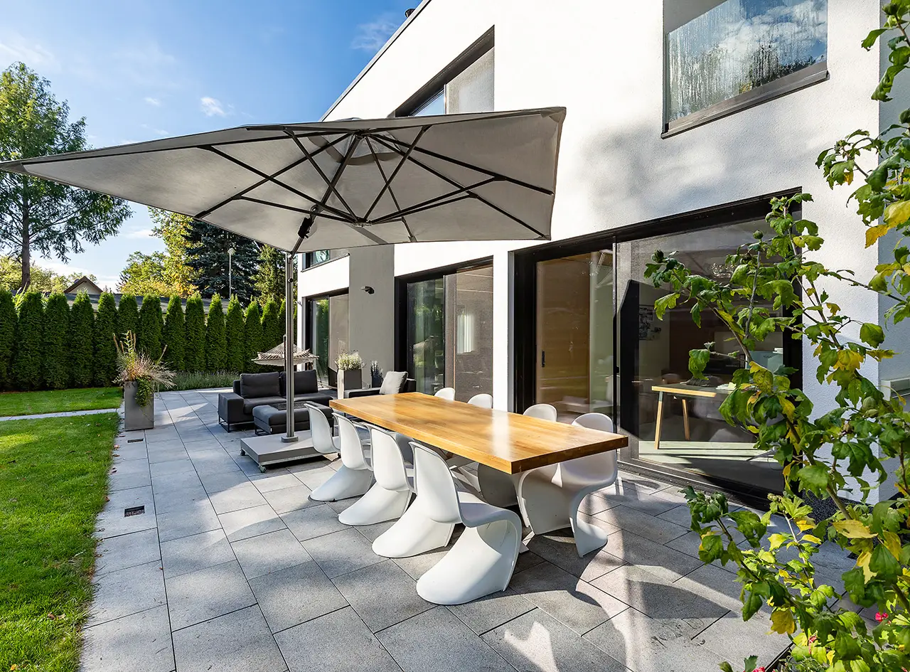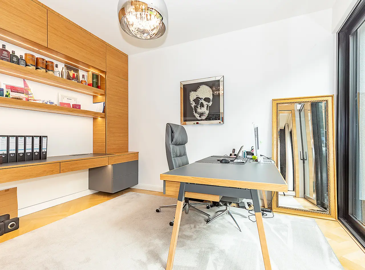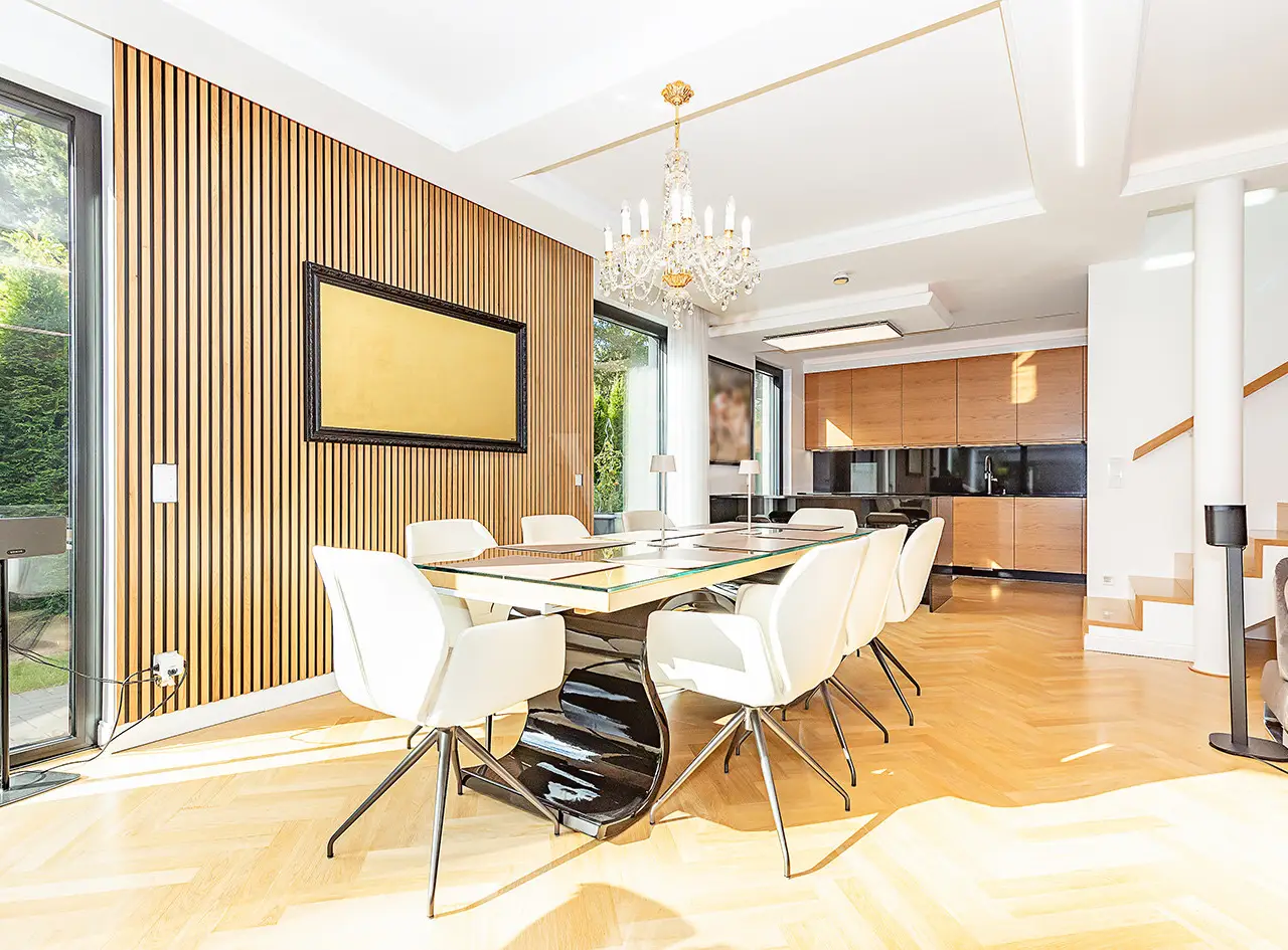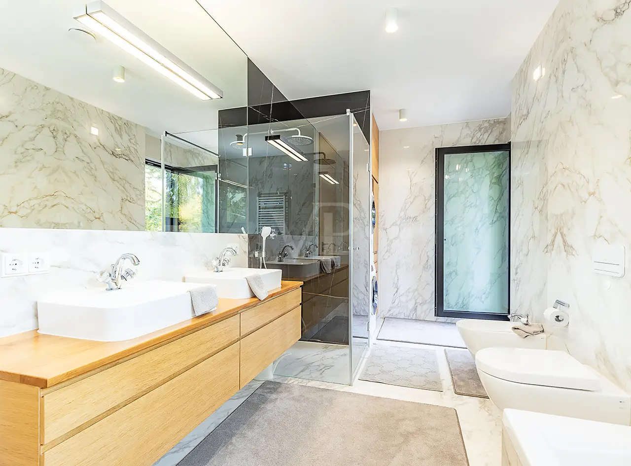 WELCOME to your dream villa, right next to the nature reserve! This special Bauhaus cube, which was built in 2018 in solid construction, impresses with its modern design and high-quality surfaces. The white cube looks imposing yet simple at the same time. As you enter the entrance on the first floor, you are greeted by brightness and an open living atmosphere. To the right of the entrance is a large checkroom with floor-to-ceiling built-in wardrobes. Everything is simple and clearly organized. To the left of the entrance is currently a study and the utility room. The guest WC is located opposite and there is also another office on the first floor. The overall interior design of the Bauhaus villa is underlined by special features, such as the approx. 2.80 meter high ceilings, the special heights of all windows and interior doors and the real wood parquet throughout the house (except bathrooms). Thanks to a controllable lighting concept - with coved lighting in the ceilings - the house can be set off in any mood. Oversized, floor-to-ceiling windows direct the view from all visual axes of the first floor into the green countryside. The property borders a nature reserve, so the view of the garden will always remain unobstructed. In the center of the living and dining area is a high-quality fireplace and another highlight on a reinforced concrete wall. A designer folding staircase covered with real wood (oak) leads to the upper floor. The first floor of the villa forms the focal point of the family's living space, where people gather around the long dining table, eat, work, chill by the fireplace or watch TV. The attractive staircase from the living area leads to the bright upper floor, which has been fitted with skylights in the roof. The air space - with all-round glass railings - emphasizes the transparency of the house. This is where the family's private rooms are located. The master bedroom with dressing room and en-suite bathroom, two children's bedrooms, a master bathroom and several exits to the balcony. The luxurious master bathroom has a large glass shower, a bathtub, two high-quality washbasins with mirror system, a WC and space for the washing machine and dryer. The balcony can also be accessed from here. Another highlight of the property is the view of the greenery. The property has an area of approx. 860 m² and is not visible to neighbors. Ornamental plants, hedges and ornamental shrubs have been planted for low-maintenance use. A lawn robot keeps the lawn short. A massive sauna house is located at the back of the garden, right next to the nature reserve. The sauna with panoramic window, the relaxation area with shower and the well-placed terrace in front complete the attractive living ensemble. The outdoor facilities are rounded off by the generous open spaces at the front of the house. A bicycle shed (aluminum) with storage space and another covered terrace directly below the balcony are located on the west side of the property. Two electric sliding entrance gates seal off the property from view. At least 4 parking spaces are available in front of the house. NOTE: The house will be handed over in consultation with the vendors.
