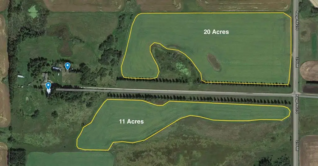 Fabulous opportunity with recent renovation upgrades! Invest in your future and enjoy complete privacy on this 80-acre parcel, located within Red Deer’s intermunicipal district along its eastern boundary. This property offers a wonderful rural lifestyle, a solid investment hold, dual-residence living, and multiple streams of farming income, including livestock, equestrian, solar, tree farming, market gardening, and grain. With its proximity to the city, this is a unique opportunity where your living investment is sure to appreciate over time. The property features a 2-storey main house (built in 1974), a mobile home (1991), a 24'x24' detached garage (1976), a 40'x26' insulated shop with cement flooring, a 50'x24' cold storage pole-style shop (1998), and numerous other outbuildings. The land is level, with approximately 32 acres of arable farmland featuring excellent soil quality, expansive pastures, low-lying areas, treed and brush sections, and a beautiful tree-lined driveway that leads from paved Range Road 270 to the yard site. The main home offers a functional layout with a main floor master bedroom, two living areas (one with a wood-burning fireplace), a kitchen complete with an indoor barbecue, and a renovated 2-piece bath. The expansive bonus room addition features a gas fireplace, patio doors to the south-facing deck, and a bar area perfect for entertaining. Upstairs, you'll find a roomy bedroom with a Juliette balcony, a 4-piece bathroom, and an adjoining space with two additional sleeping areas. The lower level is wide open and offers ample storage, a utility area, and Laundry. The well-maintained mobile home includes 2 bedrooms, 1 bathroom, upgraded vinyl windows (2007), a south-facing covered deck, and a parking shelter. Renovation highlights include new windows for both the house and mobile home (2007), a fully renovated main floor 2-piece bath, and a complete second floor renovation with new doors, trim, shower, flooring, and paint. Additional upgrades include shingles and siding on the house (2011) and a replacement of the septic tank (1992). Zoned A1 Future Urban Development District, this property allows for agricultural and related uses until the land is needed for urban development. This property is a rare combination of lifestyle, investment, income potential, and privacy—an opportunity that rarely comes along!