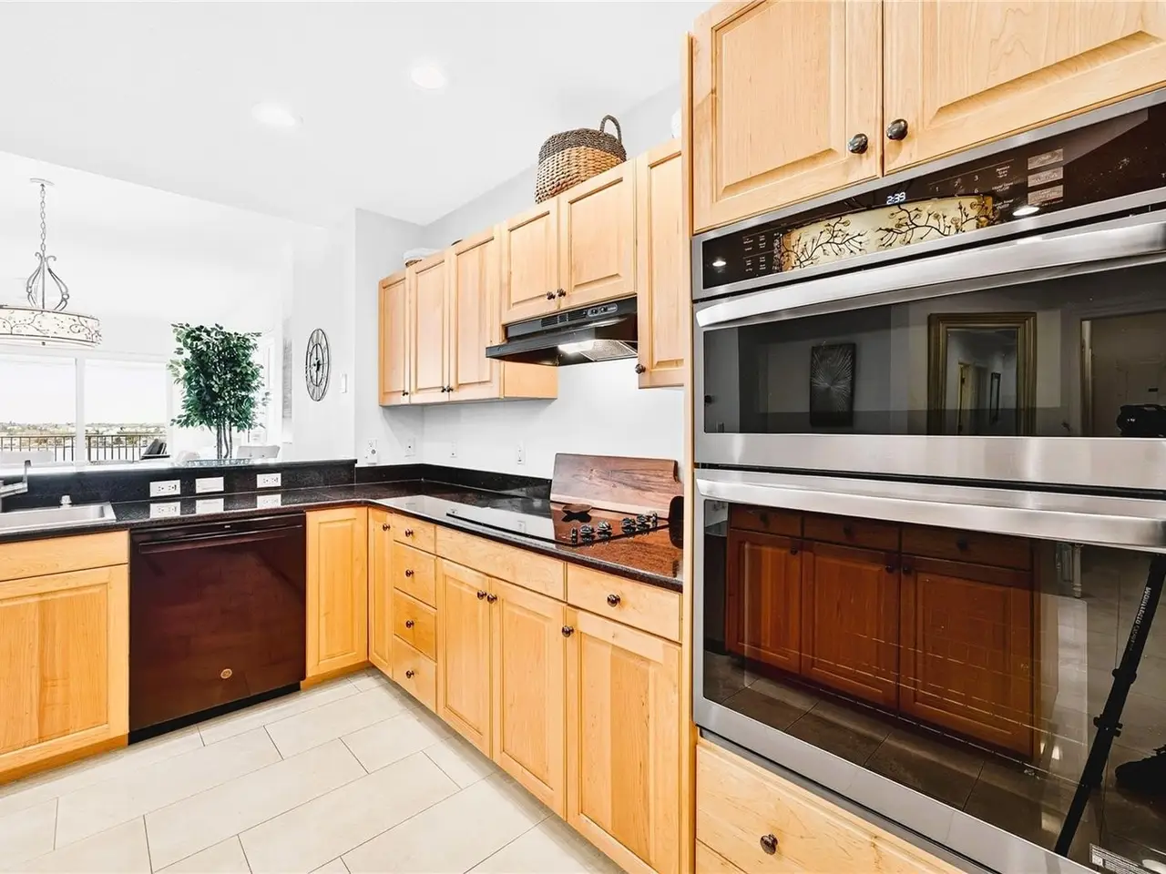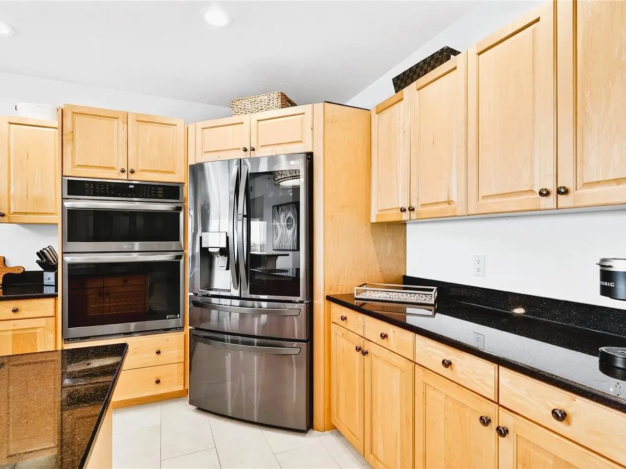 Gourmet kitchen with black granite countertops and stainless-steel appliances