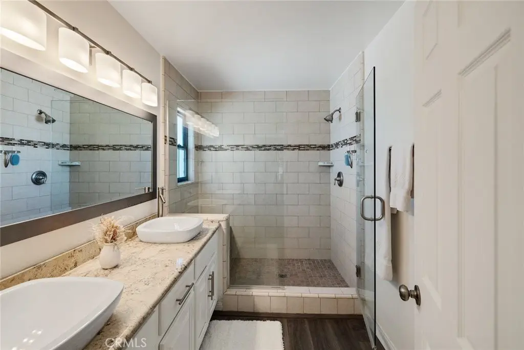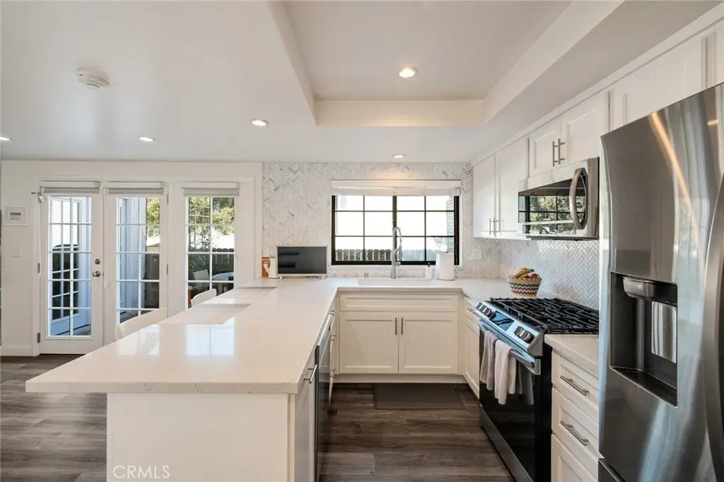 FULLY FURNISHED home for sale! Welcome to this bright and airy 3 bedroom/3-bathroom home that boasts 1900 square feet of comfortable living space, is West of PCH & a very short walk to the beach, pier, strand, restaurants, shopping, nightlife and comes fully furnished! What a package!! Just pack your bags and move right in! The main floor features a large and gorgeous fully remodeled kitchen with quartz countertops; quartz sink and Samsung appliances. Loaded with tons of cupboard space and a pantry. The super cozy living room comes equipped with a corner fireplace, beautiful waterproof oak-style flooring and a comfortably sized powder room. Upstairs you will find 2 bedrooms, each with their own en-suite bathrooms and vaulted ceilings. The primary bedroom has a walkout balcony and dual sinks in the bathroom. On the lowest level you will find an additional large bedroom which could also be used as a home office, home gym or a playroom for children! The home has direct garage access as well!