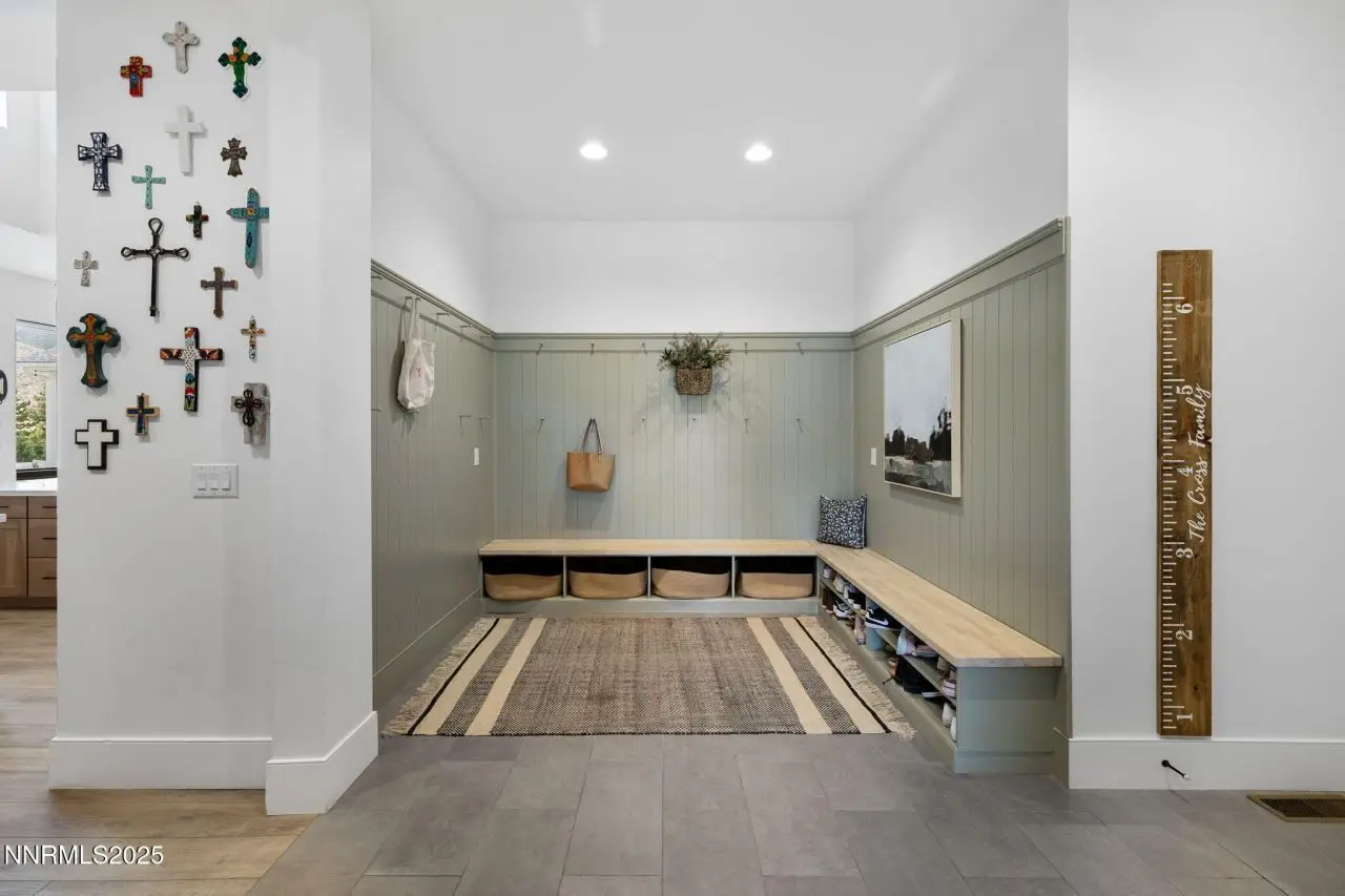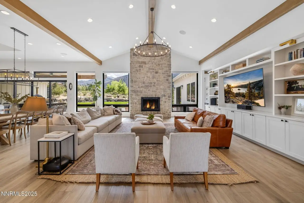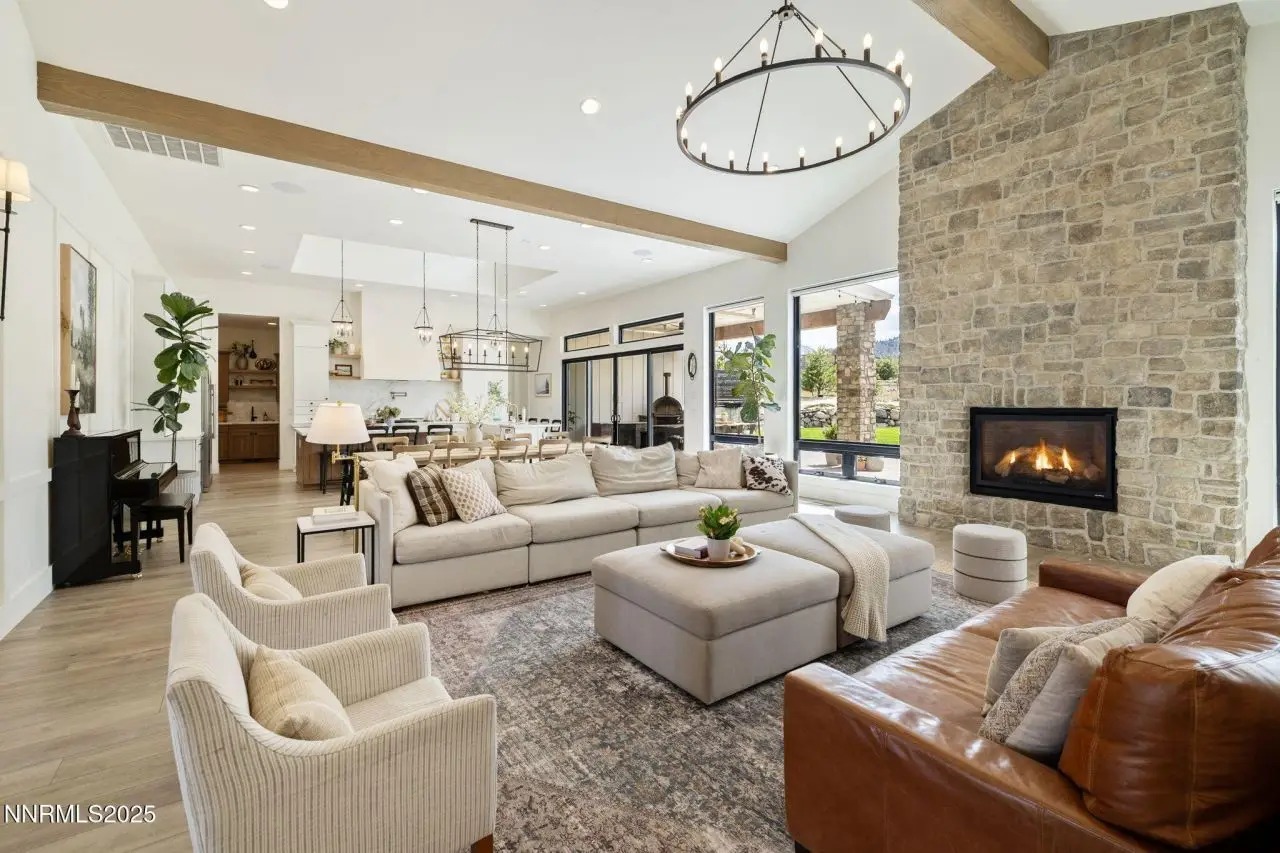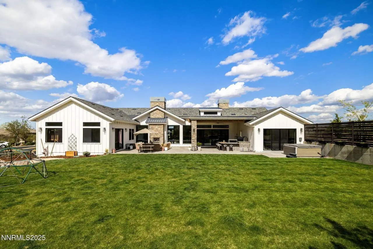 Tucked away on a one-acre corner lot, in a cul-de-sac within the prestigious gated Arrowcreek community, this 2021 single-story custom home offers an exceptional blend of modern elegance and timeless charm. Spanning 4,608 square feet, this thoughtfully designed 5-bedroom, 5.5-bathroom residence features en-suite bathrooms for every bedroom, a dedicated office, and a spacious game room-perfect for both relaxation and entertaining. Clean architectural lines, natural materials, and refined finishes bring a sense of sophisticated comfort to every room, while panoramic mountain views create a breathtaking backdrop. The heart of the home is the chef's kitchen, outfitted with an oversized refrigerator, two dishwashers, a deep farmhouse sink, and custom cabinetry. Culinary enthusiasts will love the six-burner gas range, four ovens, and marble countertops that elevate both style and function. A large center island provides ample space for cooking and gathering, while an oversized pantry, beverage fridge, butler's pantry with an ice maker and more ensure every detail and space has been thoughtfully designed. The primary suite is a private retreat featuring a luxurious walk-in closet with custom built-ins, dual sinks, a large soaking tub, and a spacious walk-in shower. This home also includes a full home audio system, advanced security cameras, Home Assistant smart lighting, and a Lutron Serena automatic blind system, double laundry hook ups and a drinking water fountain in the mudroom - all offering seamless convenience and elevated comfort throughout. Step outside to enjoy resort-style amenities including a fully equipped outdoor kitchen with a built-in BBQ, small refrigerator, overhead electric heaters on the covered patio, and an in-ground trampoline-ideal for lively gatherings or peaceful evenings under the stars. This is elevated single-story living at its finest, in one of Reno's most coveted communities. Arrowcreek is a 24-hour guard gated community Championship Golf Course Community. The HOA includes the tennis courts, swimming pools, exercise facility, entertainment room and over 26 miles of walking and hiking trails. Located about 20 minutes from Mt Rose Ski Resort and the Reno Tahoe International Airport.