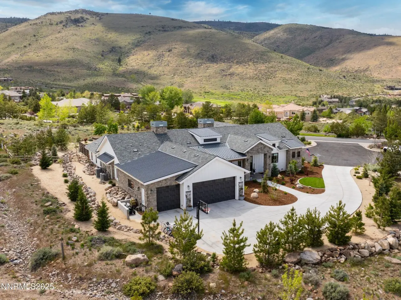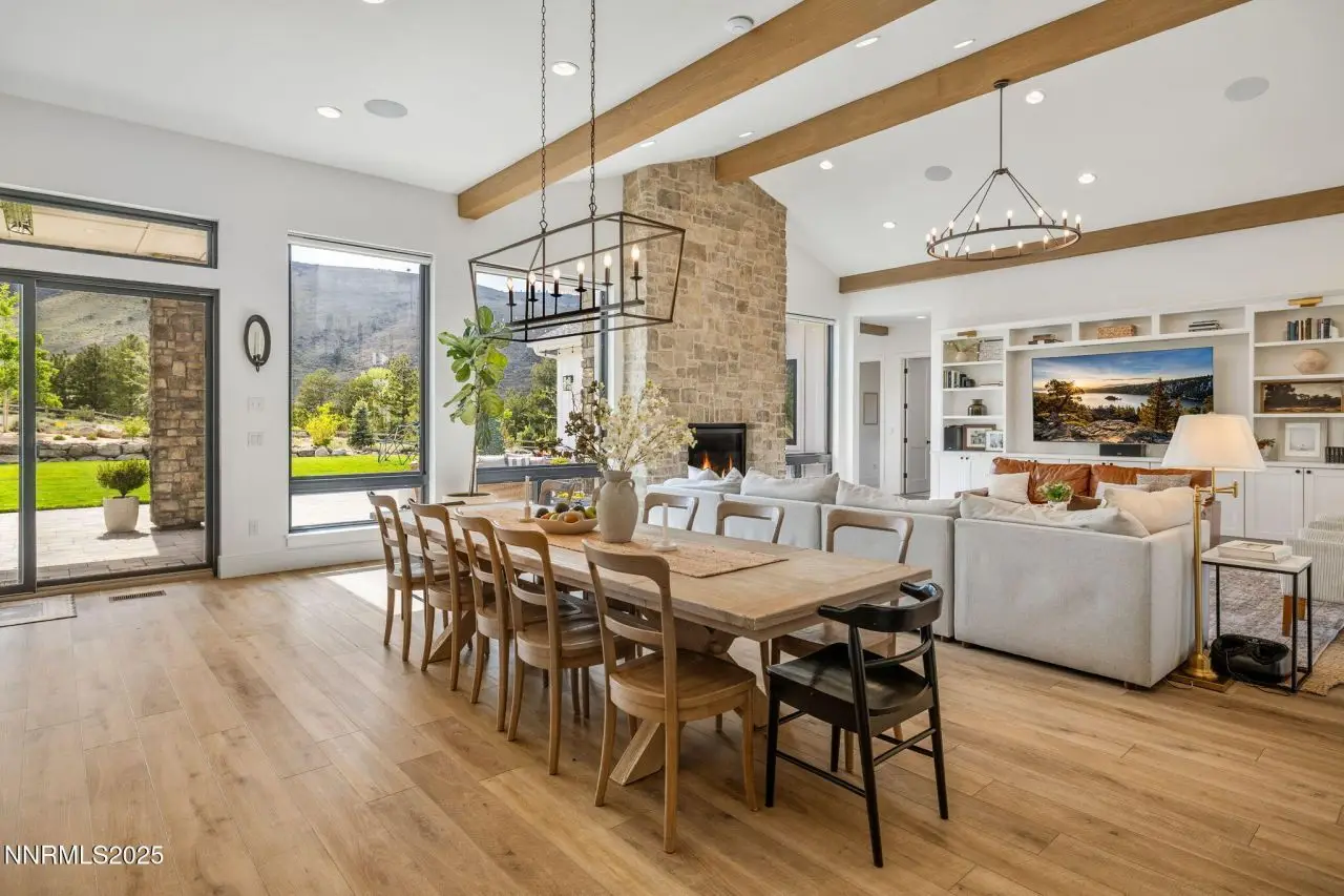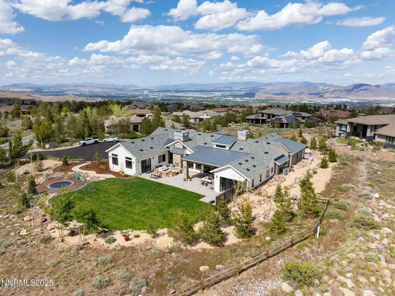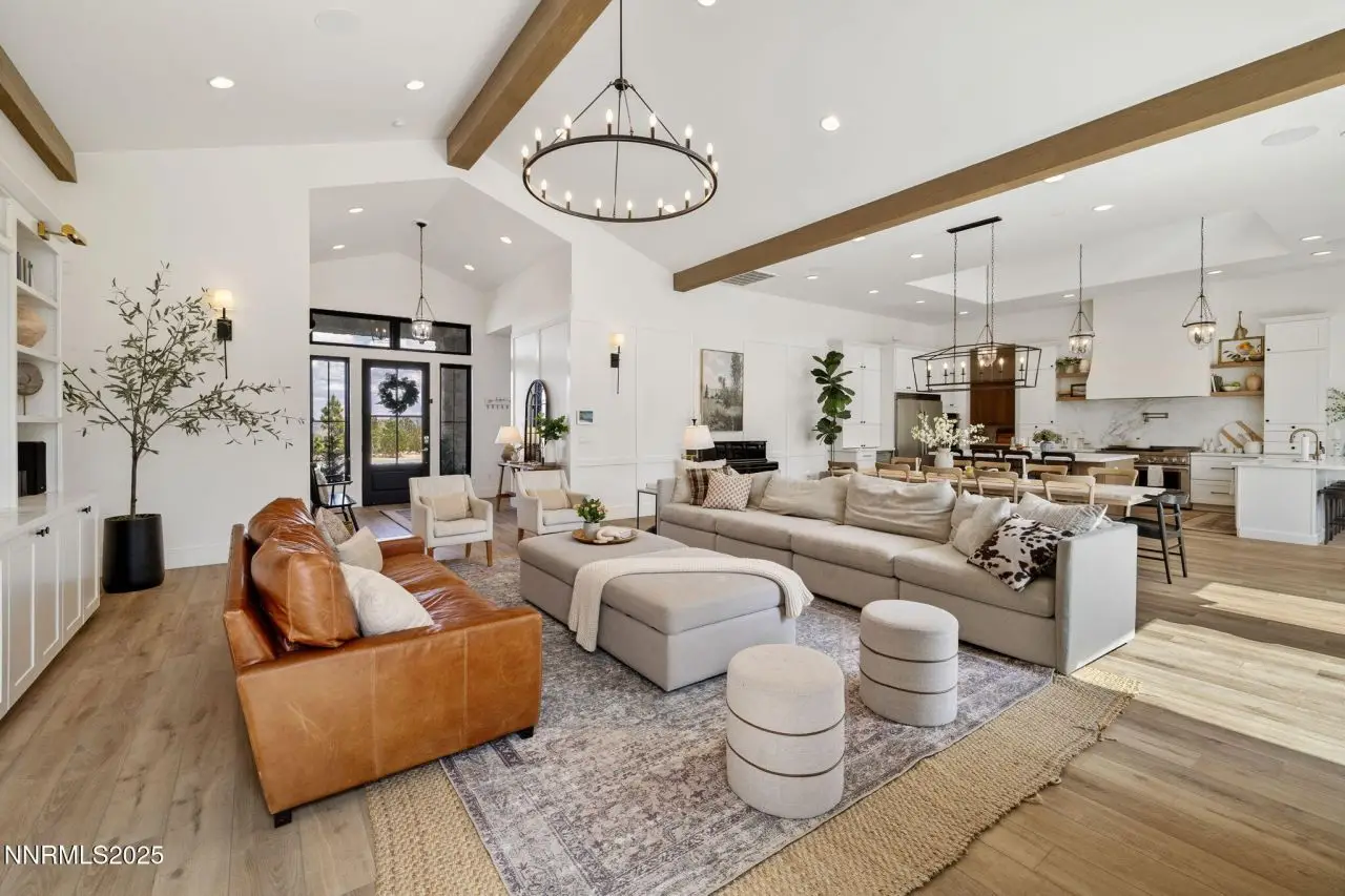 Tucked away on a one-acre corner lot, in a cul-de-sac within the prestigious gated Arrowcreek community, this 2021 single-story custom home offers an exceptional blend of modern elegance and timeless charm. Spanning 4,608 square feet, this thoughtfully designed 5-bedroom, 5.5-bathroom residence features en-suite bathrooms for every bedroom, a dedicated office, and a spacious game room-perfect for both relaxation and entertaining. Clean architectural lines, natural materials, and refined finishes bring a sense of sophisticated comfort to every room, while panoramic mountain views create a breathtaking backdrop. The heart of the home is the chef's kitchen, outfitted with an oversized refrigerator, two dishwashers, a deep farmhouse sink, and custom cabinetry. Culinary enthusiasts will love the six-burner gas range, four ovens, and marble countertops that elevate both style and function. A large center island provides ample space for cooking and gathering, while an oversized pantry, beverage fridge, butler's pantry with an ice maker and more ensure every detail and space has been thoughtfully designed. The primary suite is a private retreat featuring a luxurious walk-in closet with custom built-ins, dual sinks, a large soaking tub, and a spacious walk-in shower. This home also includes a full home audio system, advanced security cameras, Home Assistant smart lighting, and a Lutron Serena automatic blind system, double laundry hook ups and a drinking water fountain in the mudroom - all offering seamless convenience and elevated comfort throughout. Step outside to enjoy resort-style amenities including a fully equipped outdoor kitchen with a built-in BBQ, small refrigerator, overhead electric heaters on the covered patio, and an in-ground trampoline-ideal for lively gatherings or peaceful evenings under the stars. This is elevated single-story living at its finest, in one of Reno's most coveted communities. Arrowcreek is a 24-hour guard gated community Championship Golf Course Community. The HOA includes the tennis courts, swimming pools, exercise facility, entertainment room and over 26 miles of walking and hiking trails. Located about 20 minutes from Mt Rose Ski Resort and the Reno Tahoe International Airport.