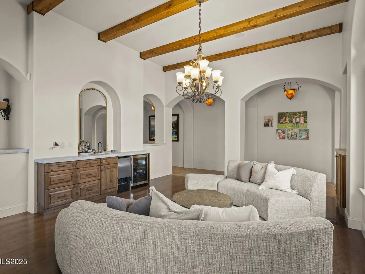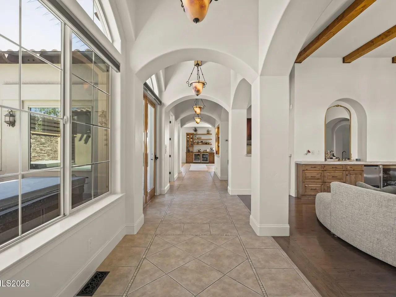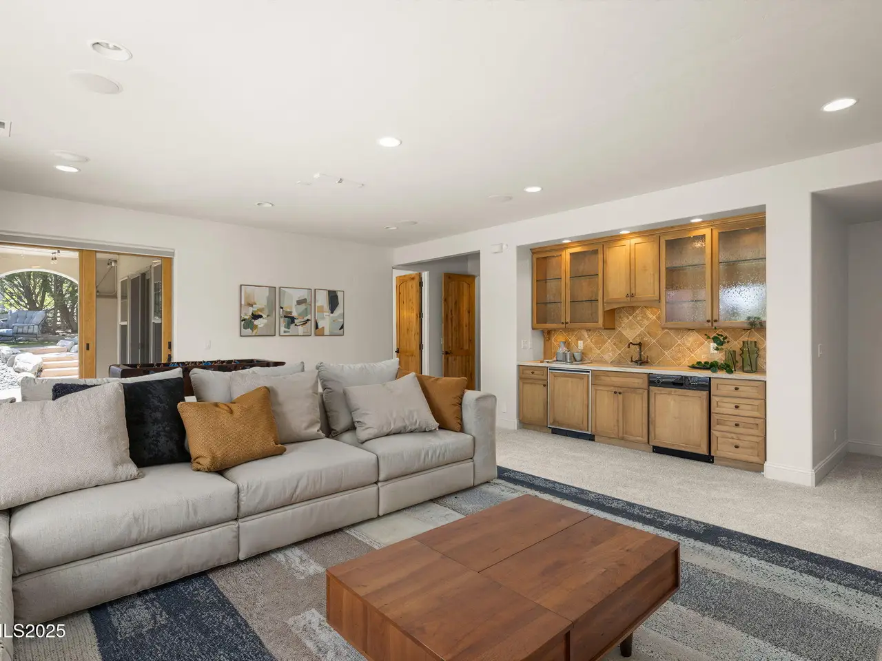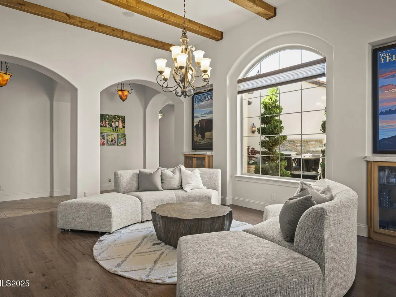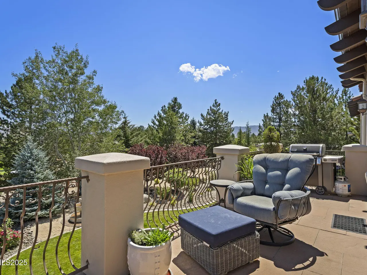 Welcome to this stunning luxury estate property, located in the prestigious Saddlehorn community. Nestled on a serene cul-de-sac, this exquisite 5 bedroom, 5 1/2 bath residence has undergone a multitude of designer renovations, offering the finest in upscale living. The chef's kitchen is a true showpiece—featuring leathered Taj Mahal quartzite countertops, two built-in refrigerators, dual Bosch dishwashers, warming drawers, added custom soft-close cabinetry, and three spacious pantries. Expanded custom built-ins elevate both functionality and elegance, making this kitchen a culinary dream. Relax and unwind in the spa-inspired primary suite on the main level which includes a steam shower, gas fireplace, custom lighting, and sophisticated tilework. Downstairs you will find a spacious in-law suite including its own kitchenette with l Leather Taj Mahal quartzite counter, new sink, dishwasher, and beverage fridge- plus a versatile bonus space perfect for a game room, home theater, or additional living quarters creating the ultimate entertaining space, and two additional private bedrooms with ensuites. Additional interior highlights include a double-sided gas fireplace between the living and great rooms, a custom bunk room with exposed beam detail, a private man cave, updated designer lighting, and extensive electrical upgrades throughout. Step outside to enjoy the resort-style grounds—complete with an expanded paver patio, grand fountain, raised vegetable gardens, privacy hedging, and a swim spa with new pump & cover, custom decking for easy maintenance access. A built-in outdoor BBQ with griddle enhances alfresco living. Premium appliances include two washers, two dryers, five beverage refrigerators, and so much more. This turnkey luxury retreat combines timeless elegance with modern comfort in one of Reno's most sought-after neighborhoods. See newly remodeled upgrade list in documents for additional information.