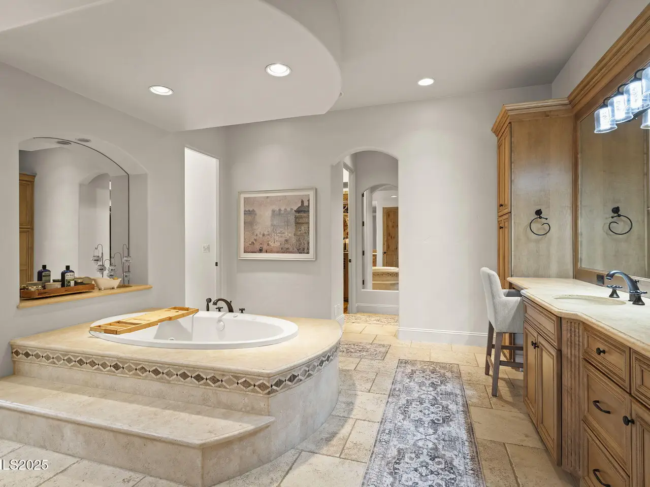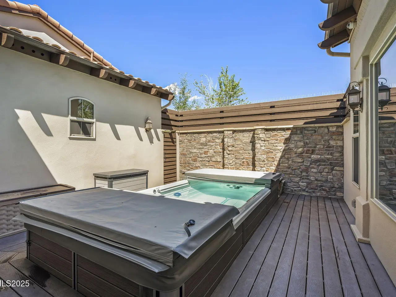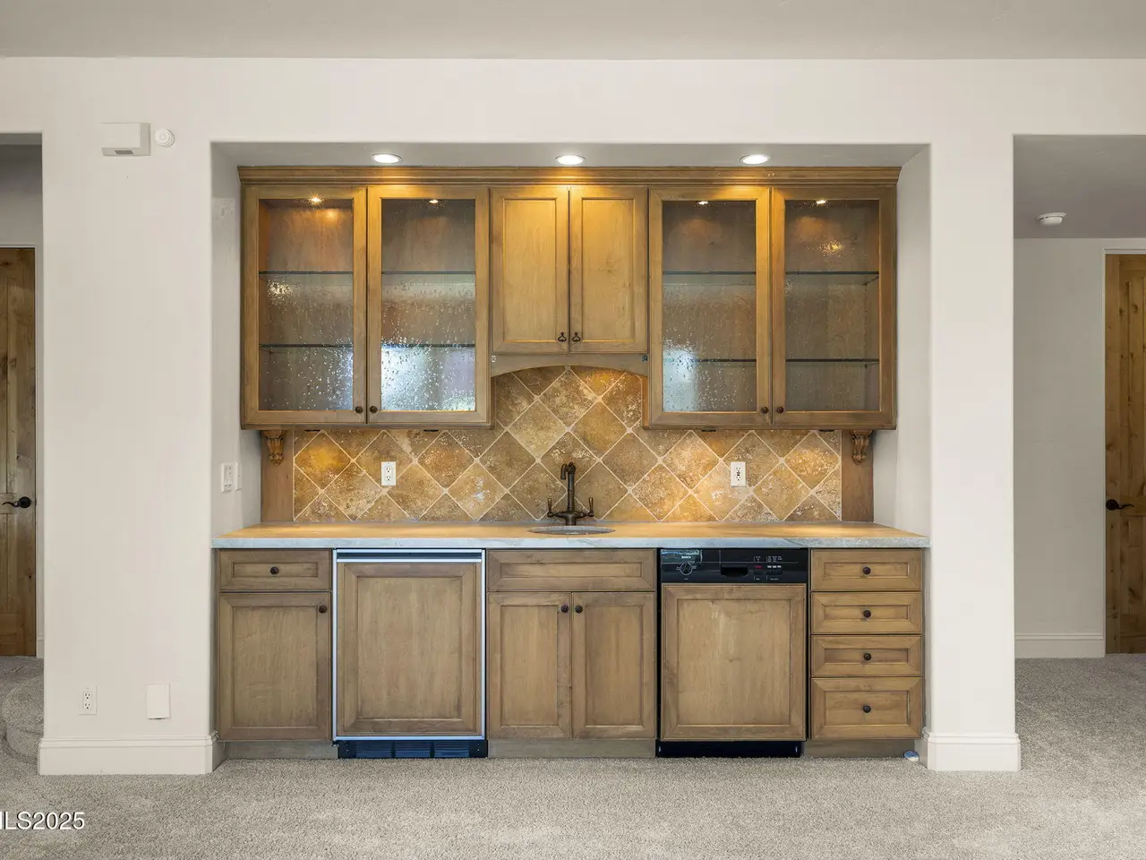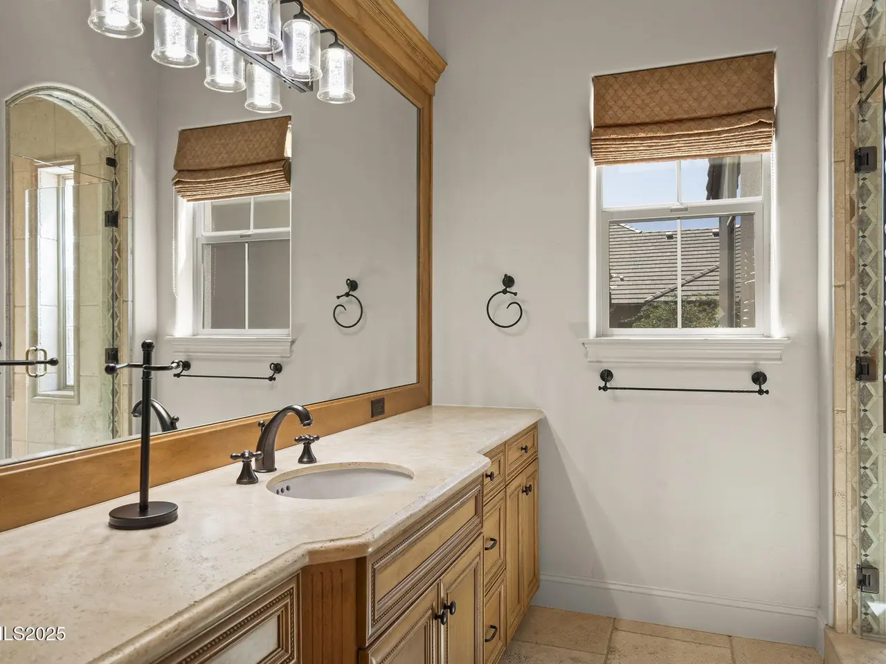 Welcome to this stunning luxury estate property, located in the prestigious Saddlehorn community. Nestled on a serene cul-de-sac, this exquisite 5 bedroom, 5 1/2 bath residence has undergone a multitude of designer renovations, offering the finest in upscale living. The chef's kitchen is a true showpiece—featuring leathered Taj Mahal quartzite countertops, two built-in refrigerators, dual Bosch dishwashers, warming drawers, added custom soft-close cabinetry, and three spacious pantries. Expanded custom built-ins elevate both functionality and elegance, making this kitchen a culinary dream. Relax and unwind in the spa-inspired primary suite on the main level which includes a steam shower, gas fireplace, custom lighting, and sophisticated tilework. Downstairs you will find a spacious in-law suite including its own kitchenette with l Leather Taj Mahal quartzite counter, new sink, dishwasher, and beverage fridge- plus a versatile bonus space perfect for a game room, home theater, or additional living quarters creating the ultimate entertaining space, and two additional private bedrooms with ensuites. Additional interior highlights include a double-sided gas fireplace between the living and great rooms, a custom bunk room with exposed beam detail, a private man cave, updated designer lighting, and extensive electrical upgrades throughout. Step outside to enjoy the resort-style grounds—complete with an expanded paver patio, grand fountain, raised vegetable gardens, privacy hedging, and a swim spa with new pump & cover, custom decking for easy maintenance access. A built-in outdoor BBQ with griddle enhances alfresco living. Premium appliances include two washers, two dryers, five beverage refrigerators, and so much more. This turnkey luxury retreat combines timeless elegance with modern comfort in one of Reno's most sought-after neighborhoods. See newly remodeled upgrade list in documents for additional information.