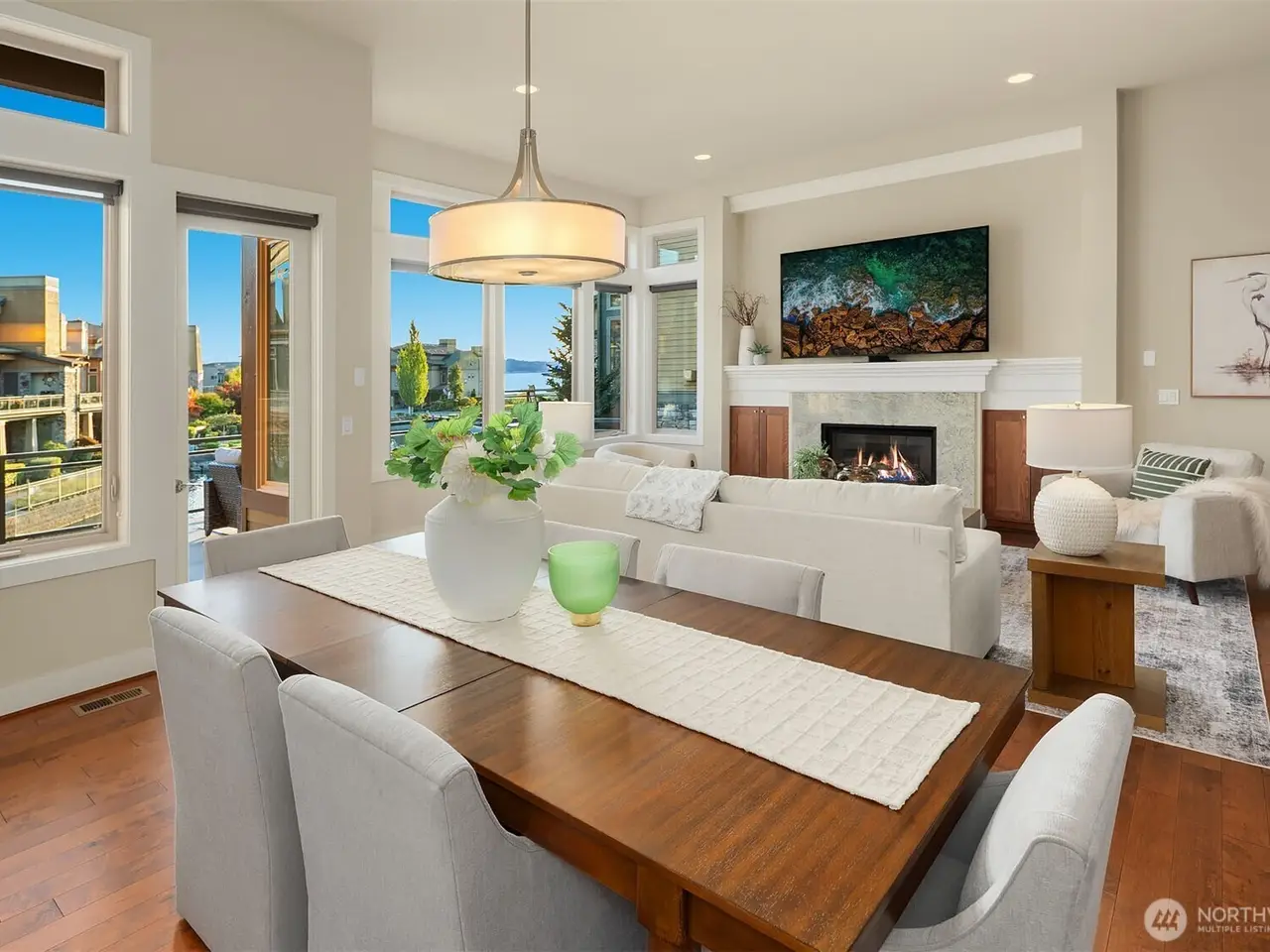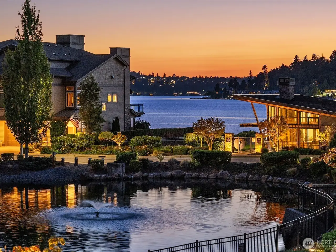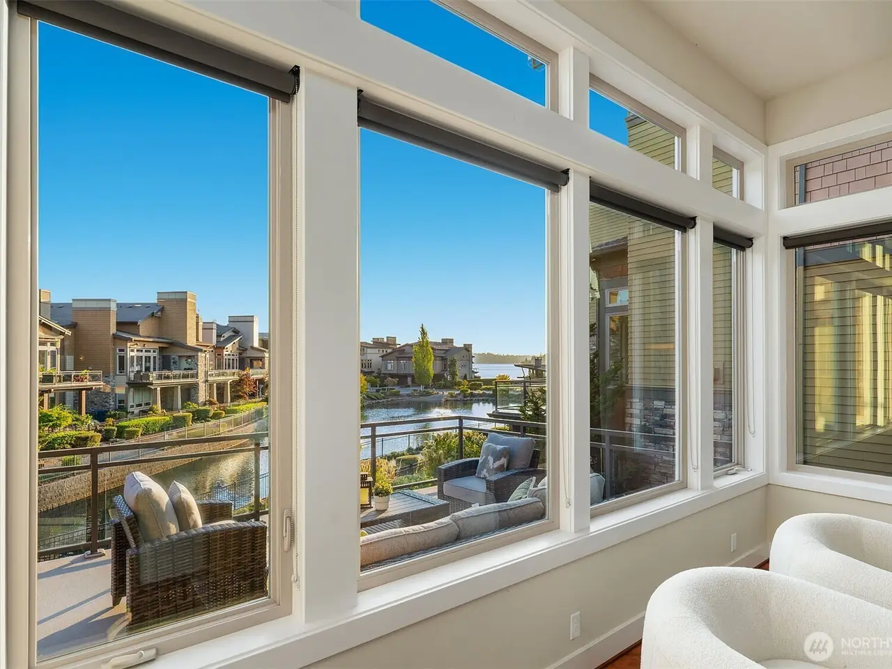 • Large windows with lake views