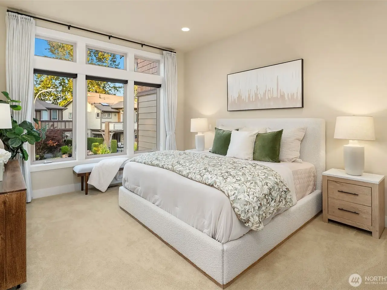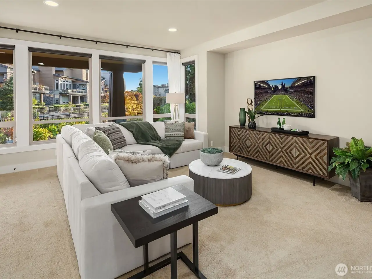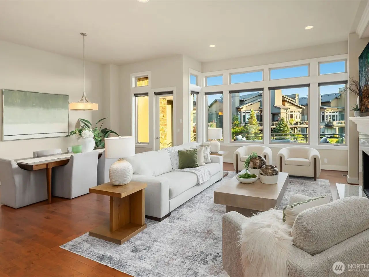 • Large windows with lake views