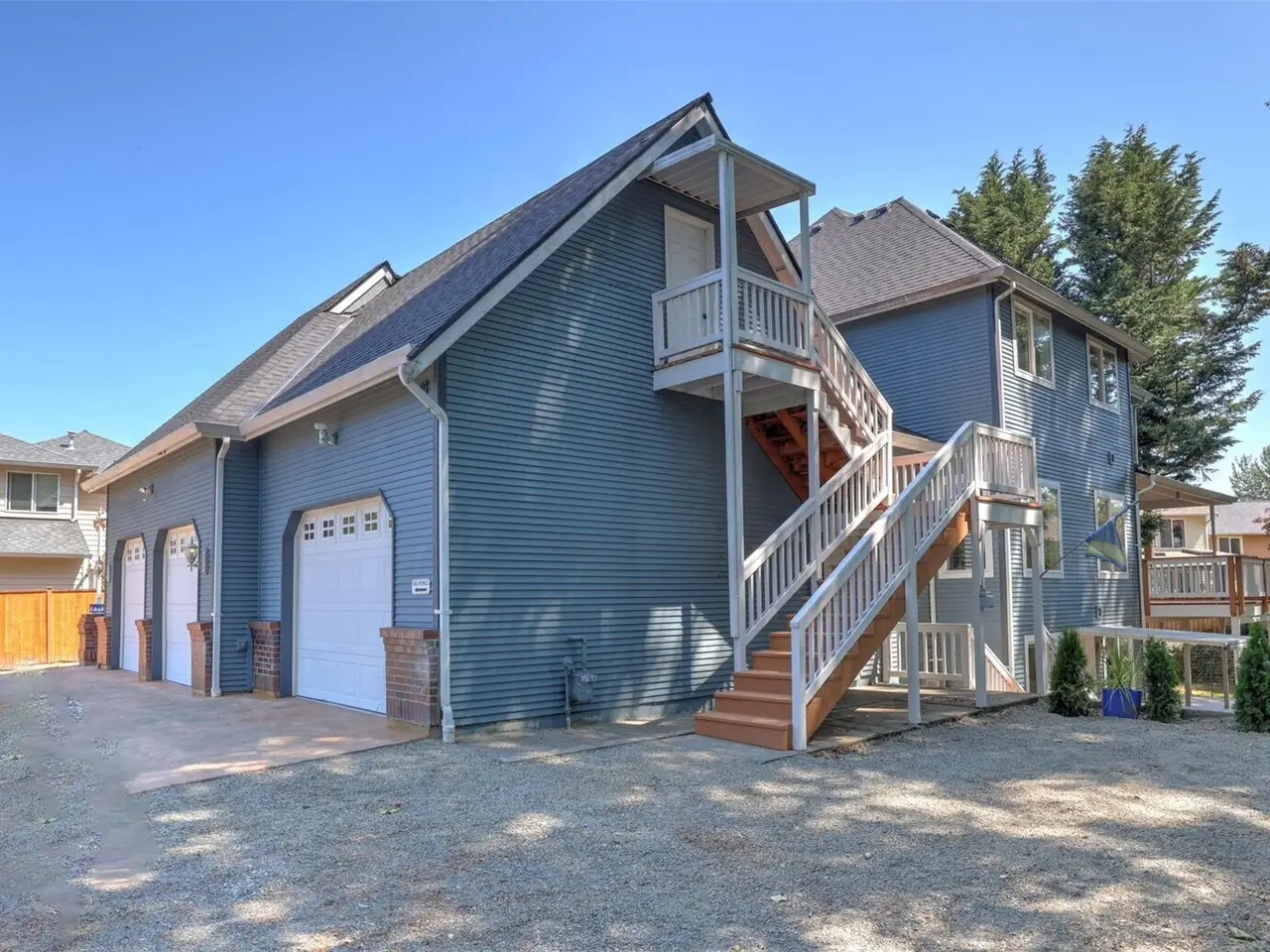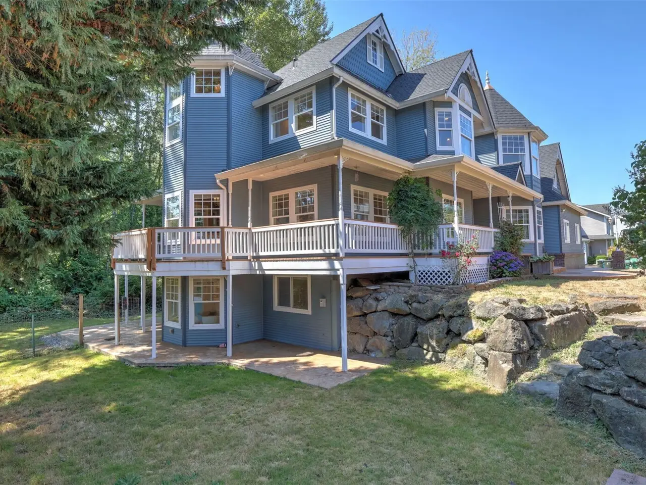 Beautiful custom-built Victorian mansion nestled in lush greenery, offering exceptional privacy and elevated charm. Showcasing intricate gables, turret-style windows and luxury wainscoting. Thoughtfully updated with fresh interior paint, new carpet, newer roof and brand new appliances in both kitchens. Equipped with A/C and 2 hot water tanks for year-round comfort and efficiency. Upper level features a spacious primary suite and a junior suite. Perfect for extended living or rental income from the 1,490 SqFt basement suite with separate entrance includes family room with fireplace, 1 bedroom, 1 bath, den and full kitchen. 3-car Garage, RV & Boat parking and ample storage. A unique home that blends timeless style with modern comforts.