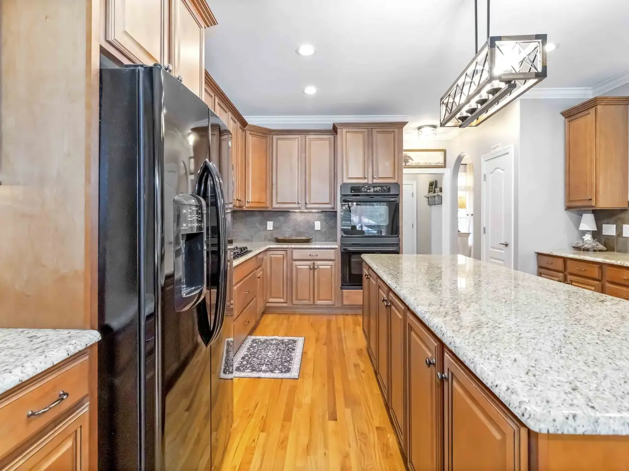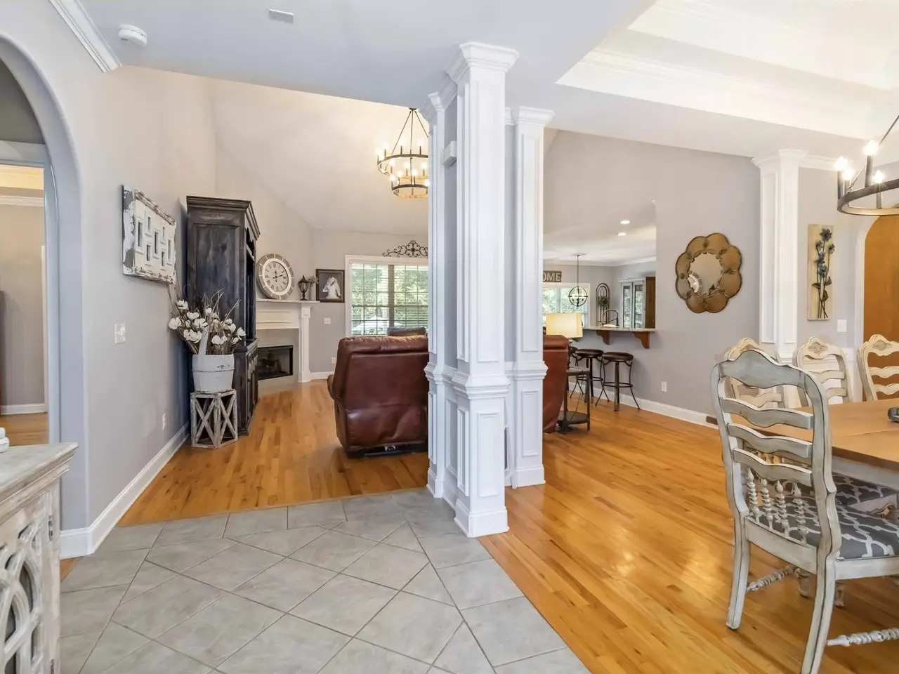 Beautiful four-bedroom, three and a half bath ranch with over 3,300 sq ft, featuring high ceilings, hardwood floors, and open living/kitchen space with a gas fireplace. The kitchen boasts a large island, a gas cooktop, double ovens, and ample storage. Spacious primary suite with double tray ceiling, updated bath, soaking tub, and separate shower. Two guest rooms on the main floor with new carpet. Upstairs bonus/4th bedroom includes a walk-in closet and full bath. Enjoy covered front and rear porches, in-ground pool with pergola, 2-car attached garage plus 1-car detached garage, all on a lush Bermuda lawn-perfect for entertaining and everyday living. The home also boasts a new roof & HVAC in 2023 and a new water heater in 2022