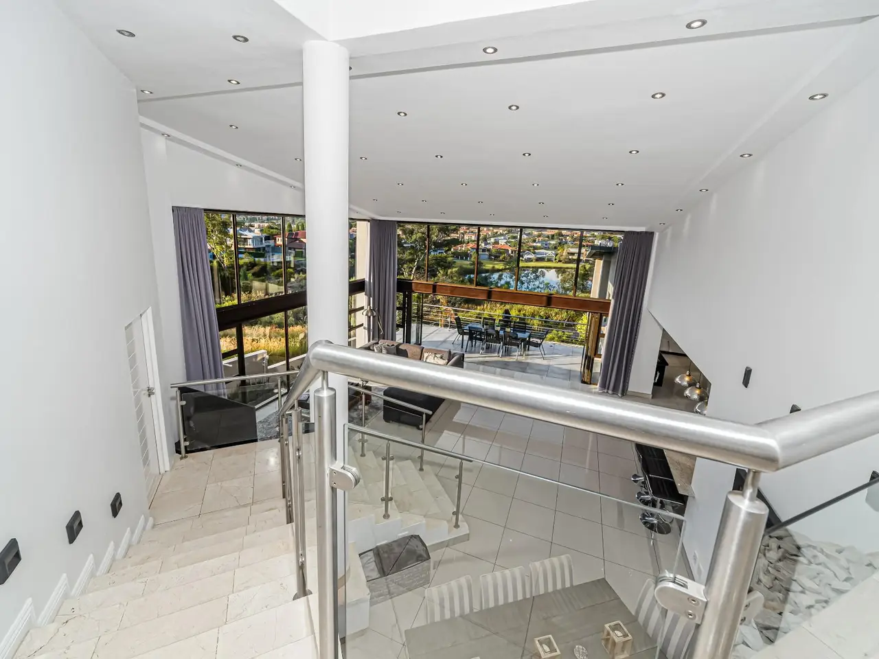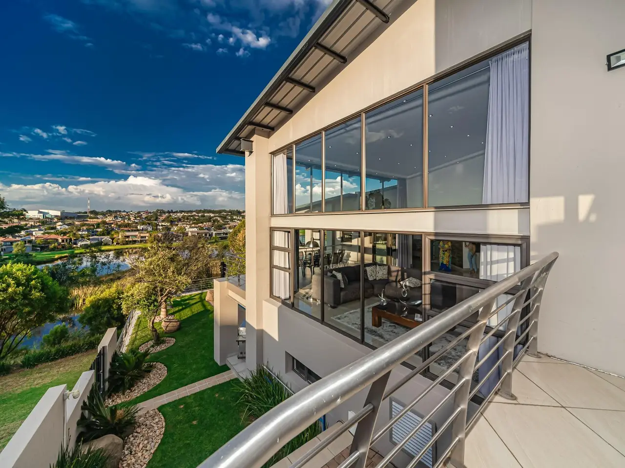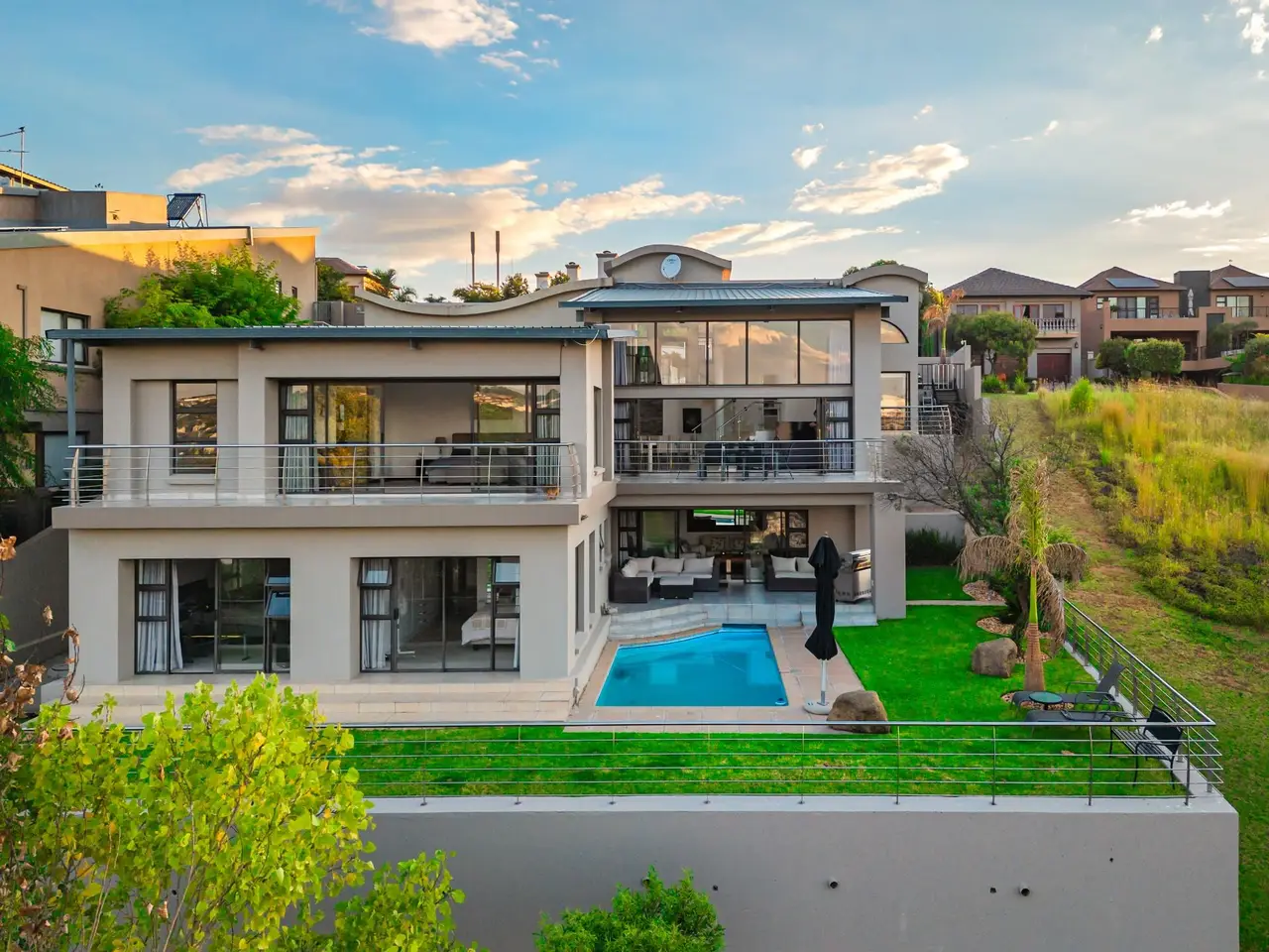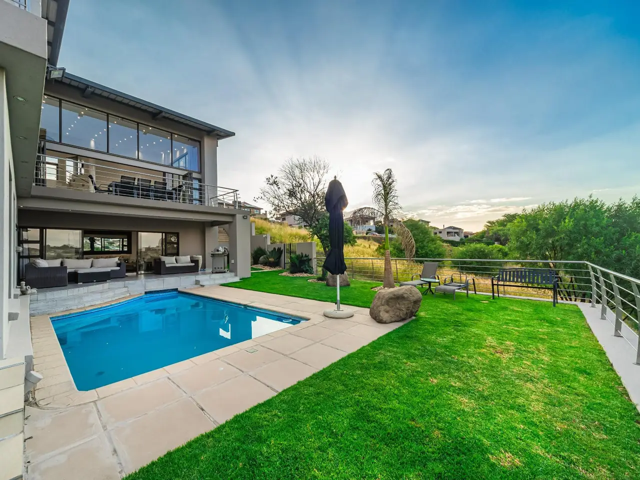 Positioned on the golf course, it offers spectacular views of the golf course and surrounding lakes. A magnificent home is set apart from the rest. This North facing home is situated in a quiet part of the Estate, next to a greenbelt area offering you tranquillity and privacy. There is a guest suite on the upper level. There is also a study on this level. The double volume main living area include an open plan with lounge, dining room and gourmet kitchen that all open up with stacking doors. The lower level has a sunning entertainment area. A spacious lounge that opens onto a covered patio and pool area. There is a separate entertainment room with built-in bar. There are 4 enormous bedrooms all en-suite, and all have gorgeous views of the golf course and fishing dams. There are 3 garages with plenty of off road parking. Staff accommodation and a large area that could be used as second study or extra bedroom.
