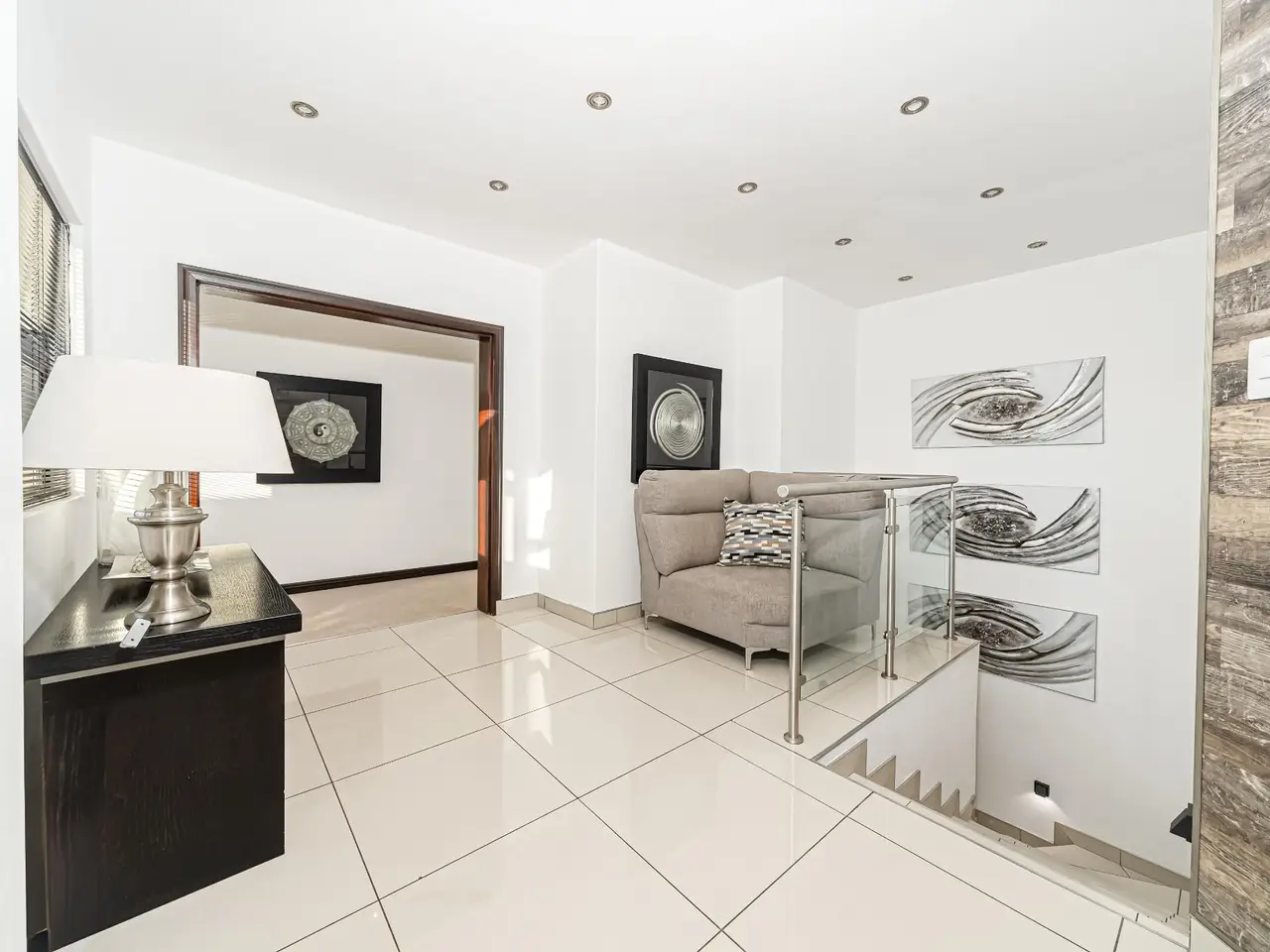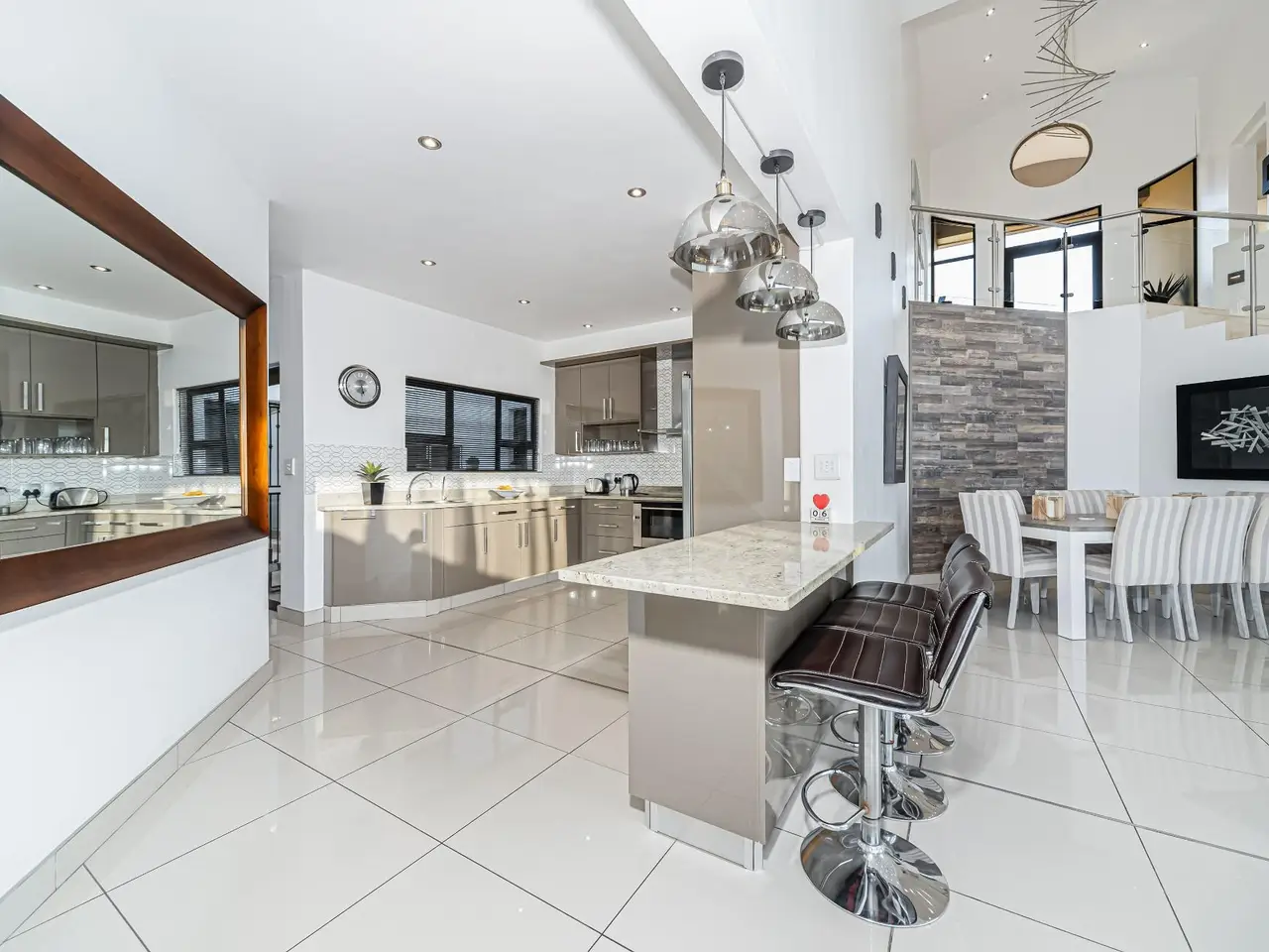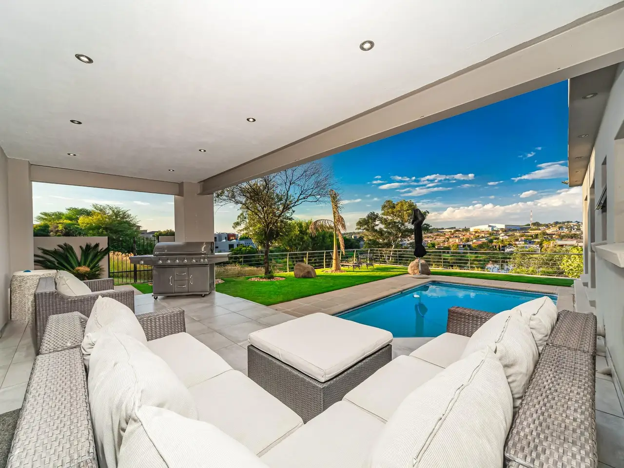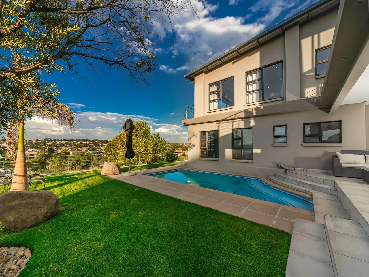 Positioned on the golf course, it offers spectacular views of the golf course and surrounding lakes. A magnificent home is set apart from the rest. This North facing home is situated in a quiet part of the Estate, next to a greenbelt area offering you tranquillity and privacy. There is a guest suite on the upper level. There is also a study on this level. The double volume main living area include an open plan with lounge, dining room and gourmet kitchen that all open up with stacking doors. The lower level has a sunning entertainment area. A spacious lounge that opens onto a covered patio and pool area. There is a separate entertainment room with built-in bar. There are 4 enormous bedrooms all en-suite, and all have gorgeous views of the golf course and fishing dams. There are 3 garages with plenty of off road parking. Staff accommodation and a large area that could be used as second study or extra bedroom.