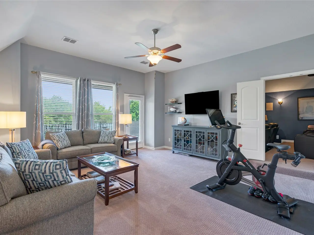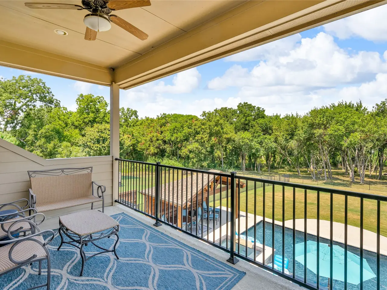Game room with covered balcony overlooking the lake