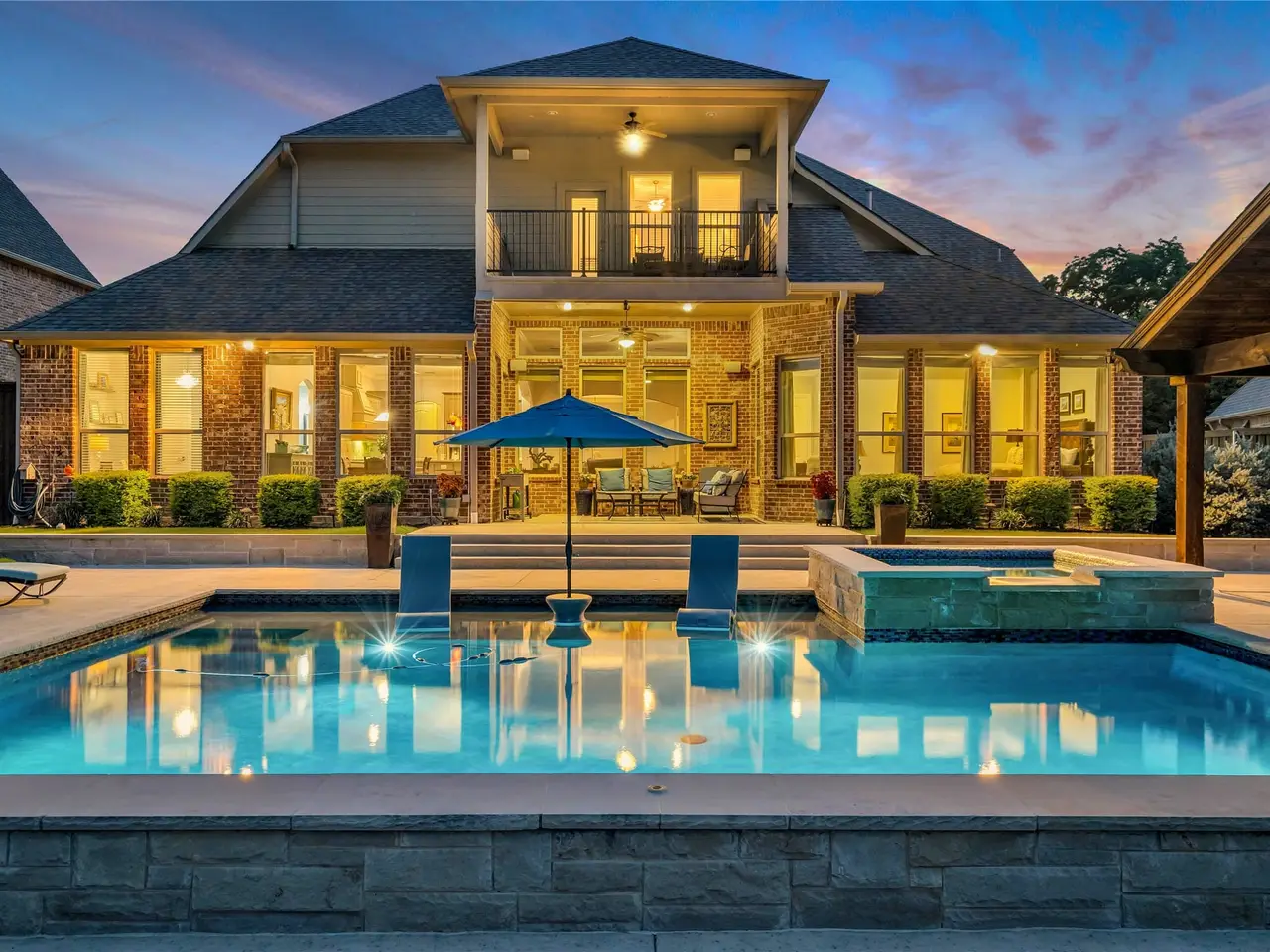 Resort-style backyard with saltwater pool, spa, and water features