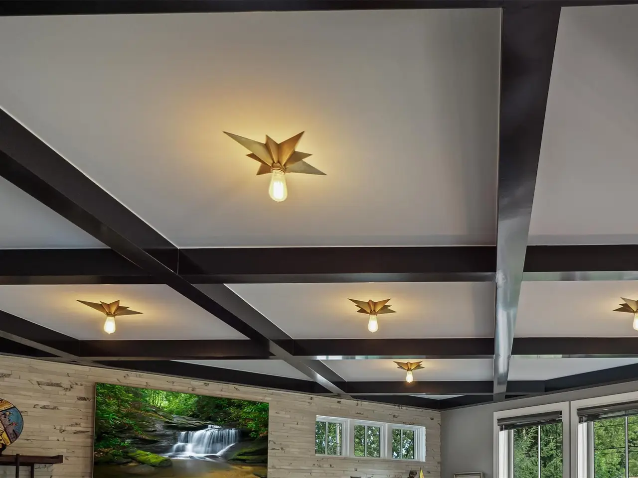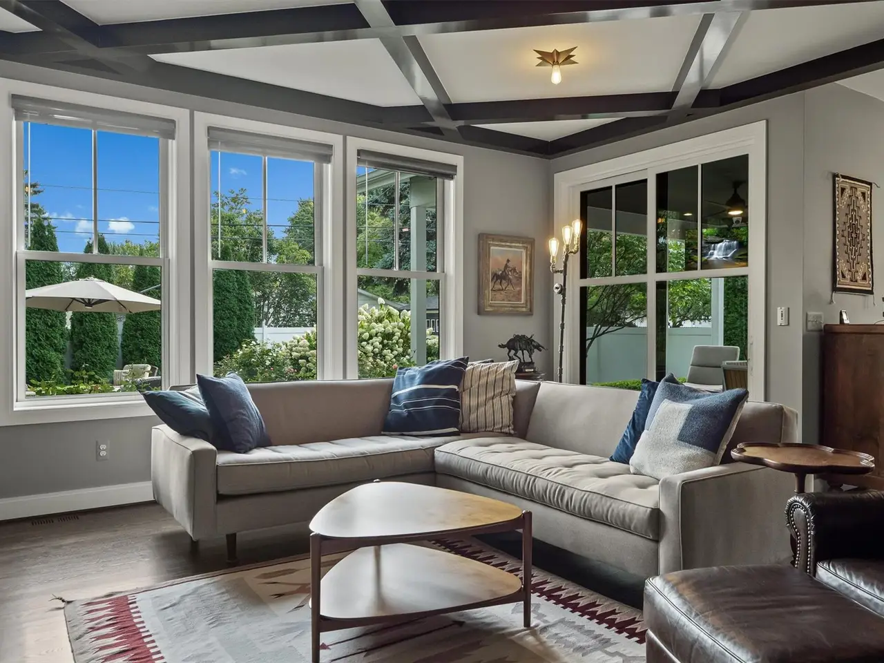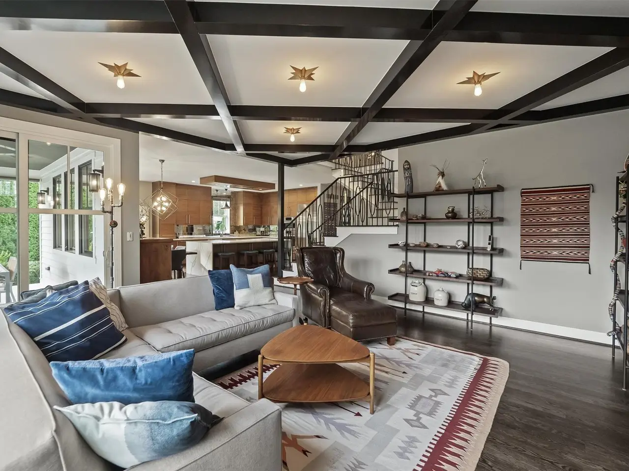 Living room with coffered ceiling and stone wall fireplace