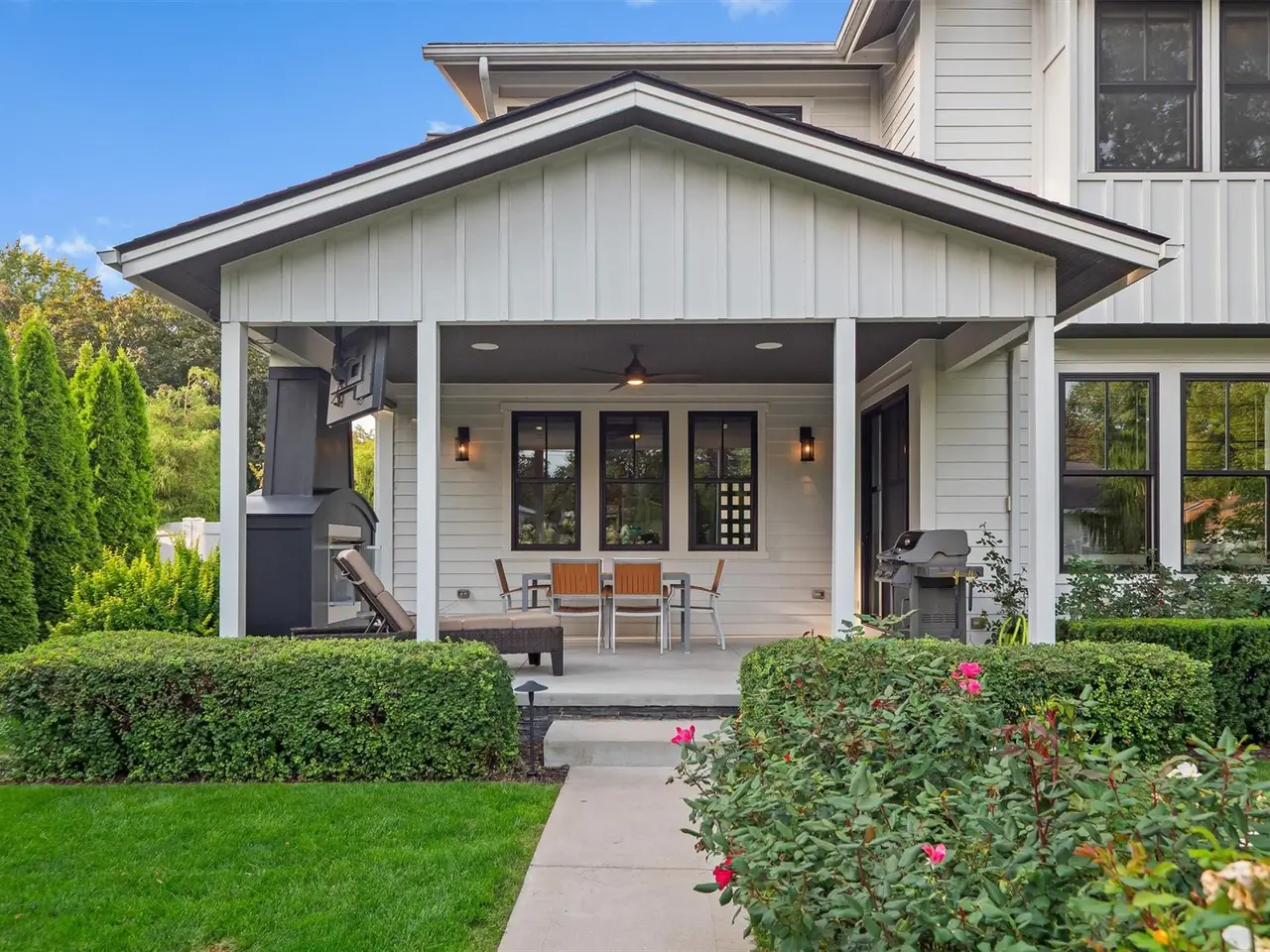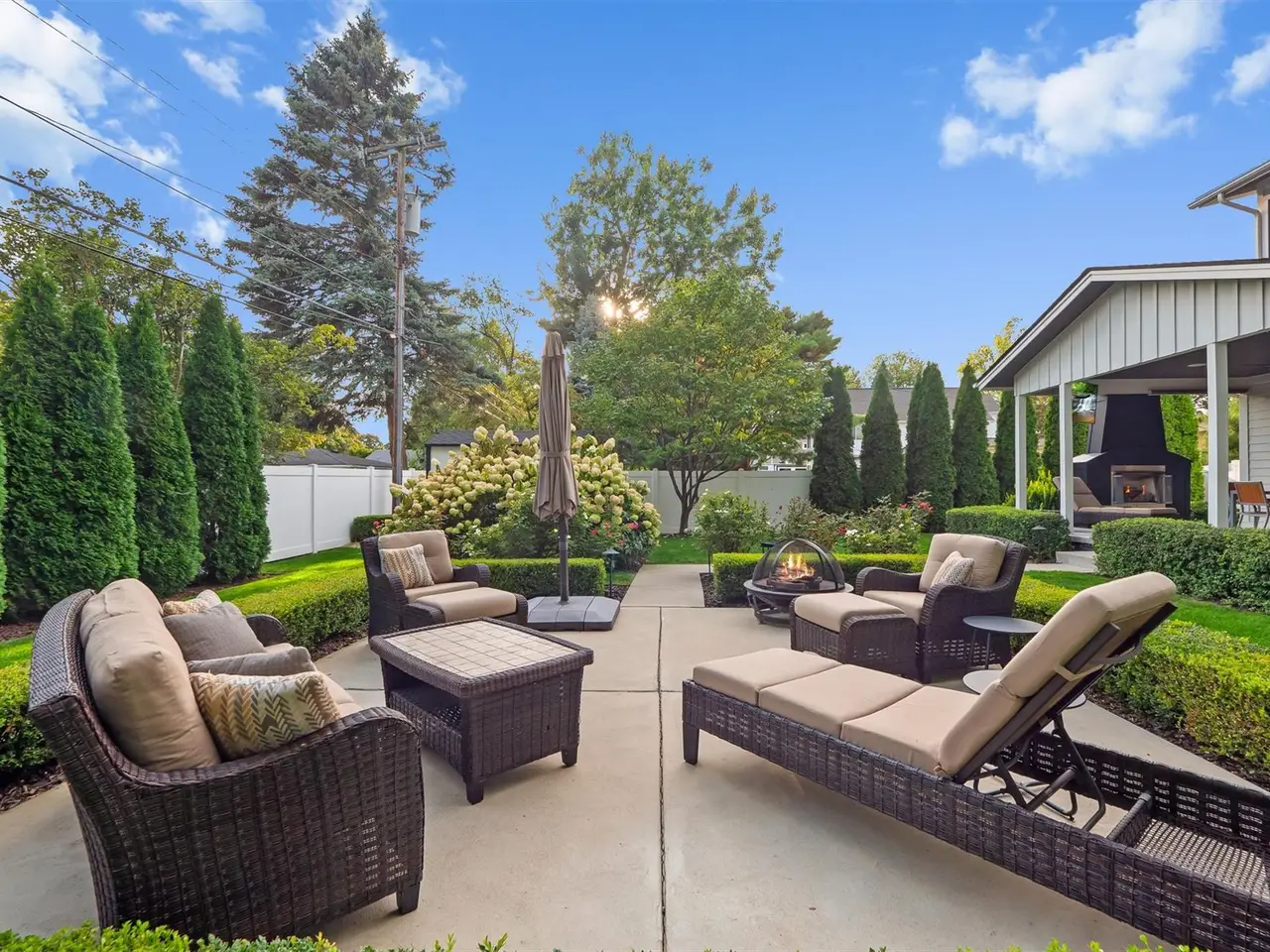 Outdoor fireplace and TV on covered patio