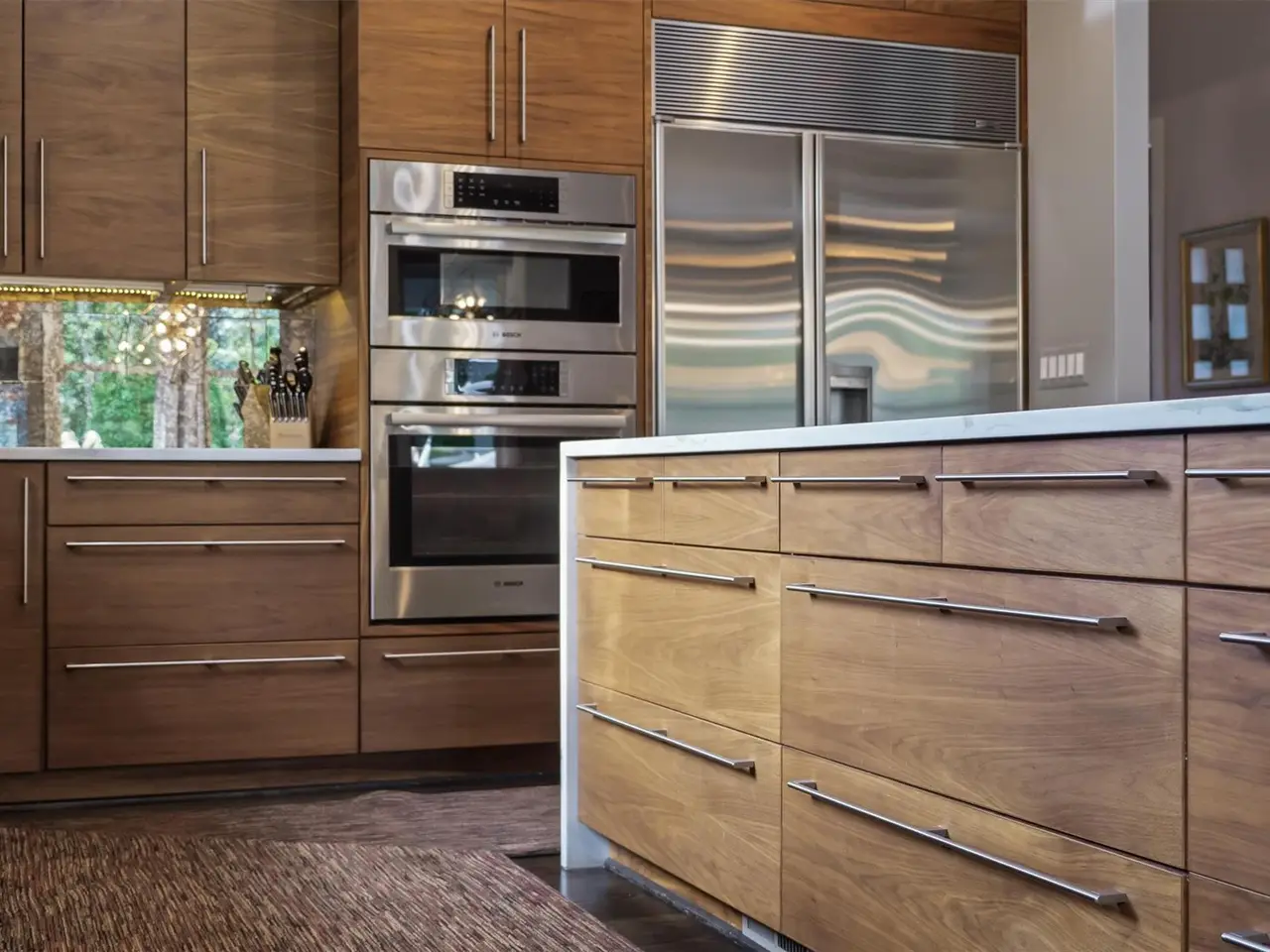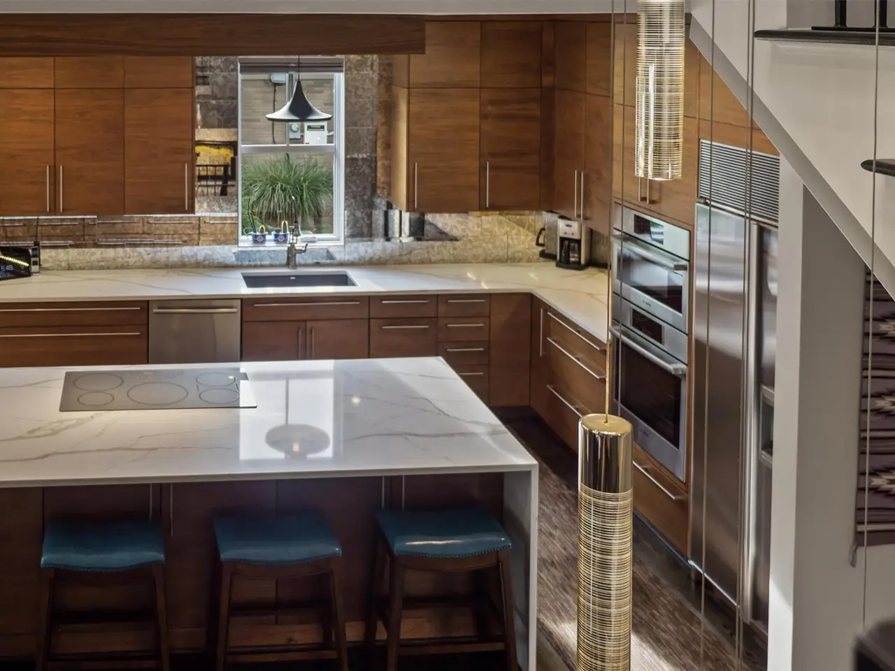 Gourmet kitchen with quartz waterfall island