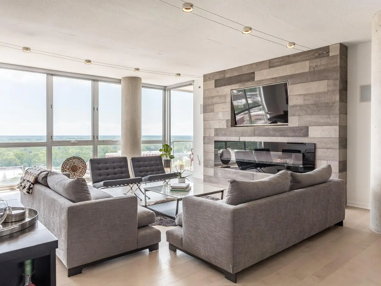Experience the epitome of luxury at The Fifth! This updated, Penthouse embodies sophistication with its expansive open layout and private balconies, providing an unparalleled vantage point for breathtaking sunrises and stunning panoramic views of the metro area including the iconic Detroit Skyline. The walls of windows infuse the space with natural light, beautifully highlighting the elegant hardwood floors and lofty ceilings throughout. Designed for the culinary enthusiast, the chef's kitchen is a masterpiece, featuring custom cabinetry, quartz countertops, premium stainless steel appliances, and a convenient bar seating area. The spacious primary suite includes a generous walk-in closet and an opulent bathroom, complete with a jetted tub, steam shower, and a double sink designer floating vanity. The second bedroom suite offers a private bath, while the third bedroom provides access to the second balcony, creating a serene retreat. Embrace the pinnacle of convenience with the Crestron home automation system, managing your blinds, lighting, temperature, and music with ease. Secure, heated garage parking for two vehicles is included, and residents benefit from doorman, on-site fitness center, and an array of shops and restaurants just steps away. Live the lifestyle you deserve at The Fifth.