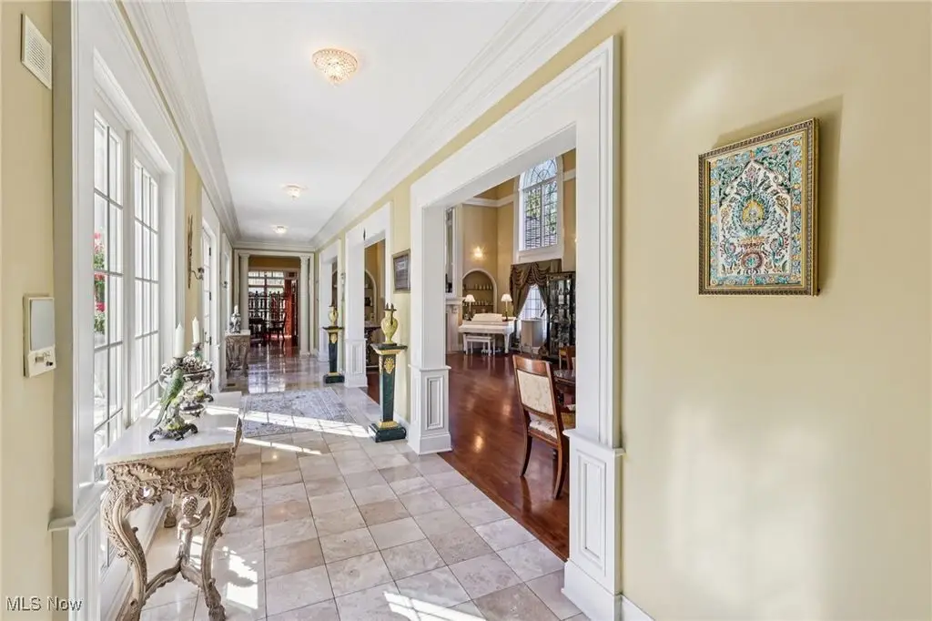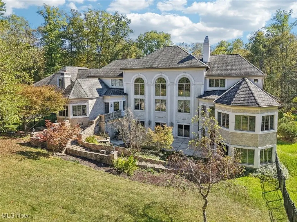 Stunning custom-built Scholz Design Brick Villa with 6+ bedrooms and 6.5 bathrooms situated on 5 gorgeous acres surrounded by lush mature plantings and landscaped gardens. The elegant iron forged gate opens to the tree-lined driveway that leads to an inviting courtyard with fountain and beautiful gardens. This exquisite home offers superior craftsmanship, imported tile, stone work, handcrafted millwork and stunning details throughout. The grand foyer opens to the most spectacular great room with 25' ceilings, hardwood floors, fireplace, custom moldings, archways and floor to ceiling Palladian windows. The heart of this home is the fabulous Cook's kitchen with granite counter tops, custom cabinetry, center island, breakfast bar and dinette area that is open to the family/hearth room with gas fireplace and extraordinary Turret style ceiling. Charming separate morning/bonus room as well that leads to attached laundry room. Large handsome cherry-stained library/den with custom shelving. First floor Owner's suite has a sitting room, walk-in closets, two vanities with hand painted sinks in the glamour bath. Elegant powder room and the 2nd full bathroom complete the first floor. The second floor features a graceful balcony overlooking the Great Room, loft area with skylights, private guest suite that includes a sitting room and full bath, four additional spacious bedrooms, and two more full baths. The walk-out lower level includes a theater area, recreation room with kitchenette, huge bonus room/bedroom/exercise room with glam full bath and sauna. The lower level opens to secluded multi-level brick patios with stunning waterfall and pond. This amazing property is situated on 5 fenced acres within 20 miles to downtown Cleveland.