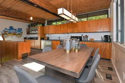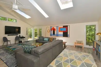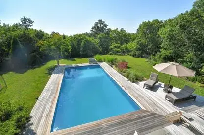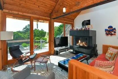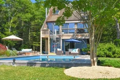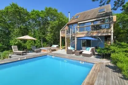 This private and recently renovated architectural marvel on nearly three acres, and adjacent to preserve, will surprise and delight you with its charm and unique setting. Entering the first floor of this three-story home you will find a spacious living room with two bedrooms and bath -- up to the 2nd floor where you'll love the open living/dining and kitchen area with fireplace as well as a convenient deck looking out to the beautifully landscaped grounds and oversized pool. From here you can enjoy year round sunsets from home, pool or hot tub! The master suite and bath on the 3rd floor are divine and also include a cozy deck with distant water views of Peconic Bay. There are koi ponds with waterfall to enchant you and nearby walking trails for the nature lover in you. New furnishings plus great mid-century to modern art will add to your great enjoyment of this unique artist's home. Ten minutes to heart of Village. Listing ID#: 756584.