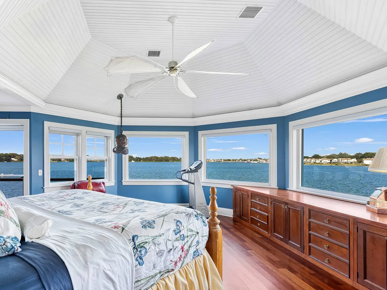 Waterfront boaters' paradise with a full-service deep-water dock and access to Sag Harbor Bay awaits your arrival. This Nautical property with a sparkling waterside pool and views over the harbor to Sag Harbor Village, offers 4 bedrooms, 4 baths, and water views from every room. Bright and airy, this open concept first-level floor plan includes a living room, chef's kitchen, dining area, and private den ~ media room with an en suite bedroom option. The second floor has a very spacious primary suite, 2 oversized walk-in closets, and gorgeous water views from its waterside balcony. The en suite guest bedroom is also spacious, with a waterside balcony overlooking this lush waterfront property. Two additional bedrooms are offered with this wonderful property design. A renovated beach Cabana is located perfectly off the expansive back patio deck, along with many sun-drenched lounge areas. This spectacular property is surrounded by 2 waterfront bulkheads and is well-appointed for entertaining. Featuring an outdoor bar pavilion, a saltwater , solar pool, and one of the longest docks permitted in Sag Harbor. Sail your yacht for the most incredible westerly sunsets over Foster Memorial Long Beach or under the bridge into Sag Harbor Village with award-winning restaurants and Marinas. Visit Bay Street Theater and community cultural center or take a stroll down the historic Main Street of this Old Whaling Village. This waterfront property is a sublime retreat on the peninsula of Bay Point and is truly a rare gem and one-of-a-kind in Sag Harbor.