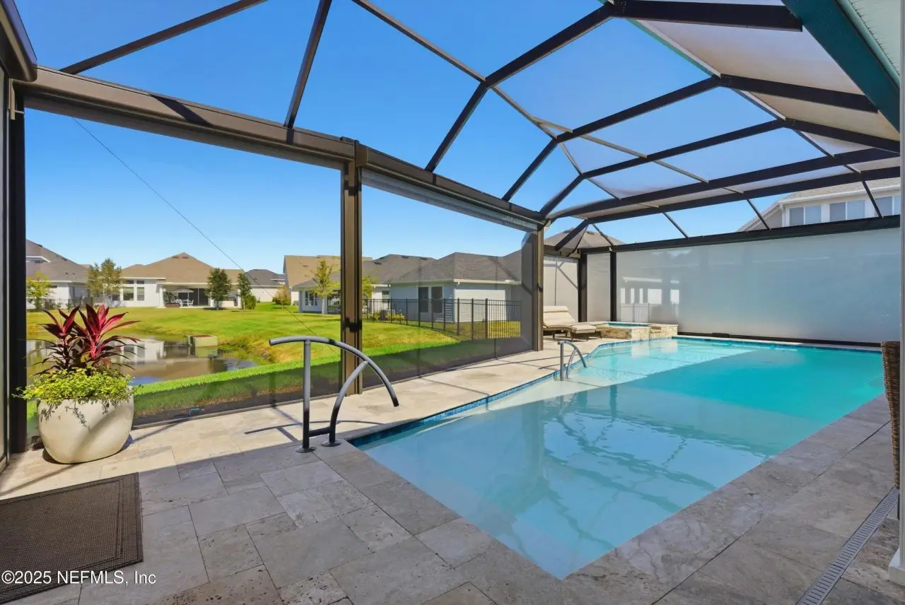 Step into luxury living with this exquisite 4-bedroom, 3-bathroom waterfront, pool home in the prestigious community of Shearwater. This meticulously maintained home features an open floor plan with a gourmet kitchen, cafe area and a private office. Theres plenty of room for all your toys in the oversized tandem 4 car garage. The gourmet kitchen is a haven for culinary enthusiasts, featuring quartz counter tops, stainless steel appliances, double ovens, a gas cooktop, and large island with seating. The kitchen flows seamlessly into the family room and cafe area; perfect for entertaining. Sliding glass doors open to an expansive screened outdoor living spaced, complete with a heated saltwater pool and spa, and scenic views of the pond. Retractable shades in the pool area provide ultimate swimming privacy when desired. The primary suite includes a spa-like bathroom complete with an oversized shower, dual vanities and a walk-in closet with custom built ins. Let's not forget you can watch the game or movie in your private media room. Additional highlights include three secondary bedrooms, and an array of design upgrades throughout. Shearwater is conveniently located near shopping, dining, and top-rated schools. Community amenities include: a clubhouse, splash park, gym, swimming pools, nature trails, lazy river, a kayak launch and much more. Don't miss the opportunity to make this extraordinary property your new home!**Ring doorbell, cabinets and refrigerator in the garage do not convey. **